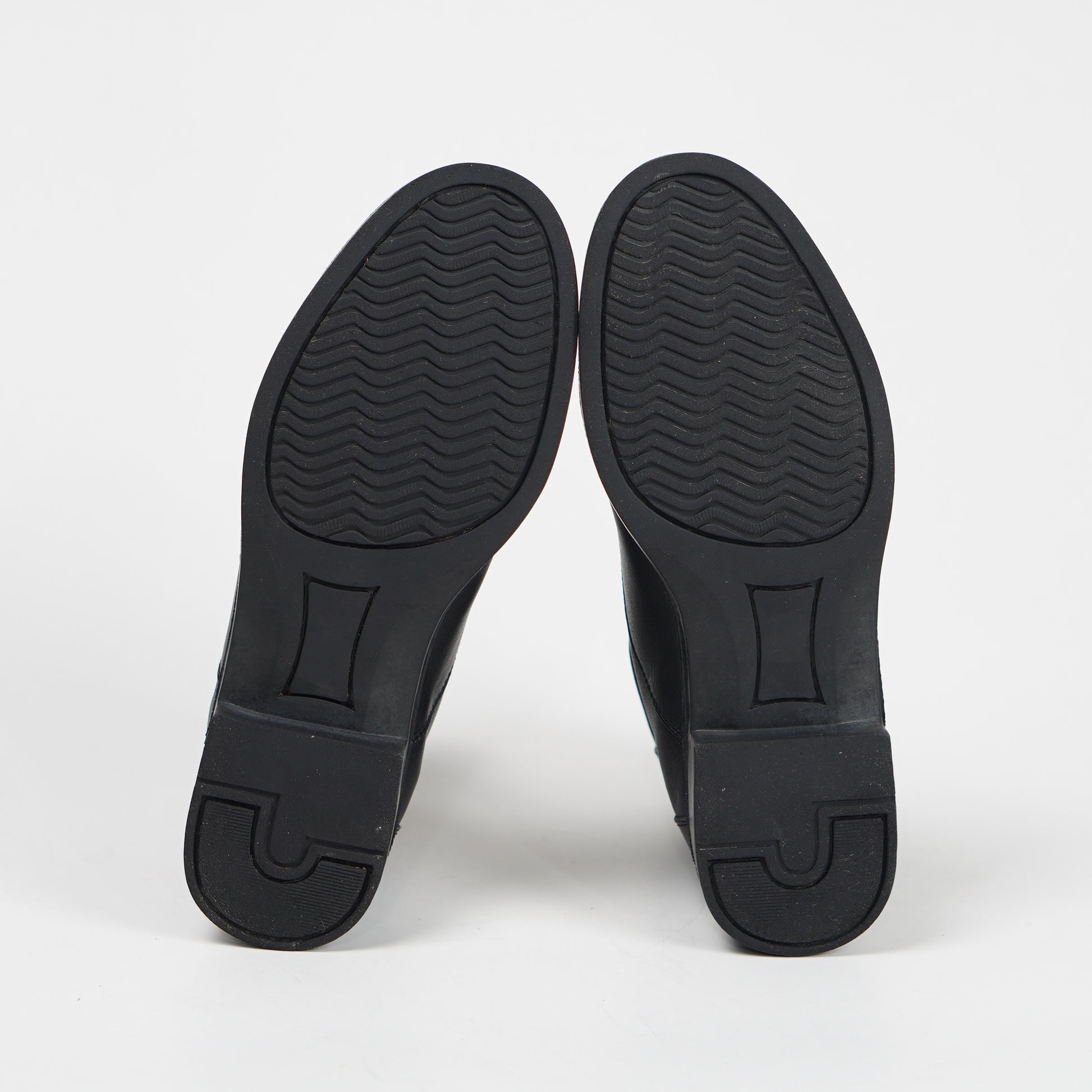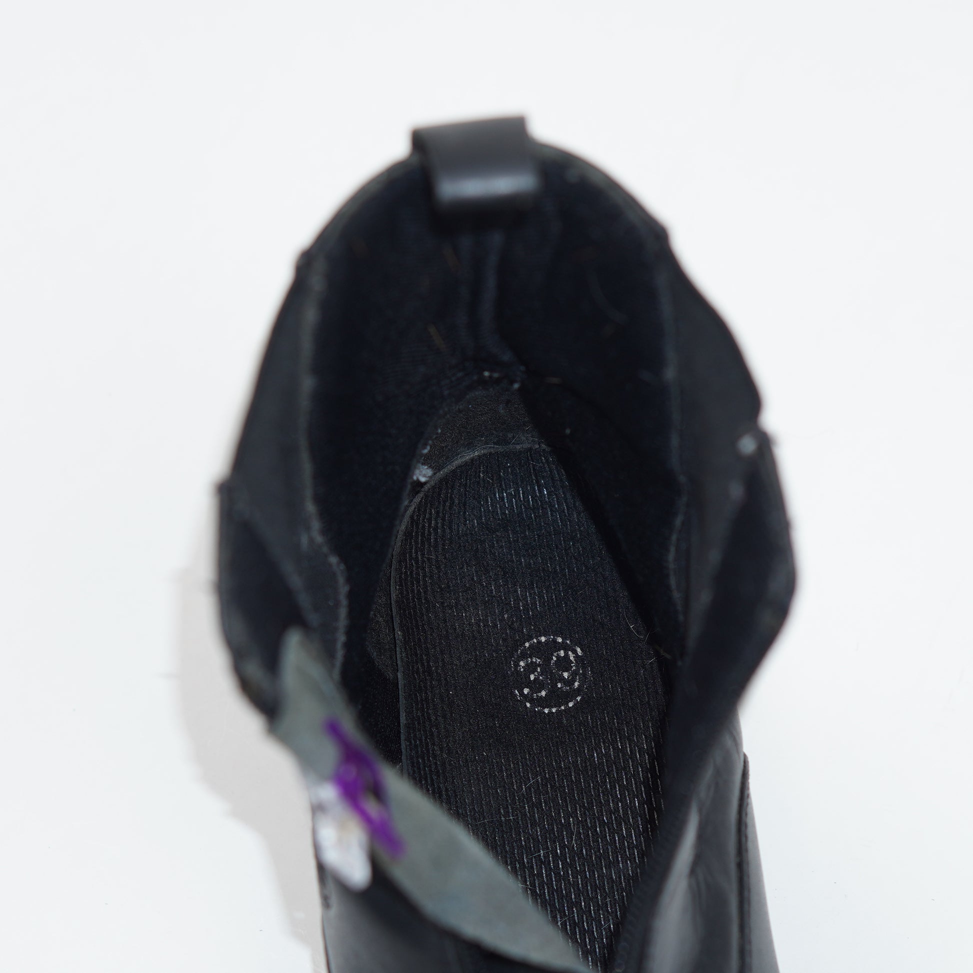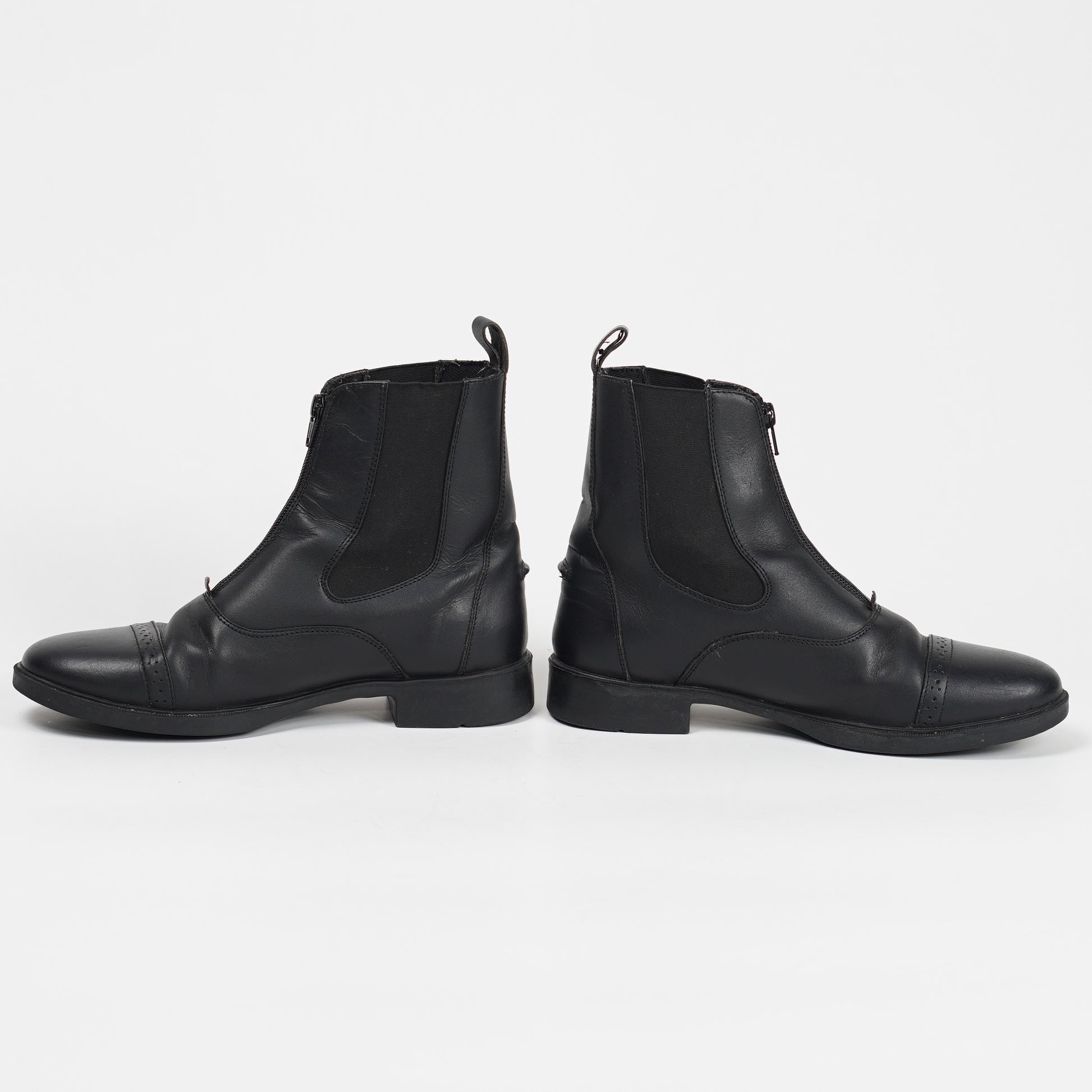 Svarta ridskor med dragkedja framtill och sporrstöd på hälen från okänd tillverkare.