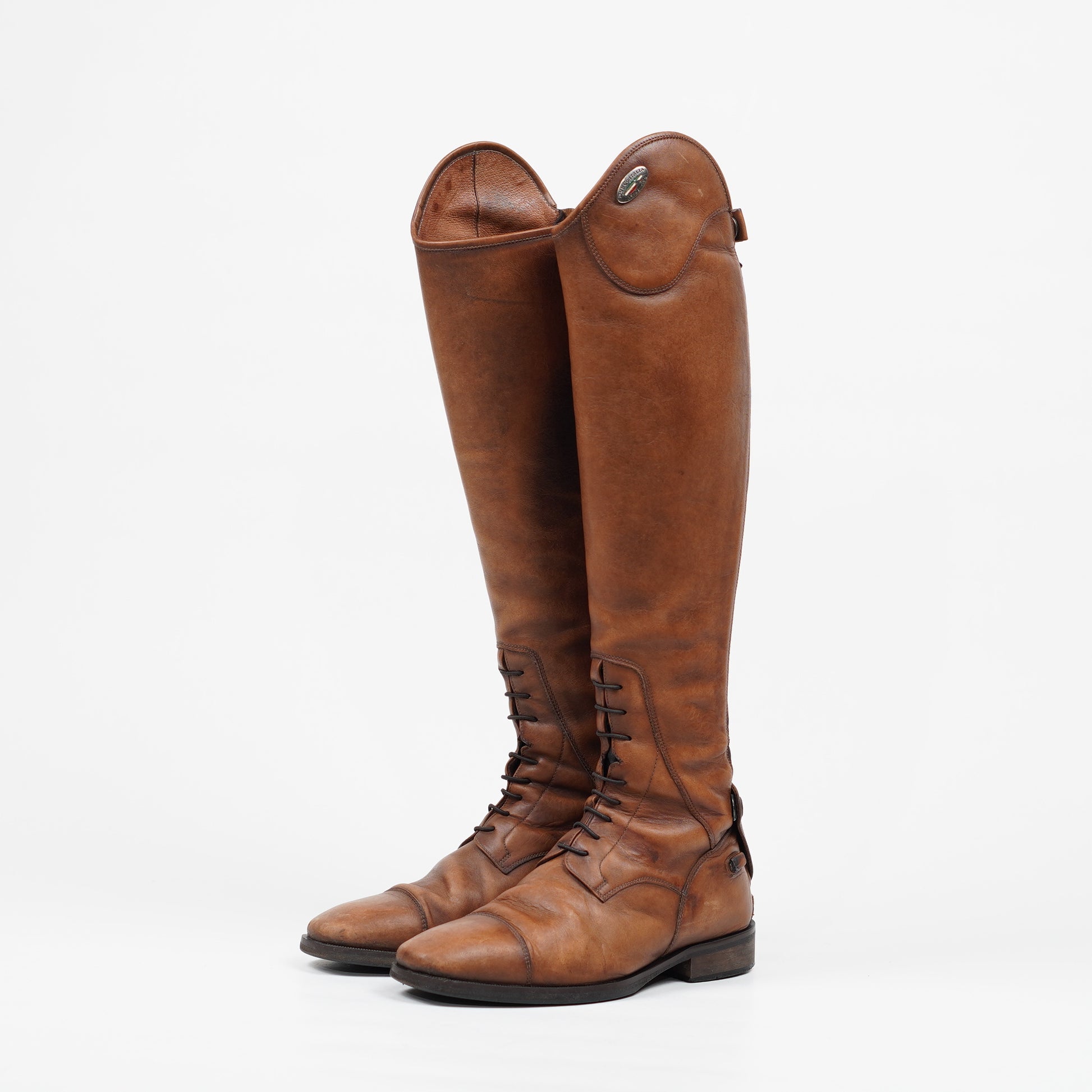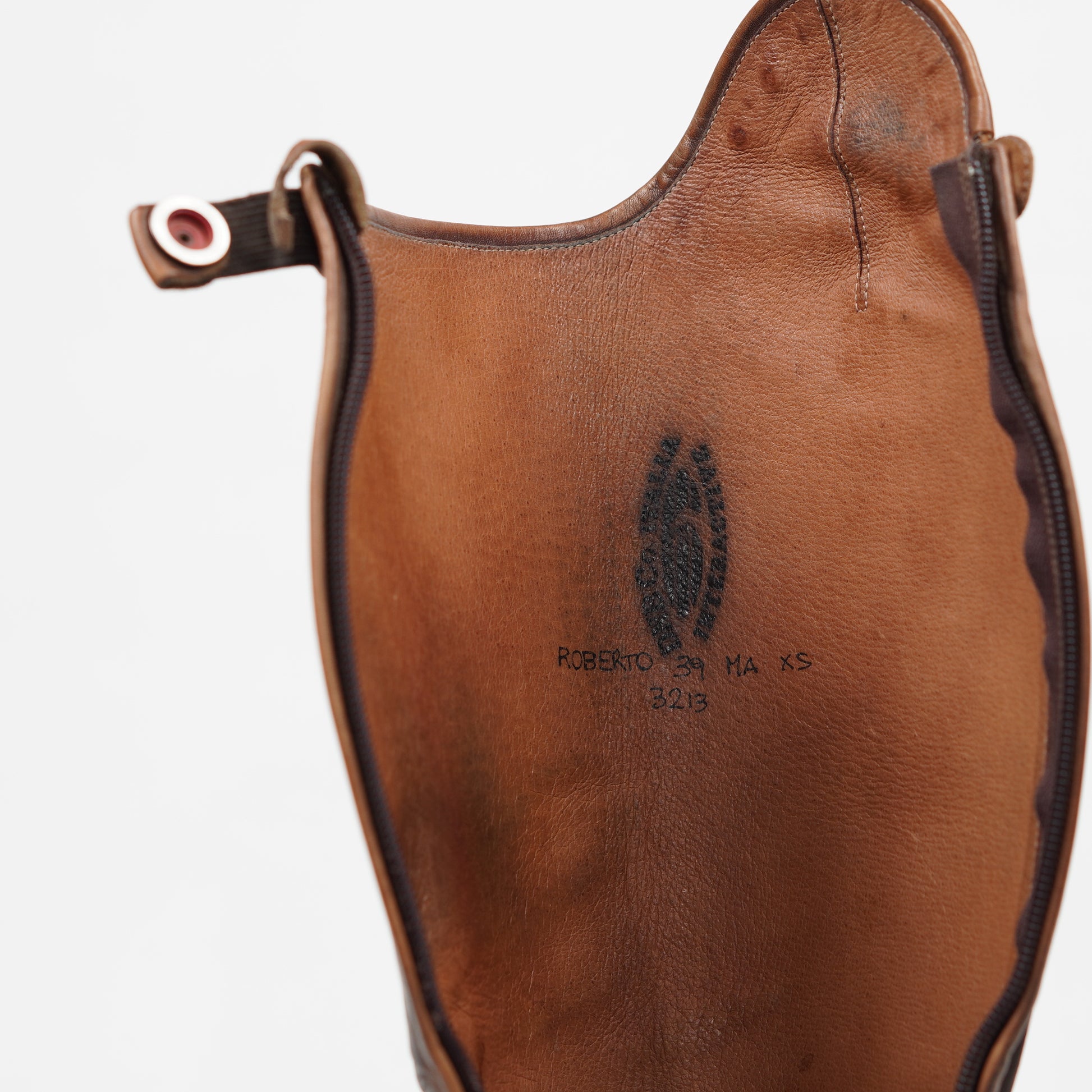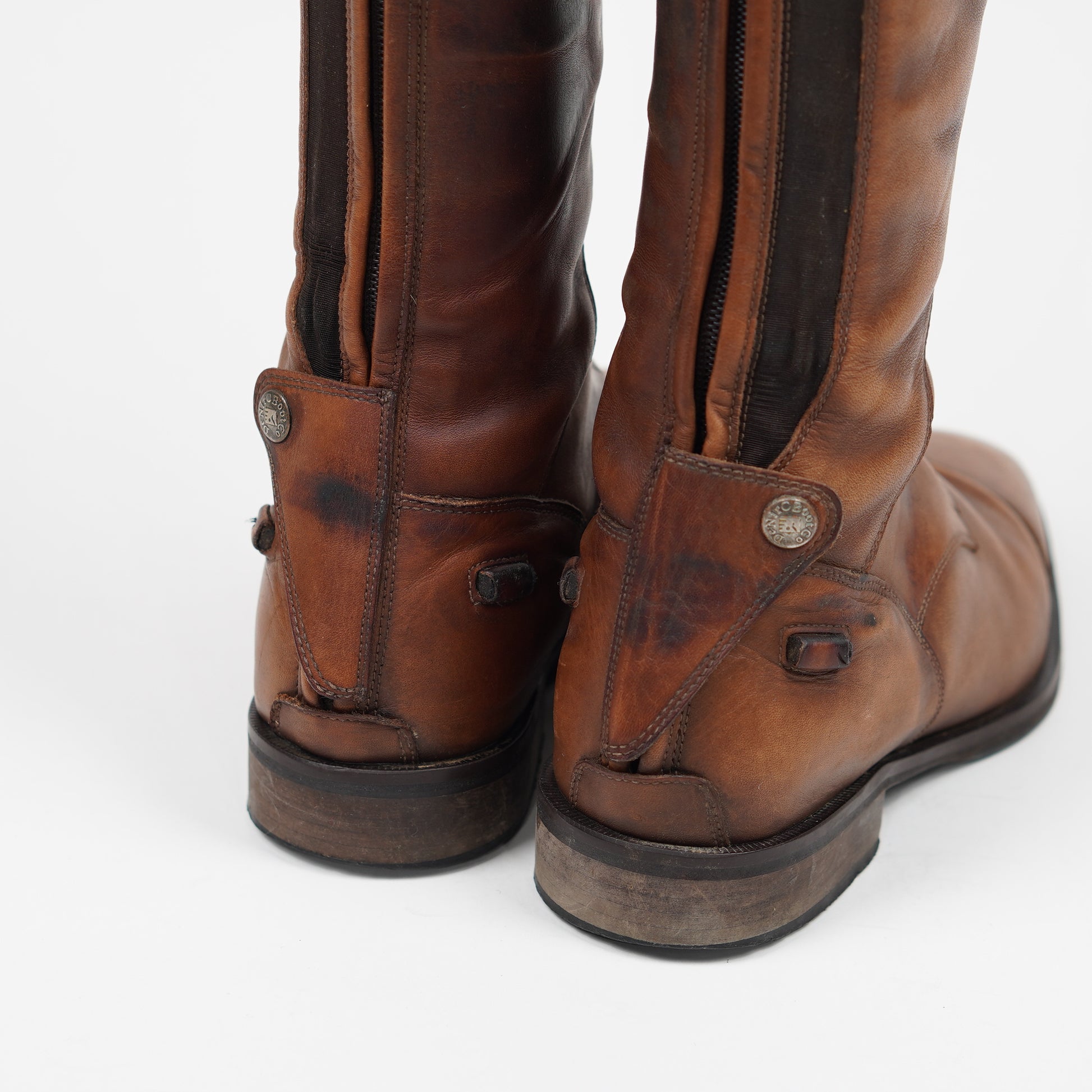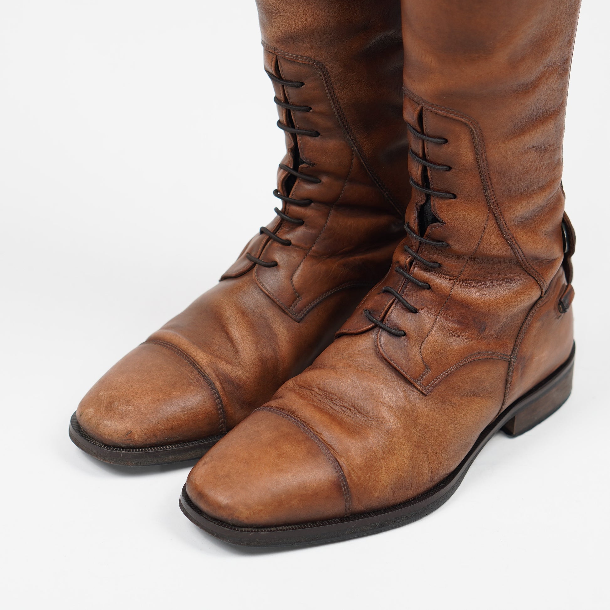 Ljusbruna ridstövlar "Roberto" med elastisk snörning fram och dragkedja bak från DeNiro. Stövlarna är tydligt använda och strukturen på sulan är något bortnött, se bilder, men i övrigt okej skick.