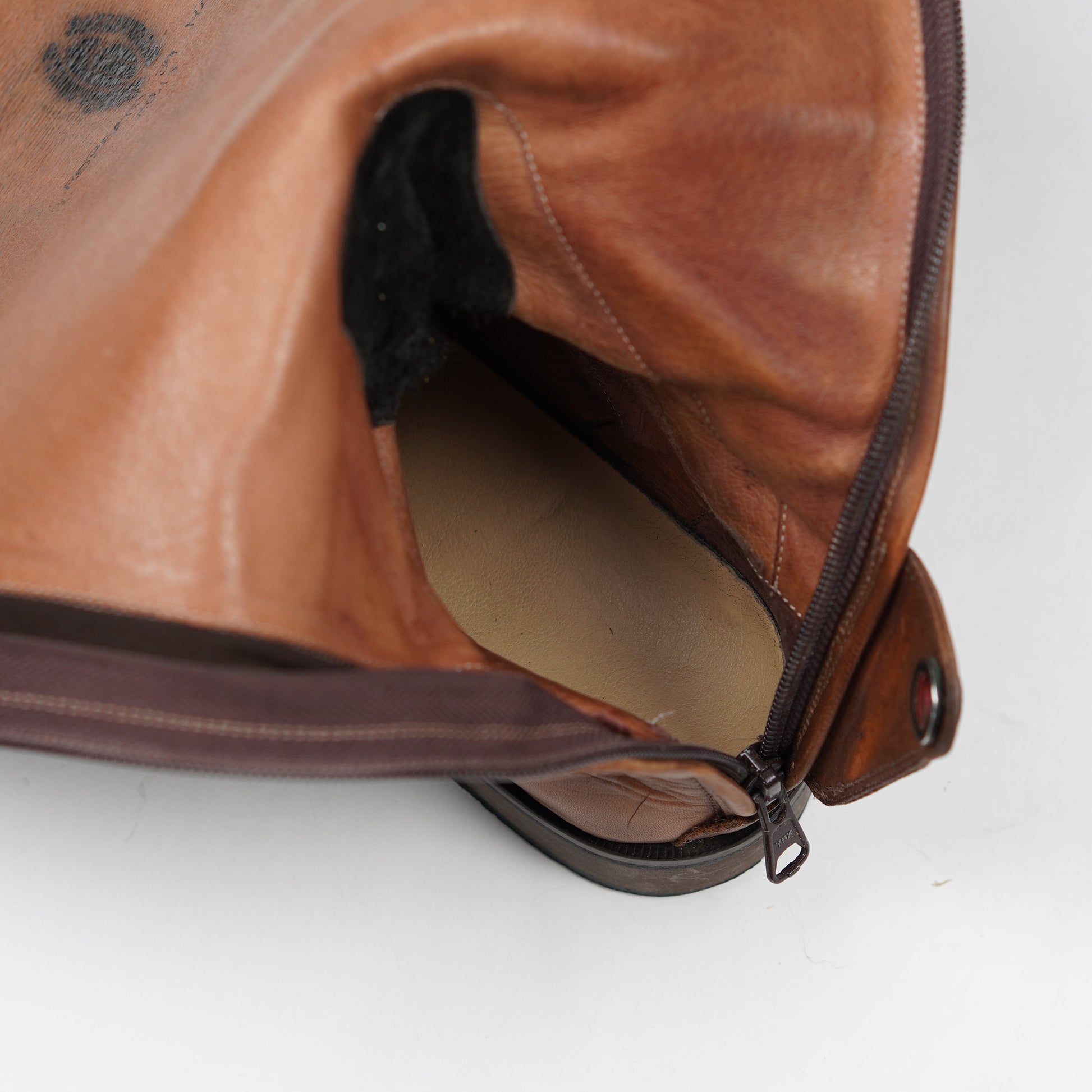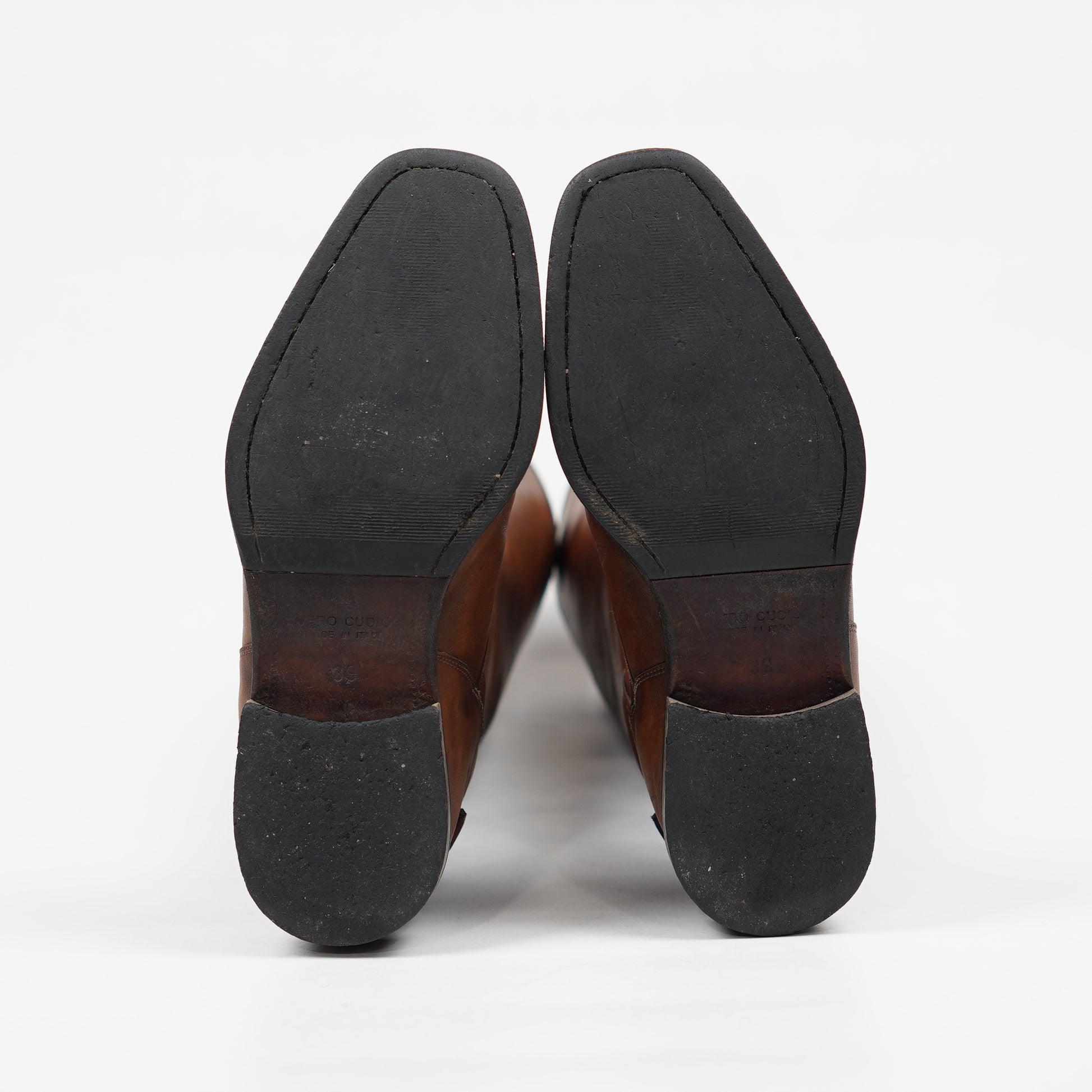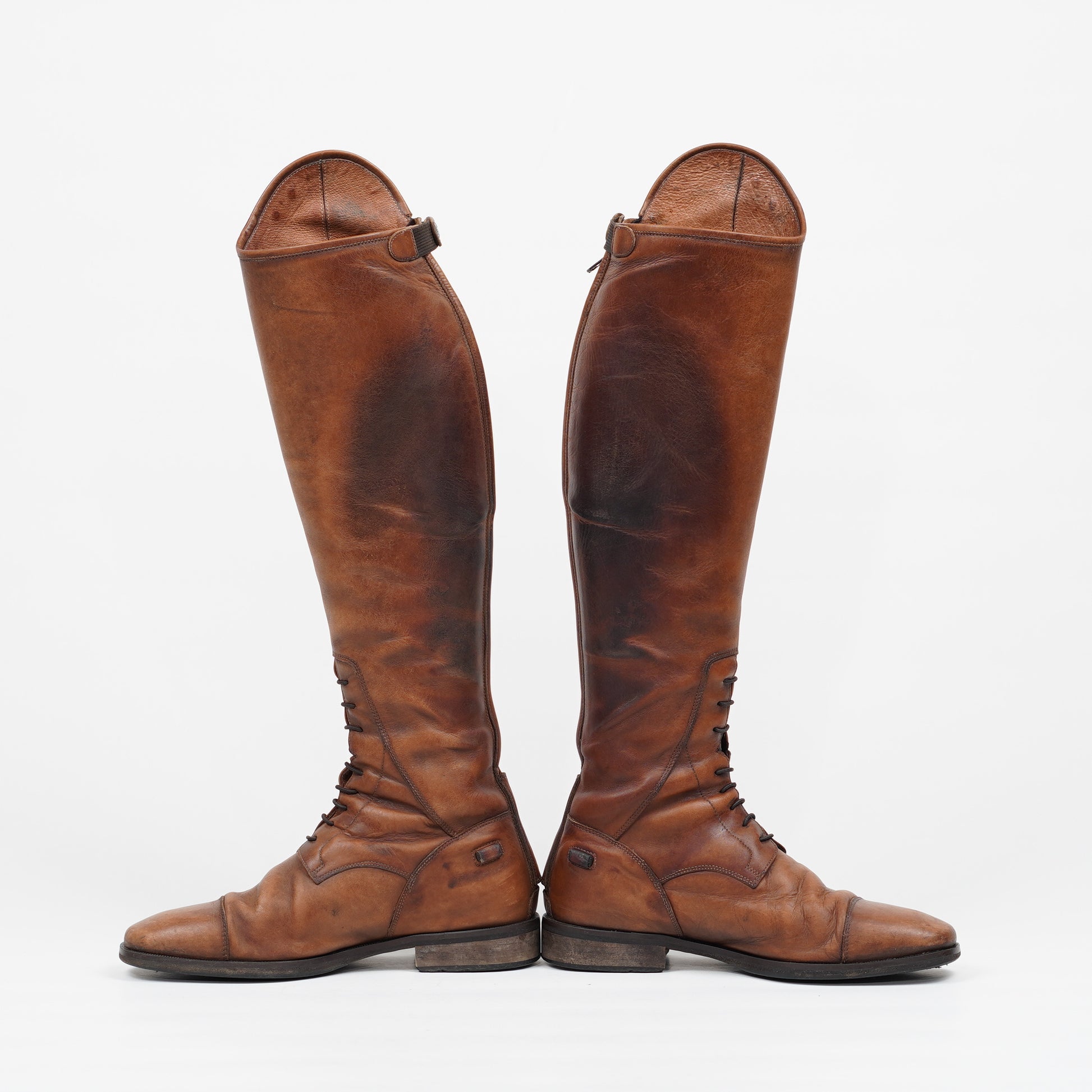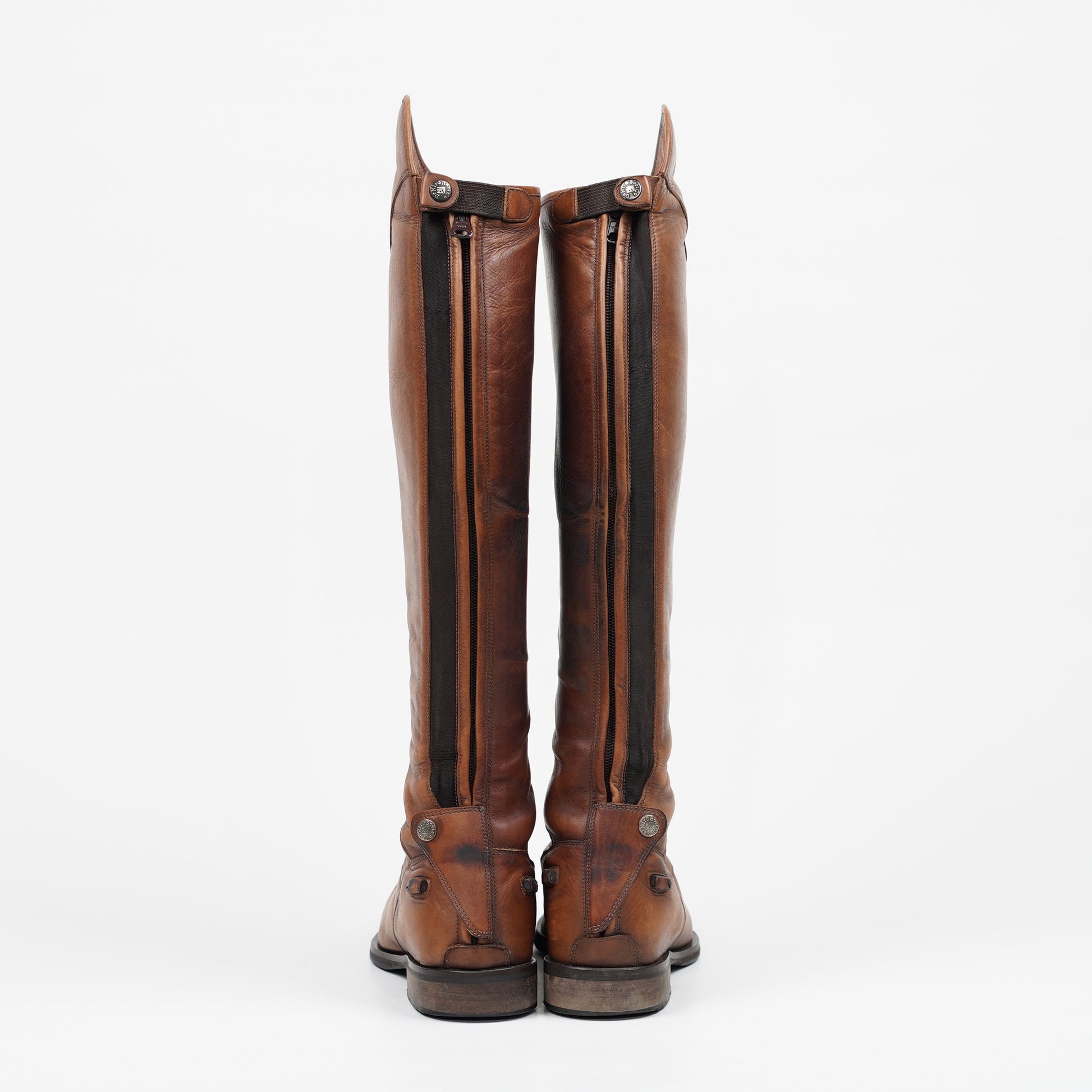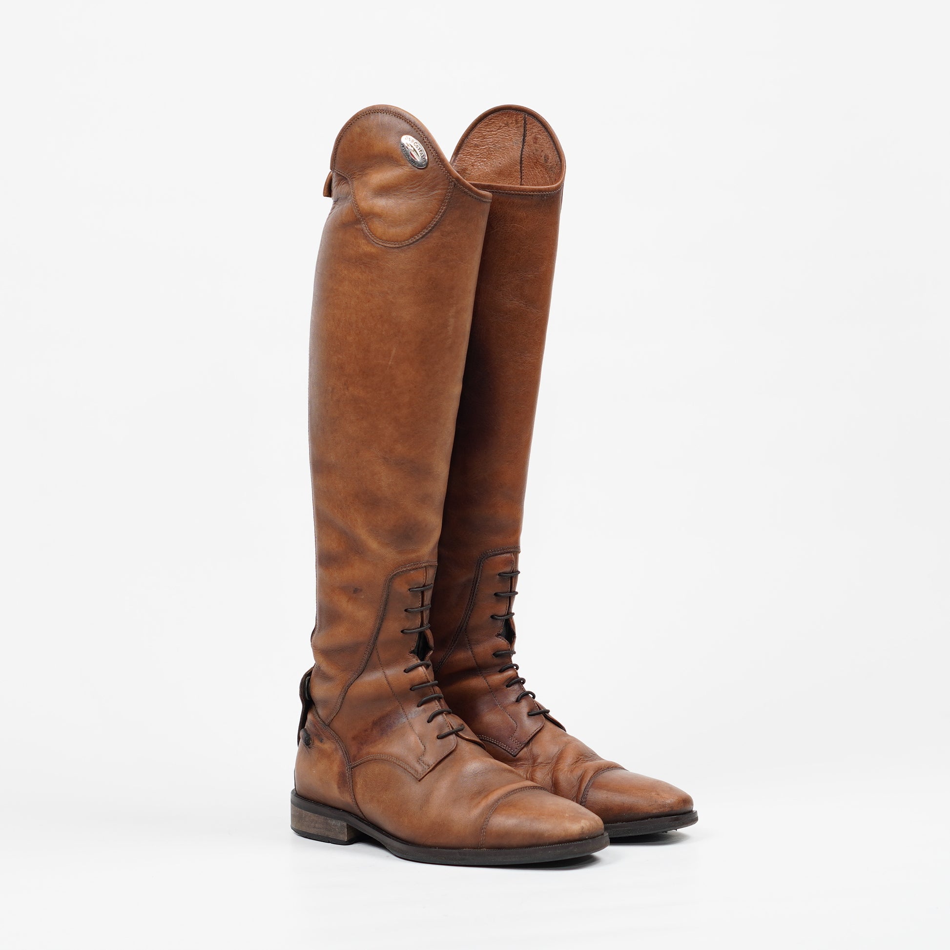 Ljusbruna ridstövlar "Roberto" med elastisk snörning fram och dragkedja bak från DeNiro. Stövlarna är tydligt använda och strukturen på sulan är något bortnött, se bilder, men i övrigt okej skick.