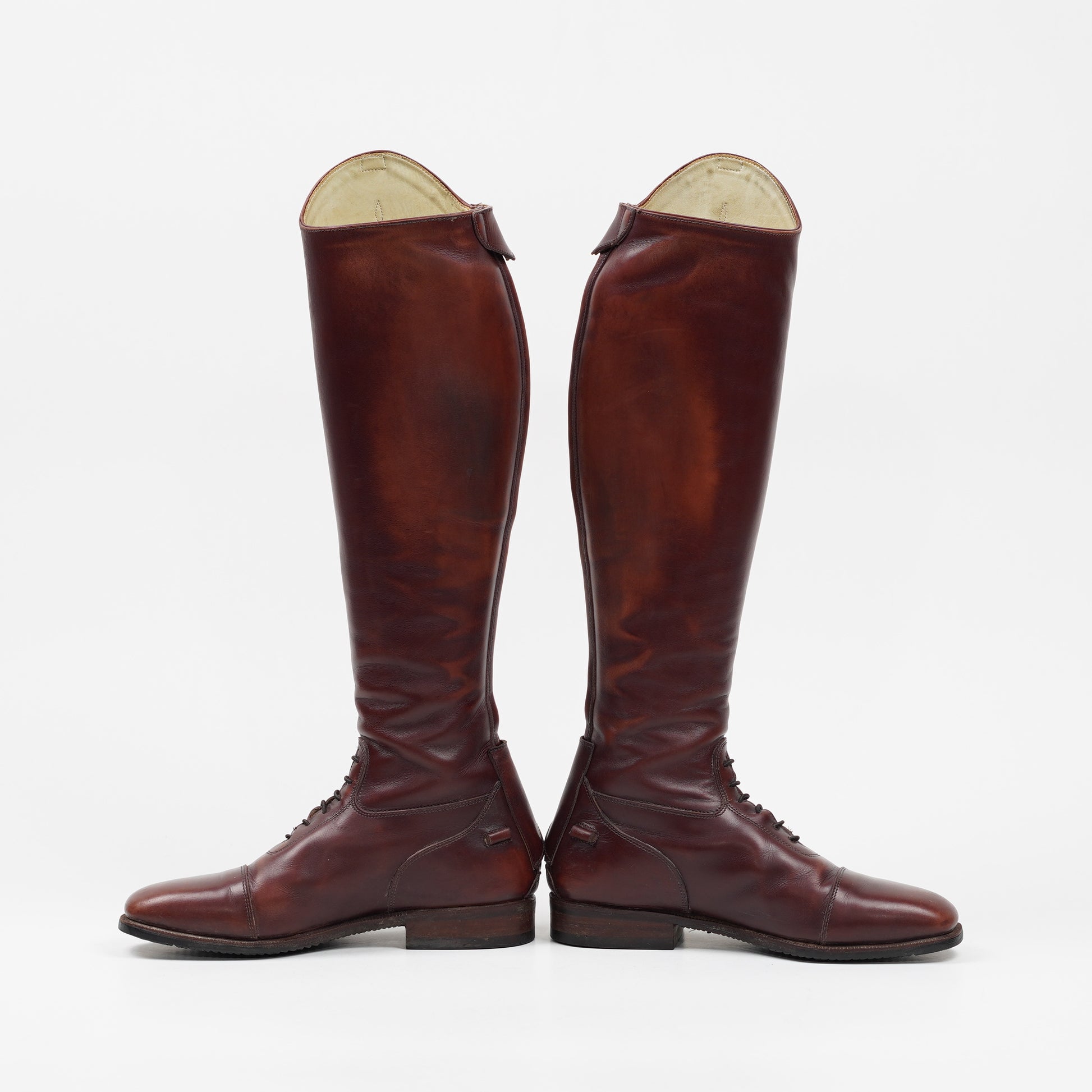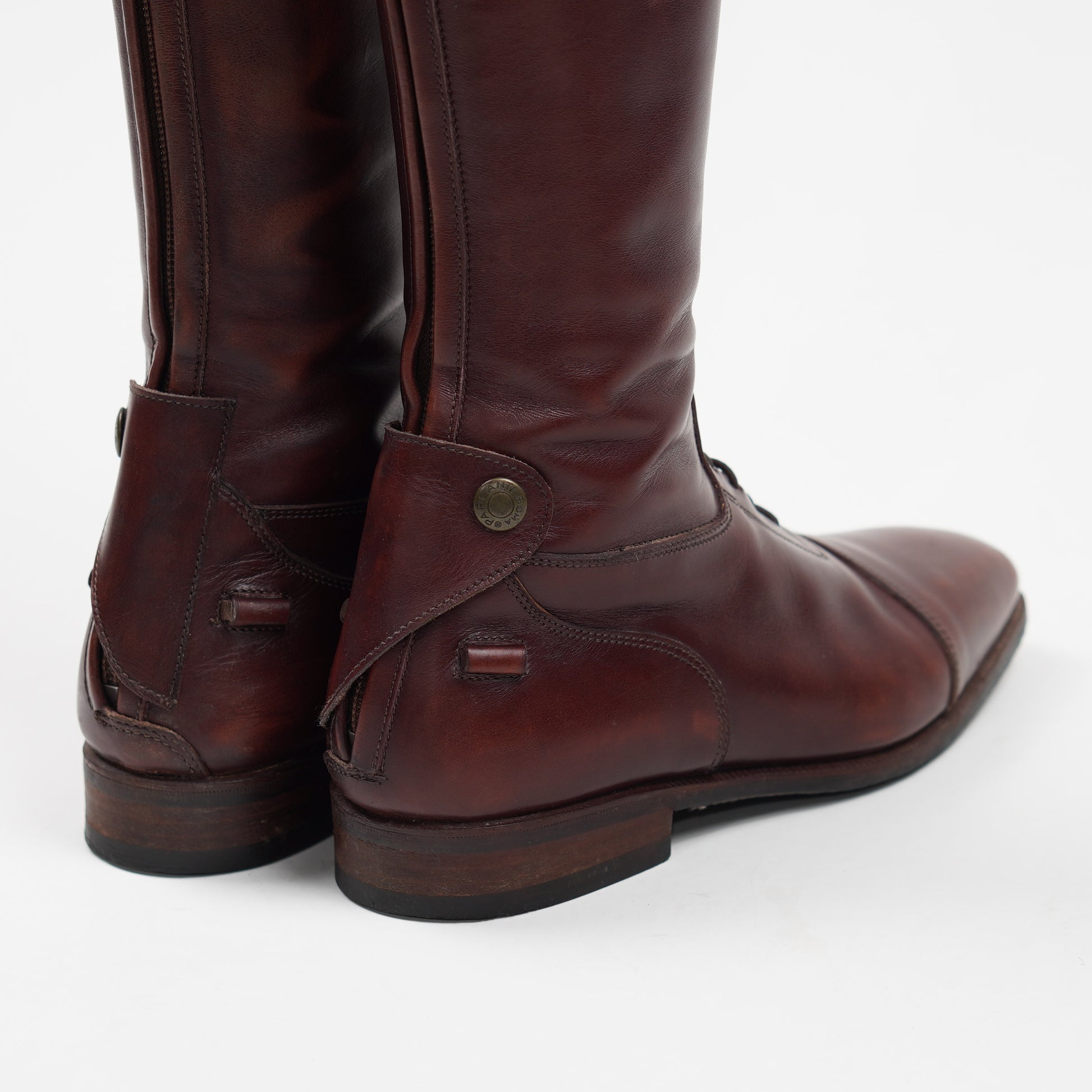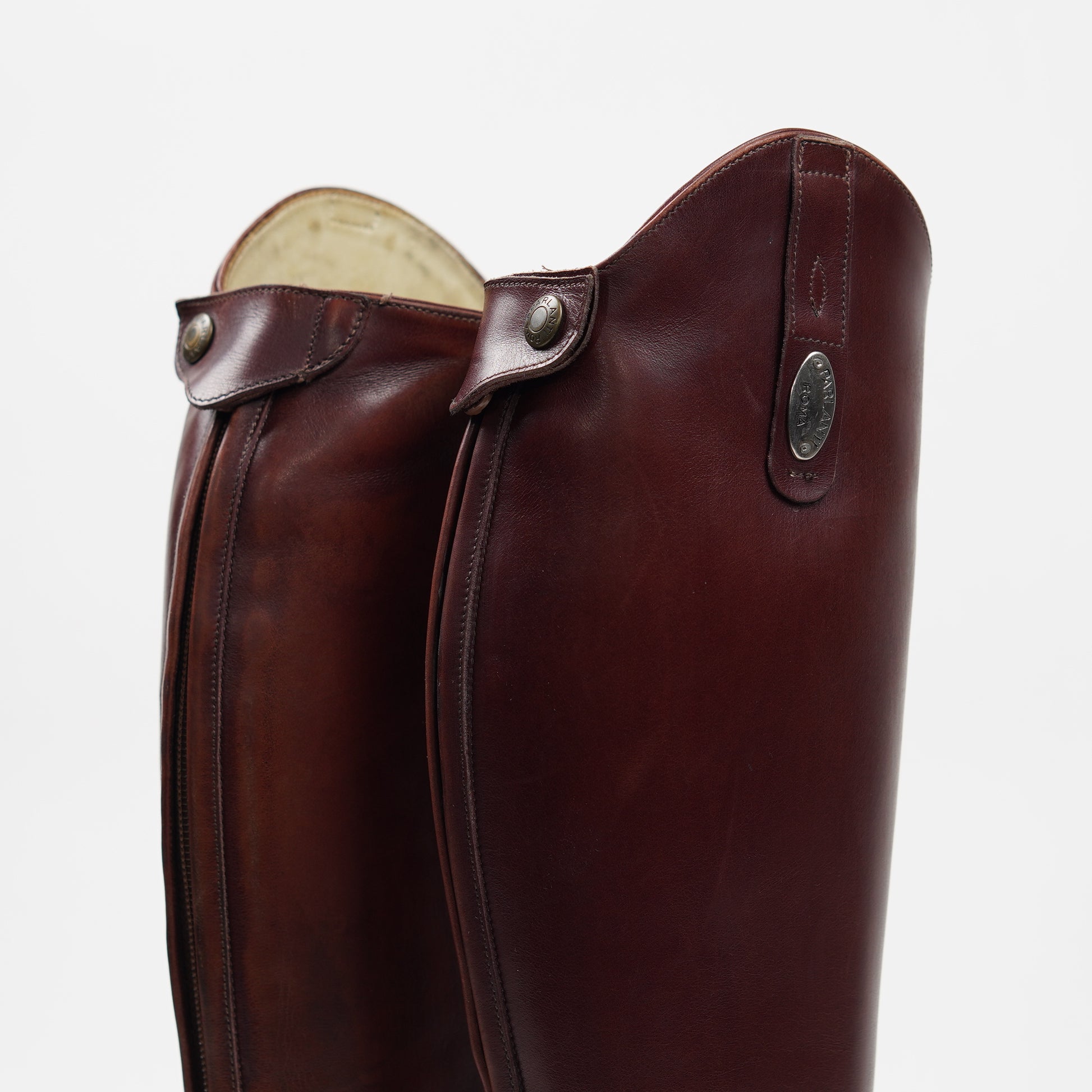 Fina ridstövlar från Parlanti Roma i brunt läder med röd ton. Stövlarna har snörning fram, dragkedja bak och sporrhållare på varsin sida om hälen. Använda, men väl omhändertagna. Stövlarna saknar storlek men vi uppskattar dem till storlek 38.