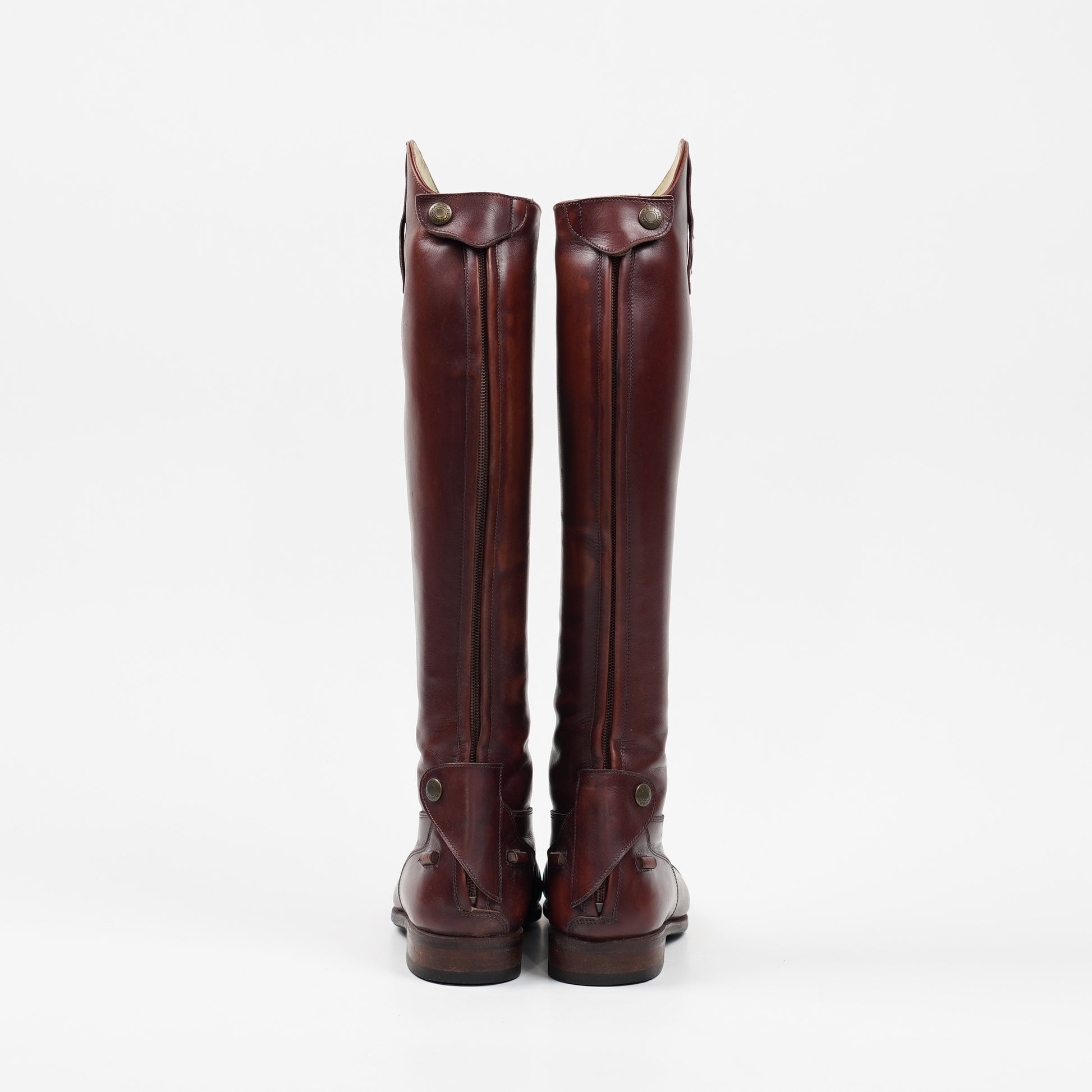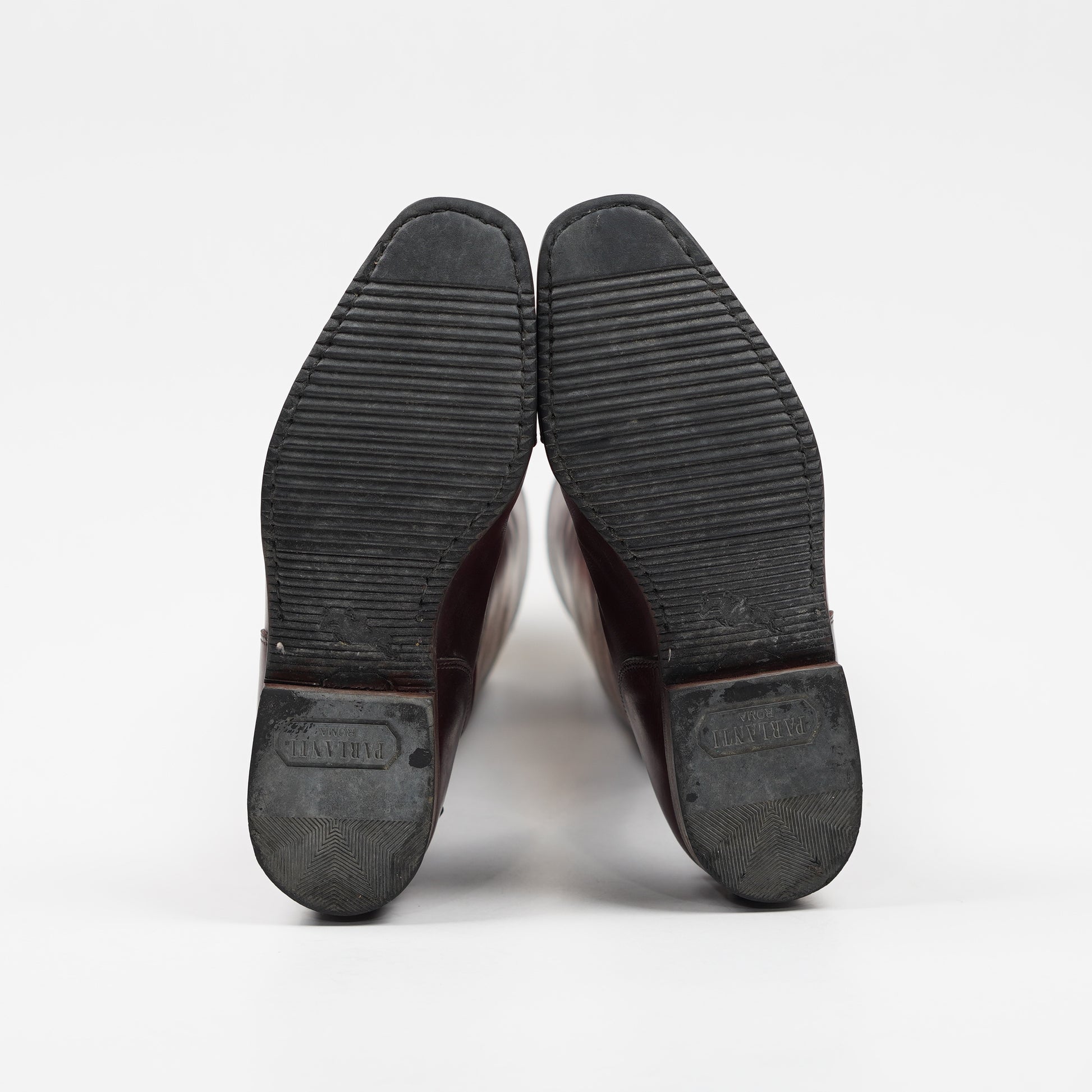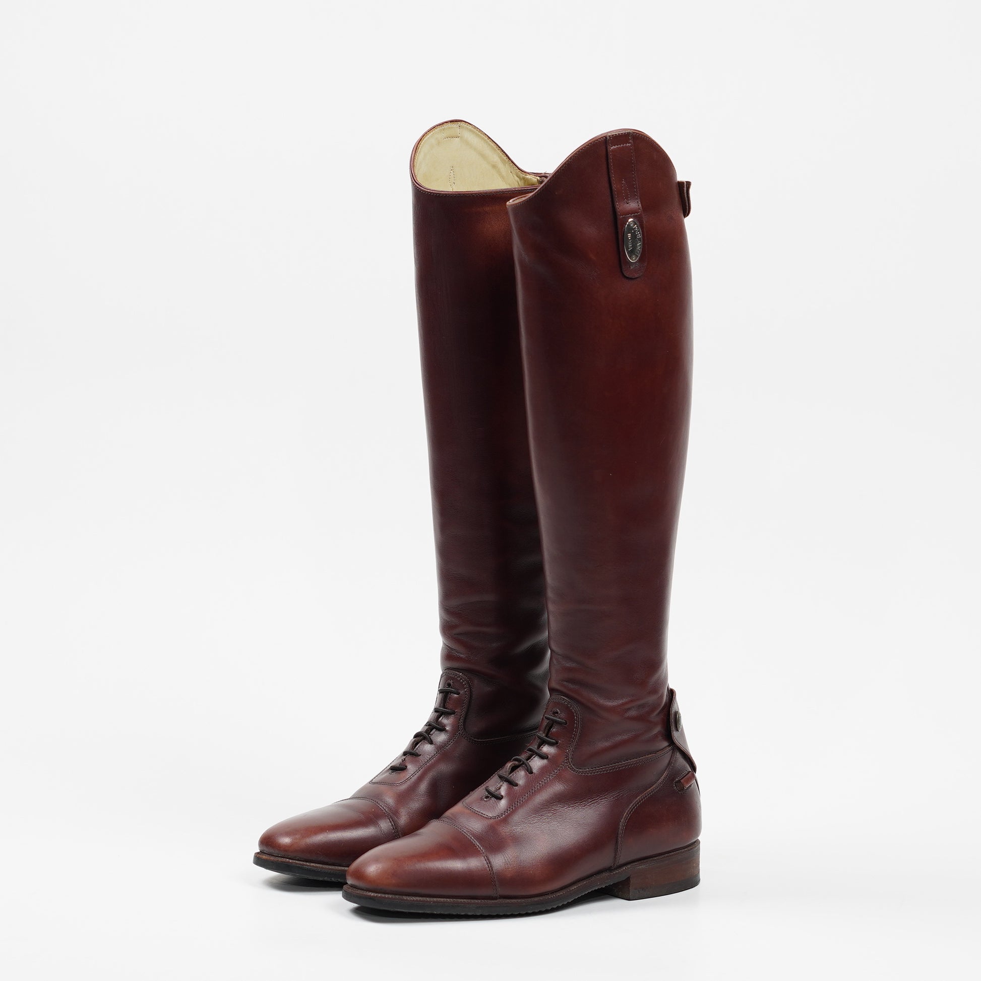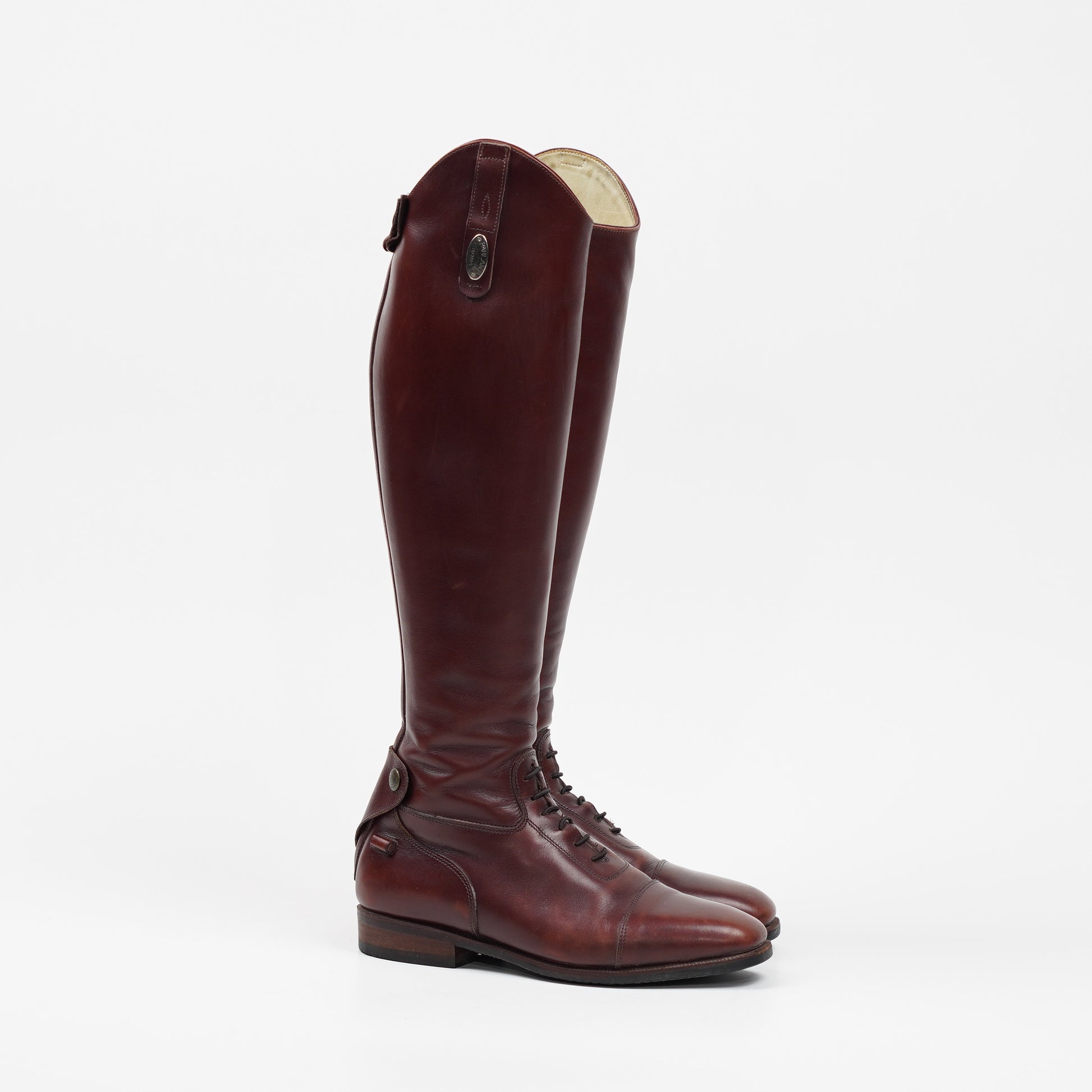 Fina ridstövlar från Parlanti Roma i brunt läder med röd ton. Stövlarna har snörning fram, dragkedja bak och sporrhållare på varsin sida om hälen. Använda, men väl omhändertagna. Stövlarna saknar storlek men vi uppskattar dem till storlek 38.