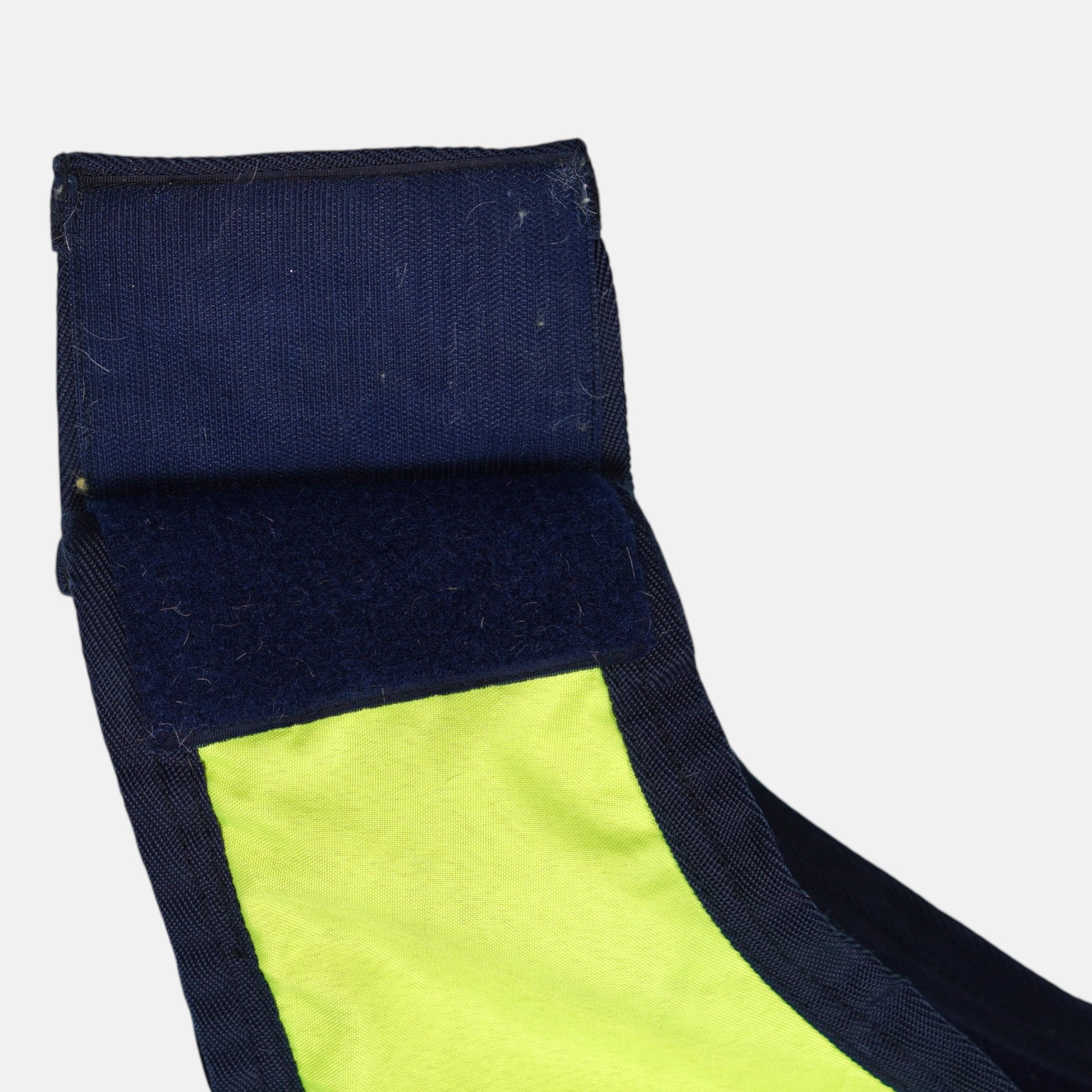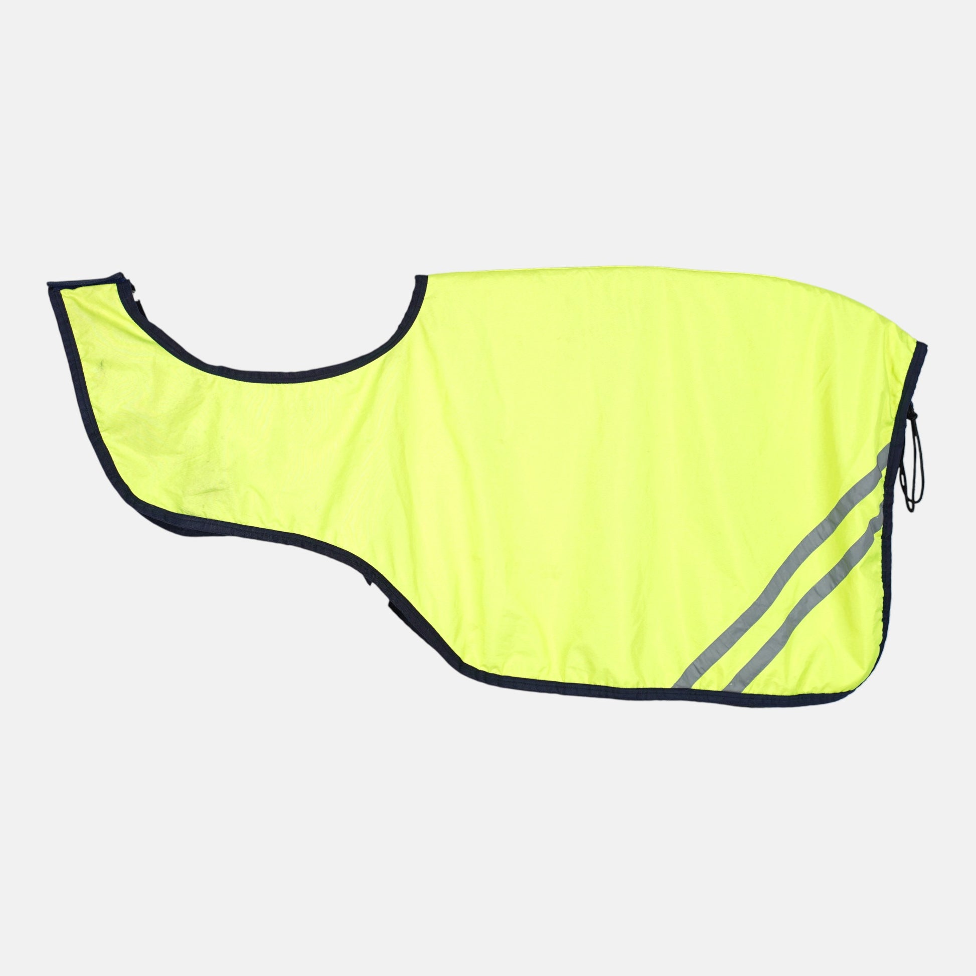 Fleecefodrat ridtäcke i varselfärg med kardborre i fronten från okänd tillverkare.