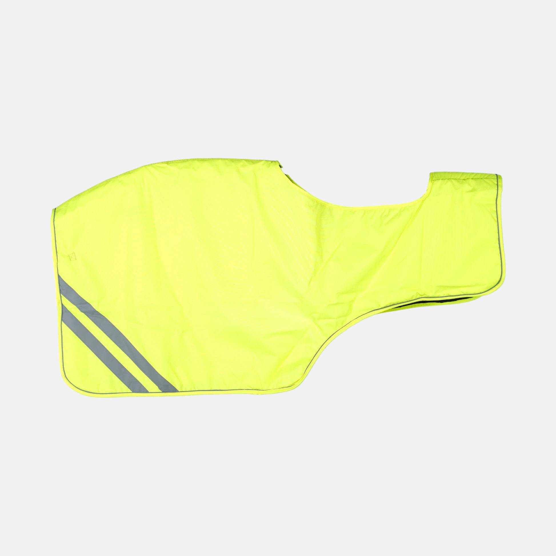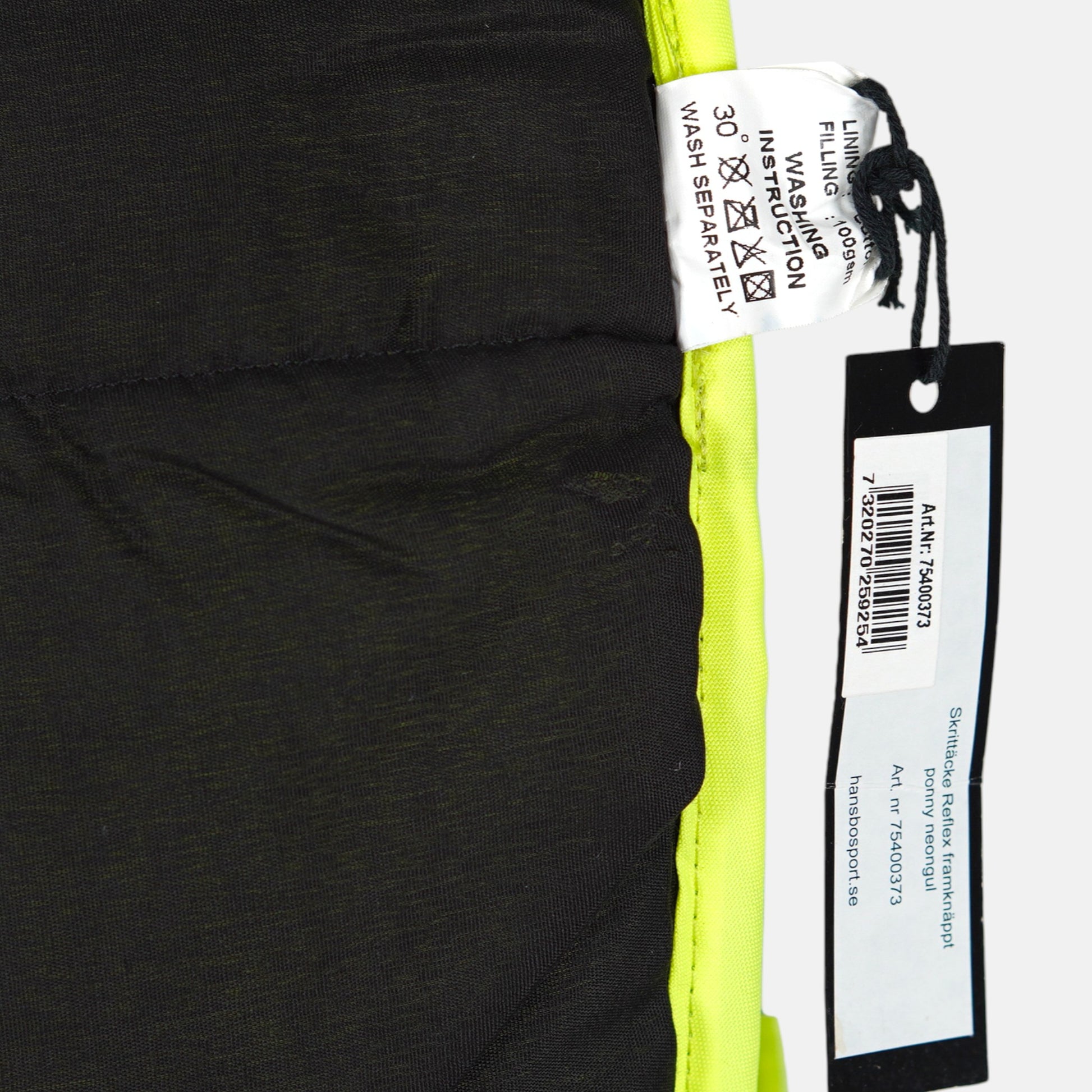 Ridtäcke i varselgul färg med reflexdetaljer och 100g fyllning från Hansbo Sport. Täcket är märkt storlek "Ponny" och vi bedömer det att passa en C/D-ponny, se även mått.