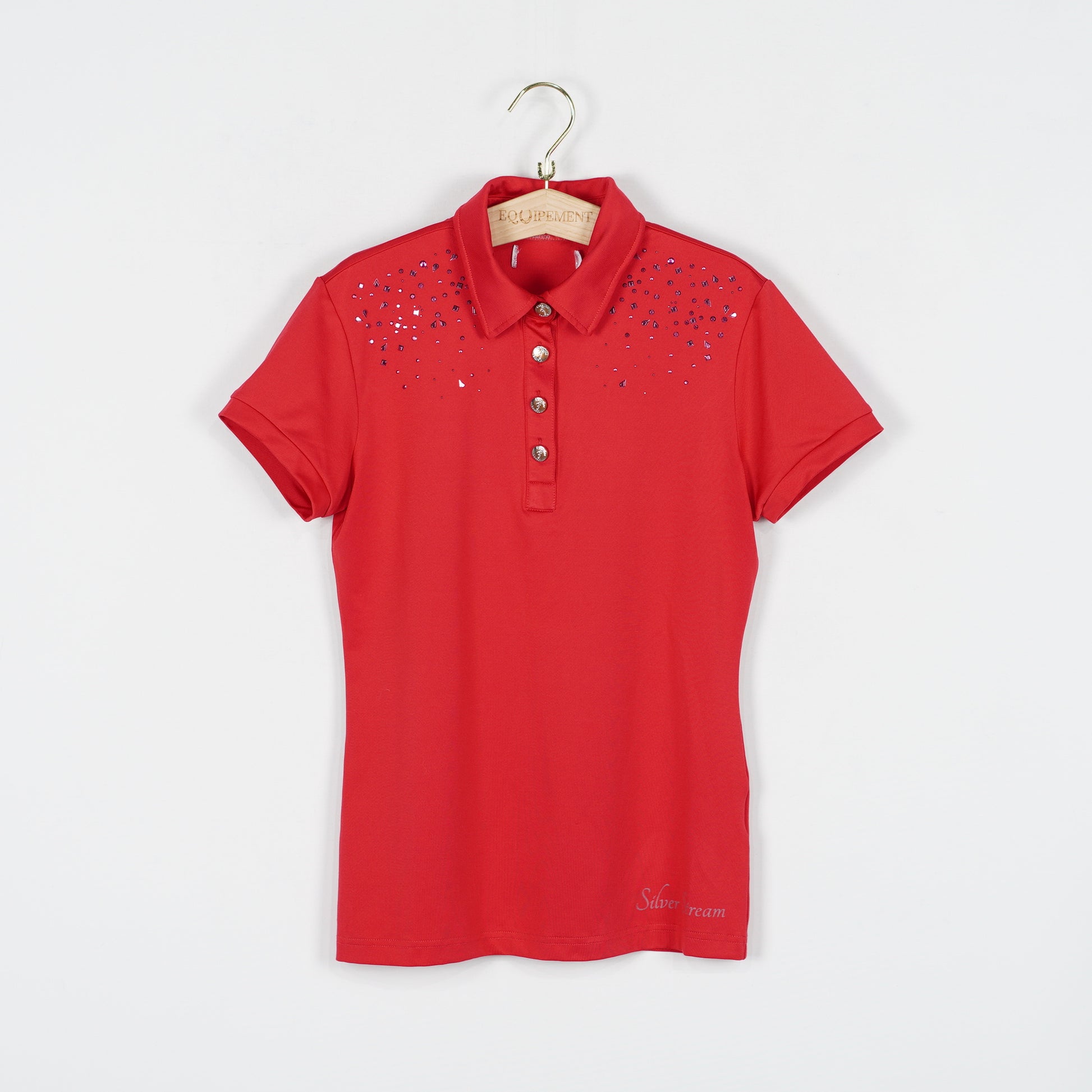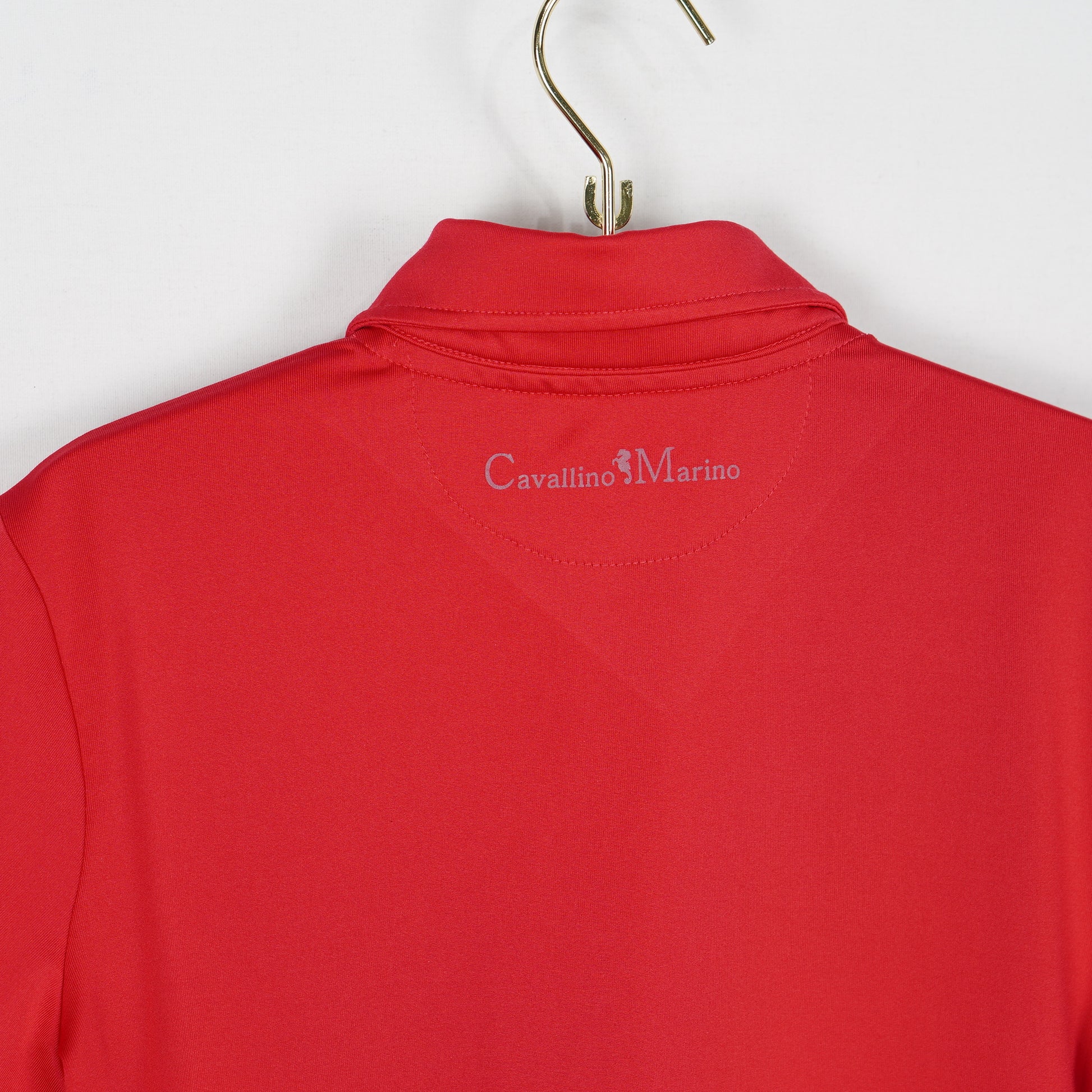 Tunn och stretchig ridtopp i rött med bling från Cavallino Marino. Toppen saknar storleksmärkning, men i jämförelse med andra produkter bedömer vi den till storlek medium.