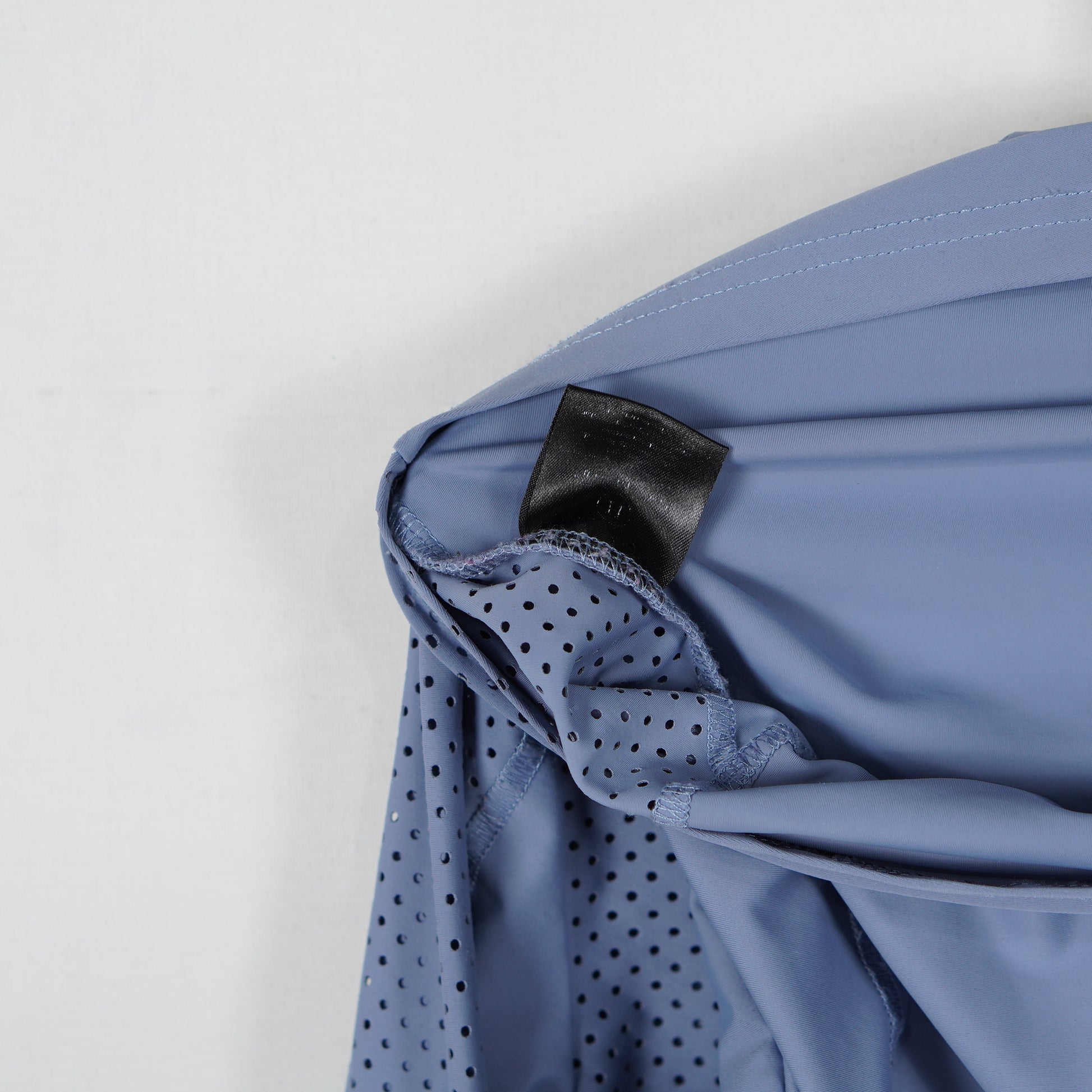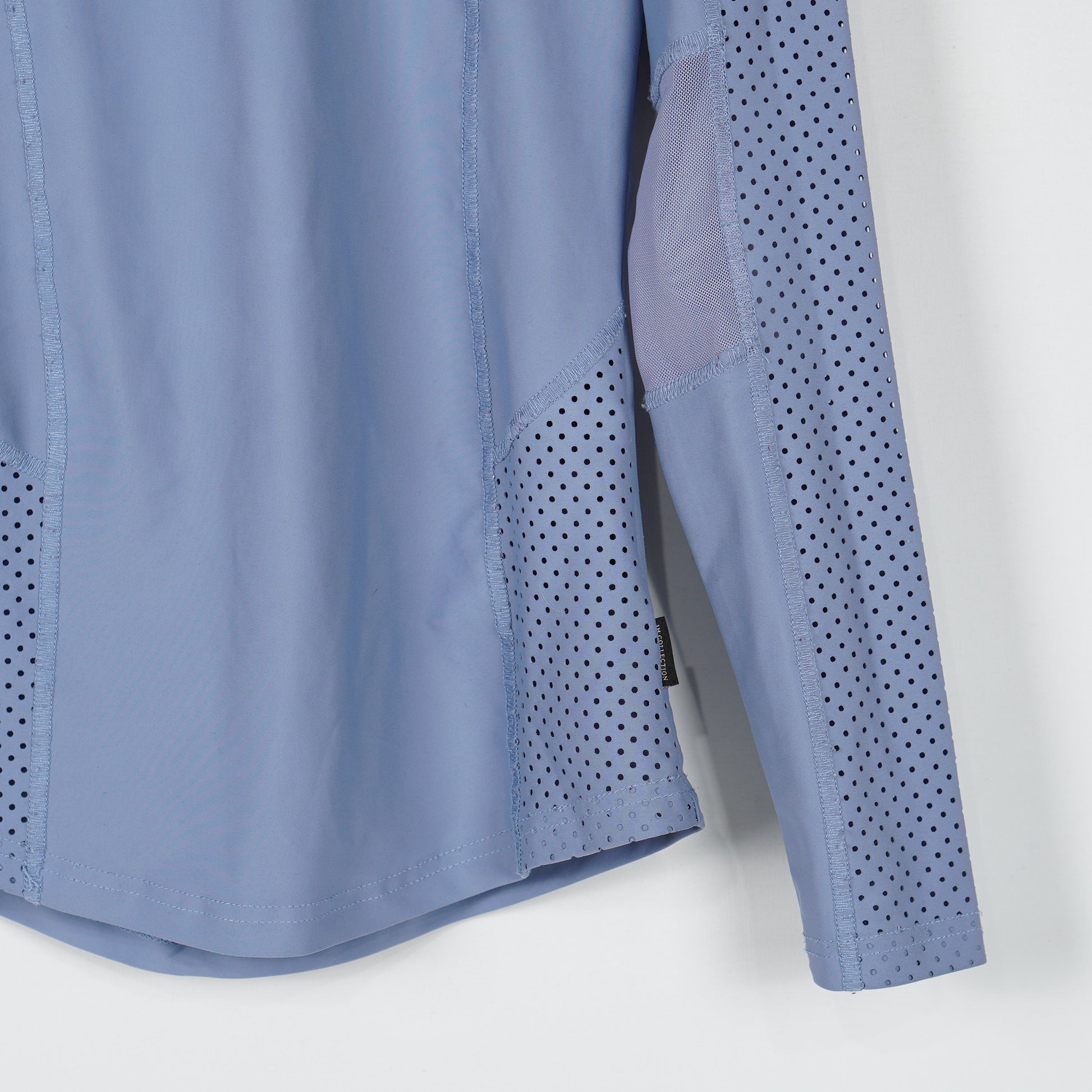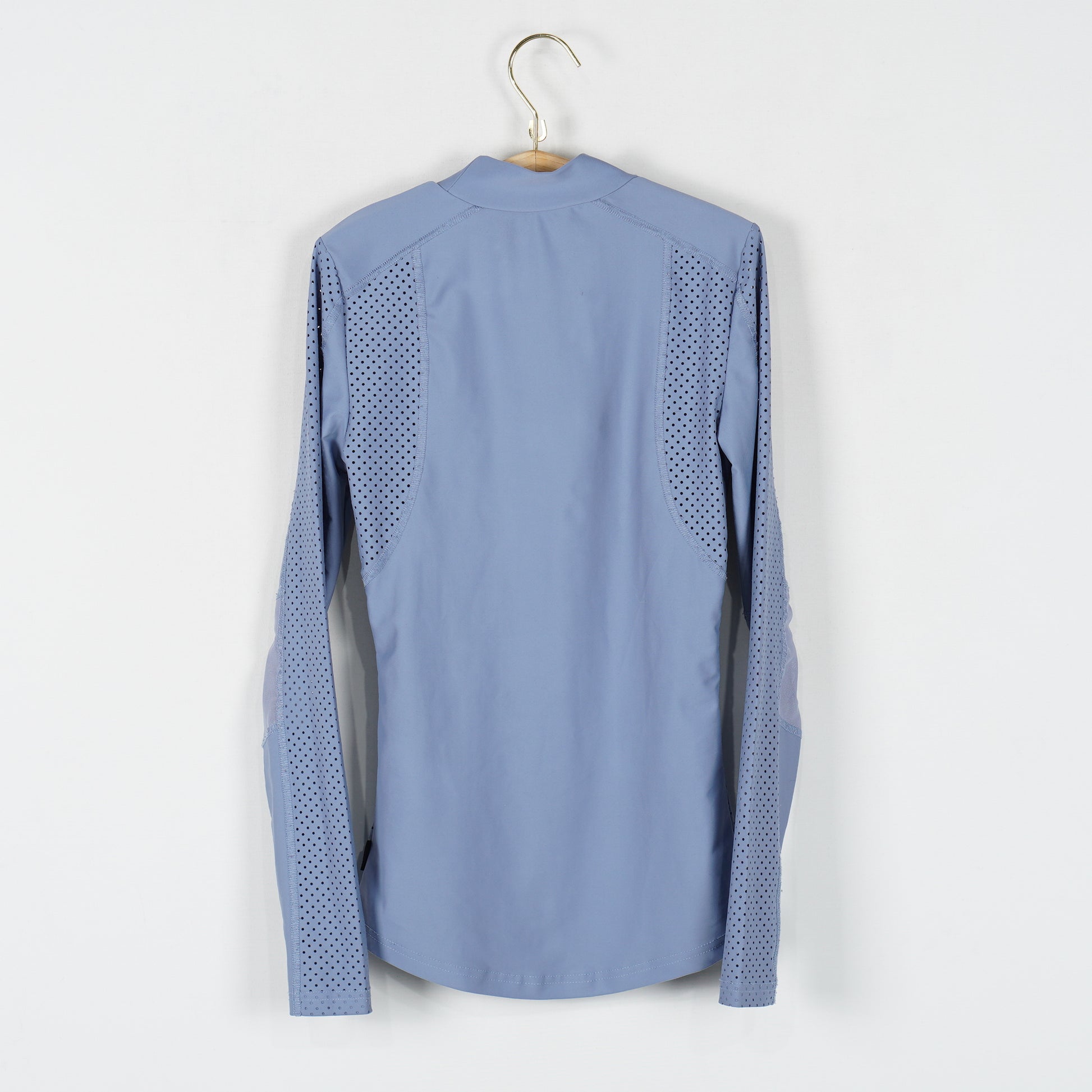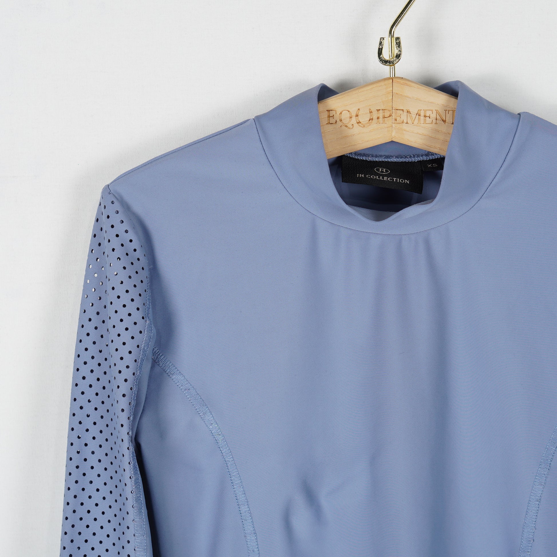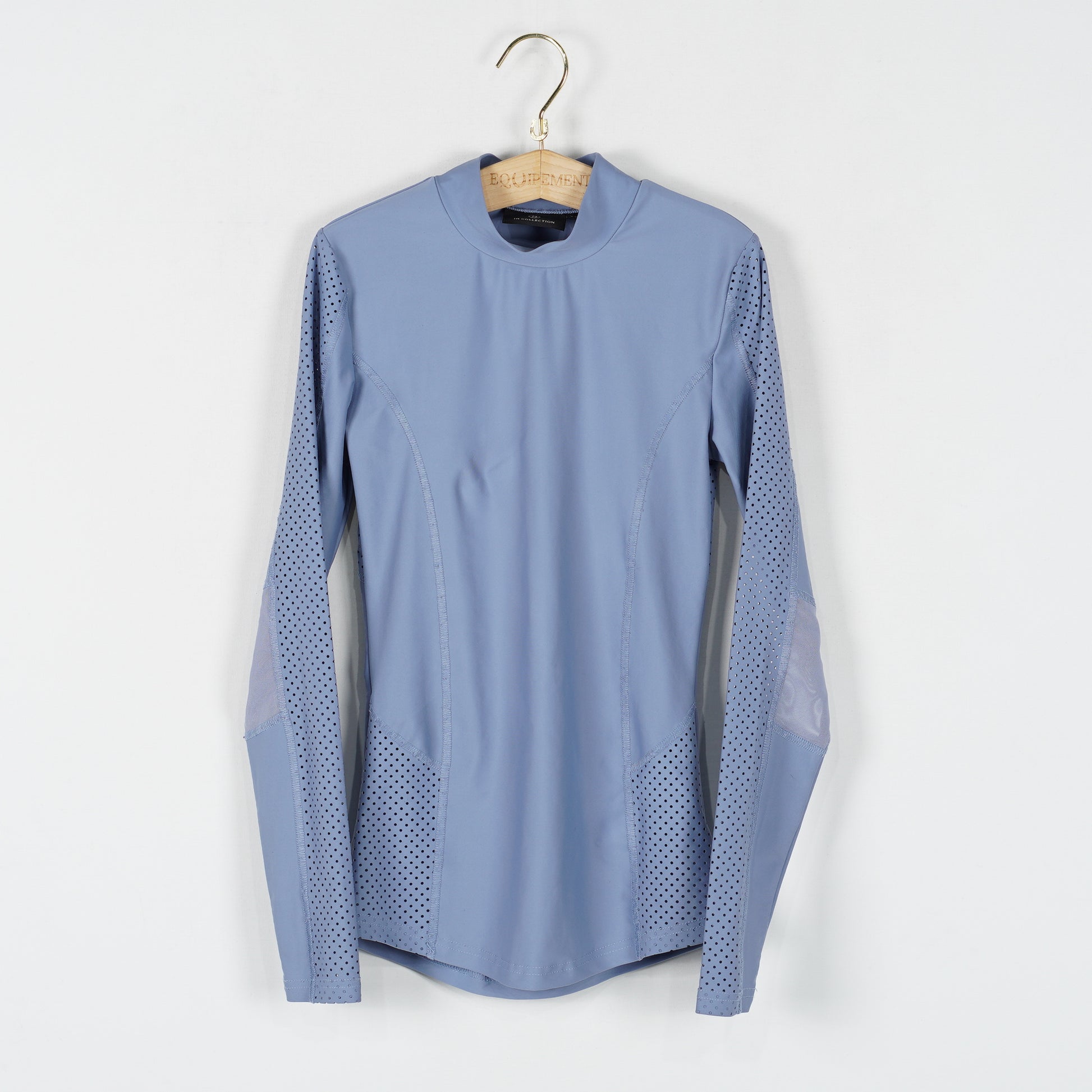 Ljusblå ridtopp i ett tunt elastiskt material med perforerade detaljer från JH Collection.