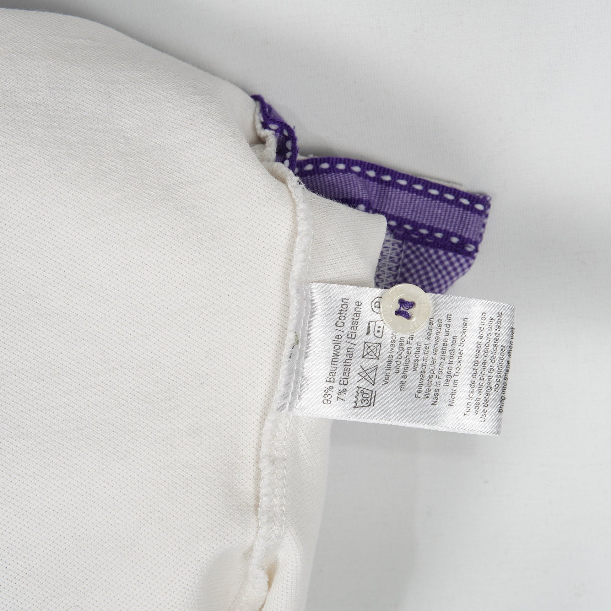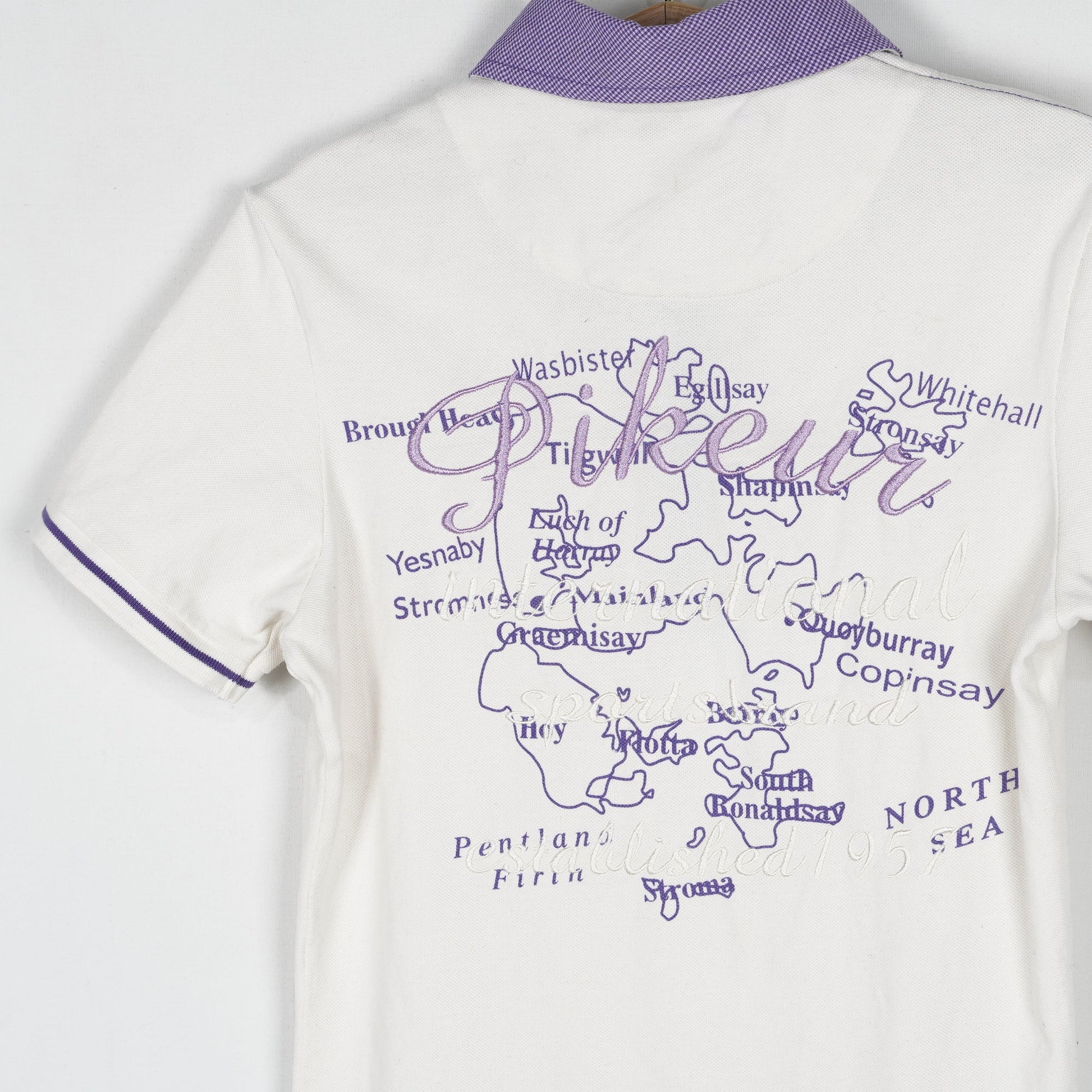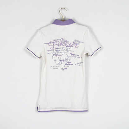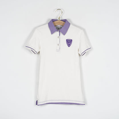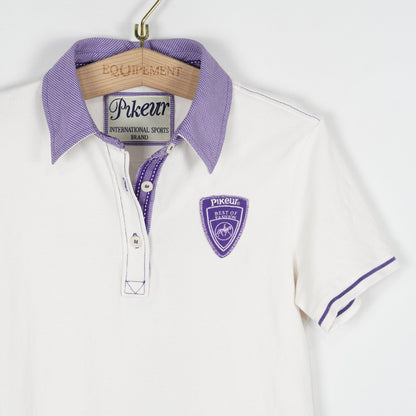 Vit ridtopp med krage från Pikeur och lila detaljer. Toppen är i ett bra skick.