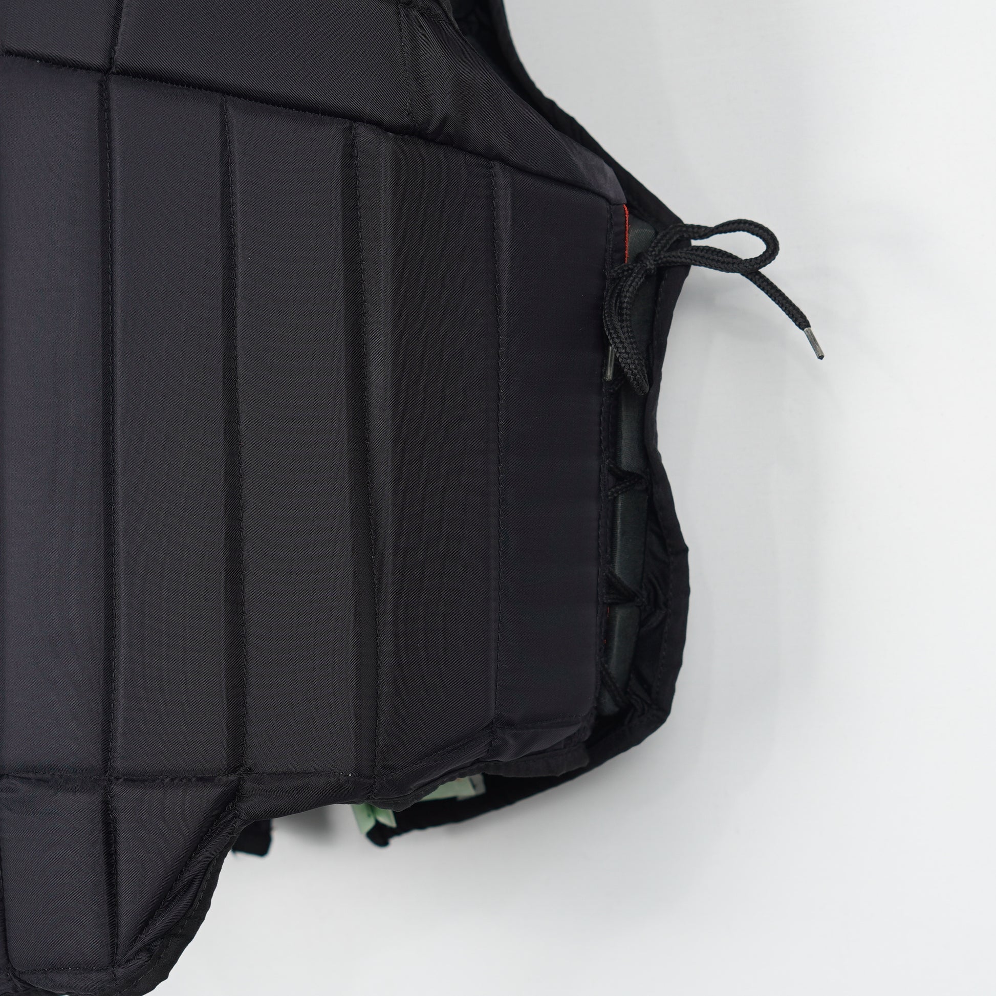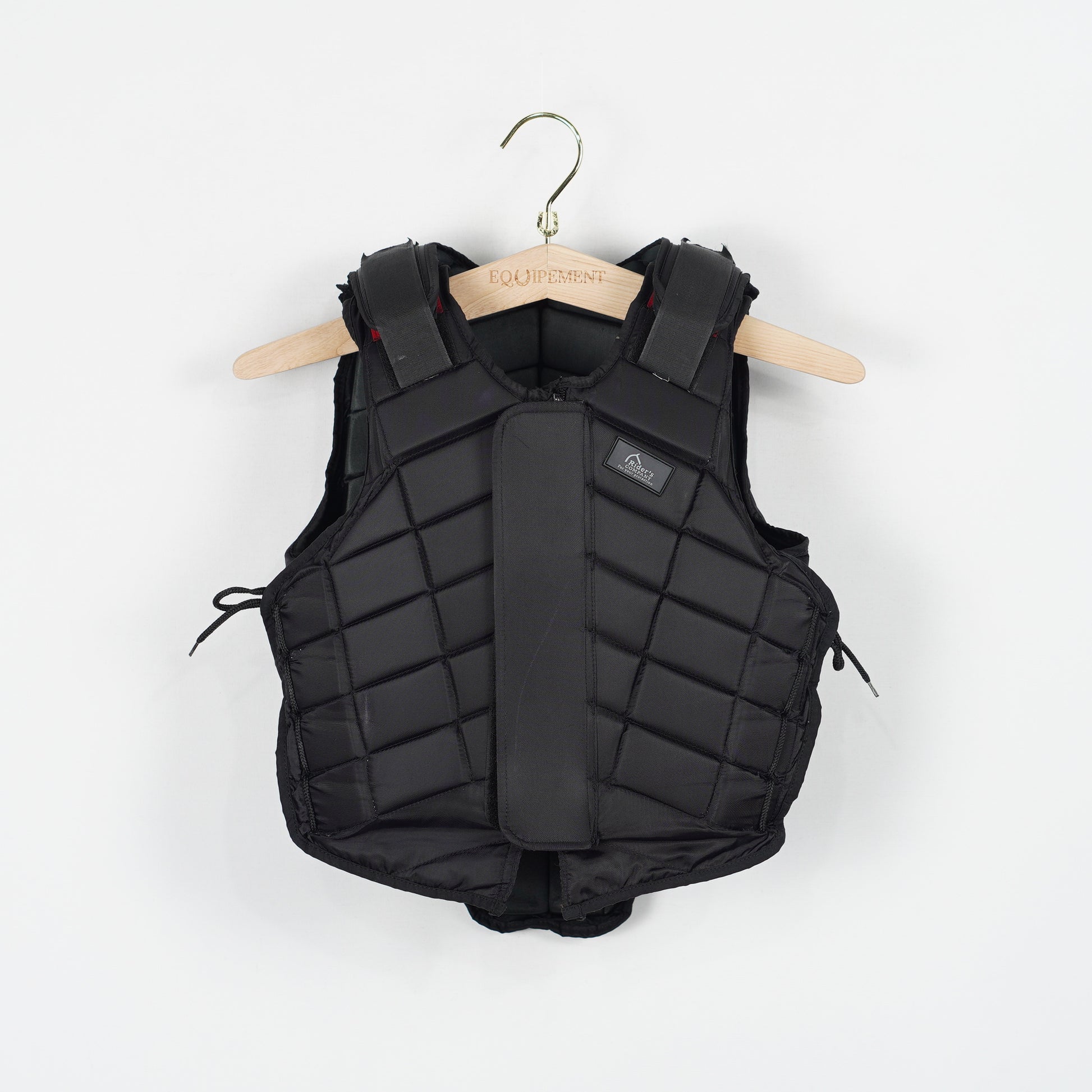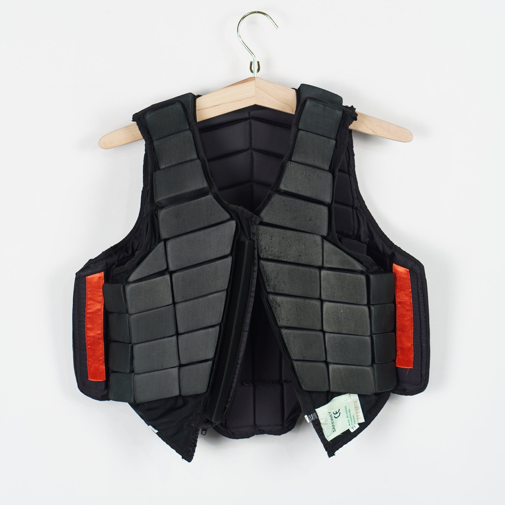 Svart säkerhetsväst med snörning på sidorna och kardborre över axlarna att justera storlek med. Tyget på insidan är lite tunt, därav 2/5 i skick.