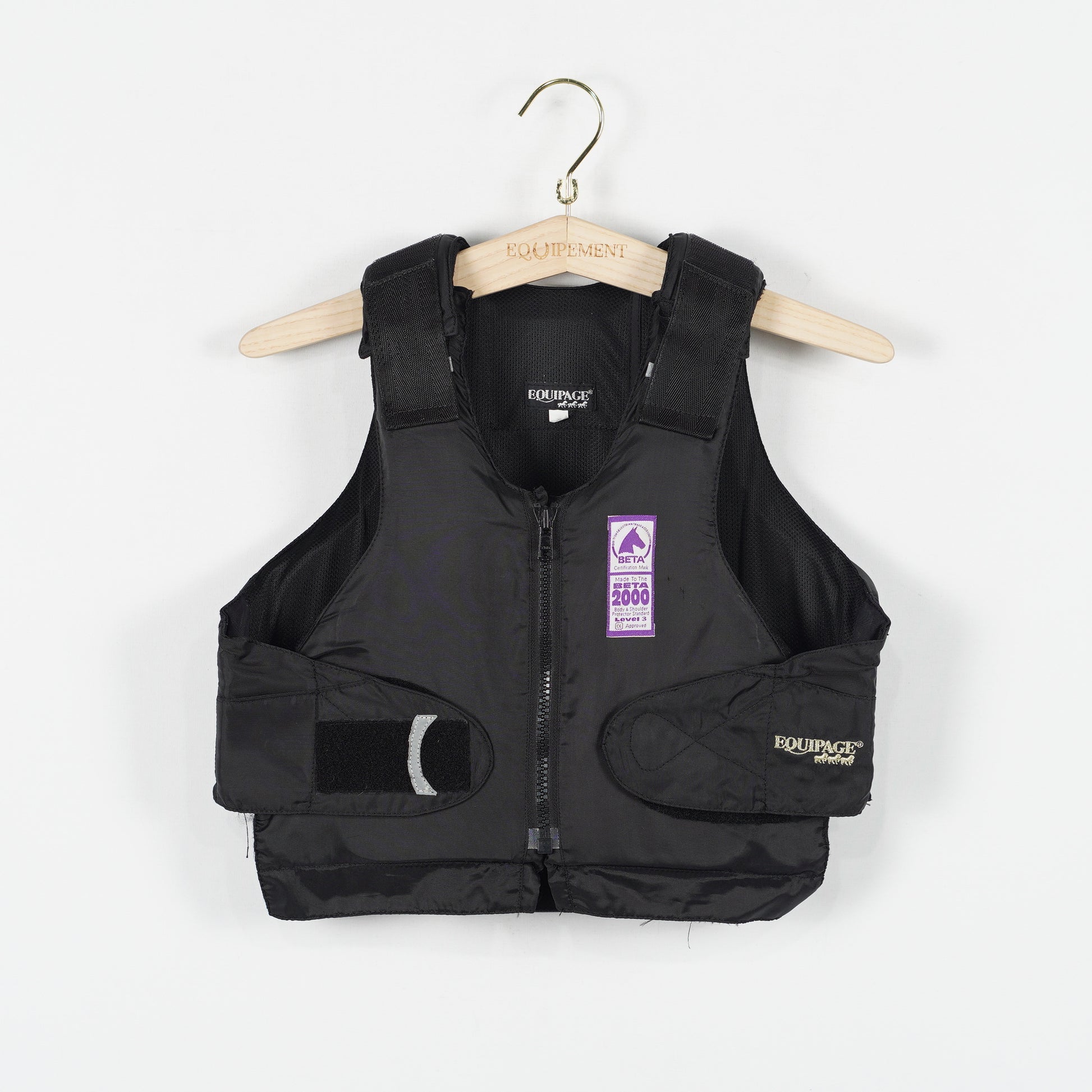 Svart säkerhetsväst Level 3 från Equipage. Säkerhetsvästens storlek kan justeras över både axlar och runt kroppen med kardborren.