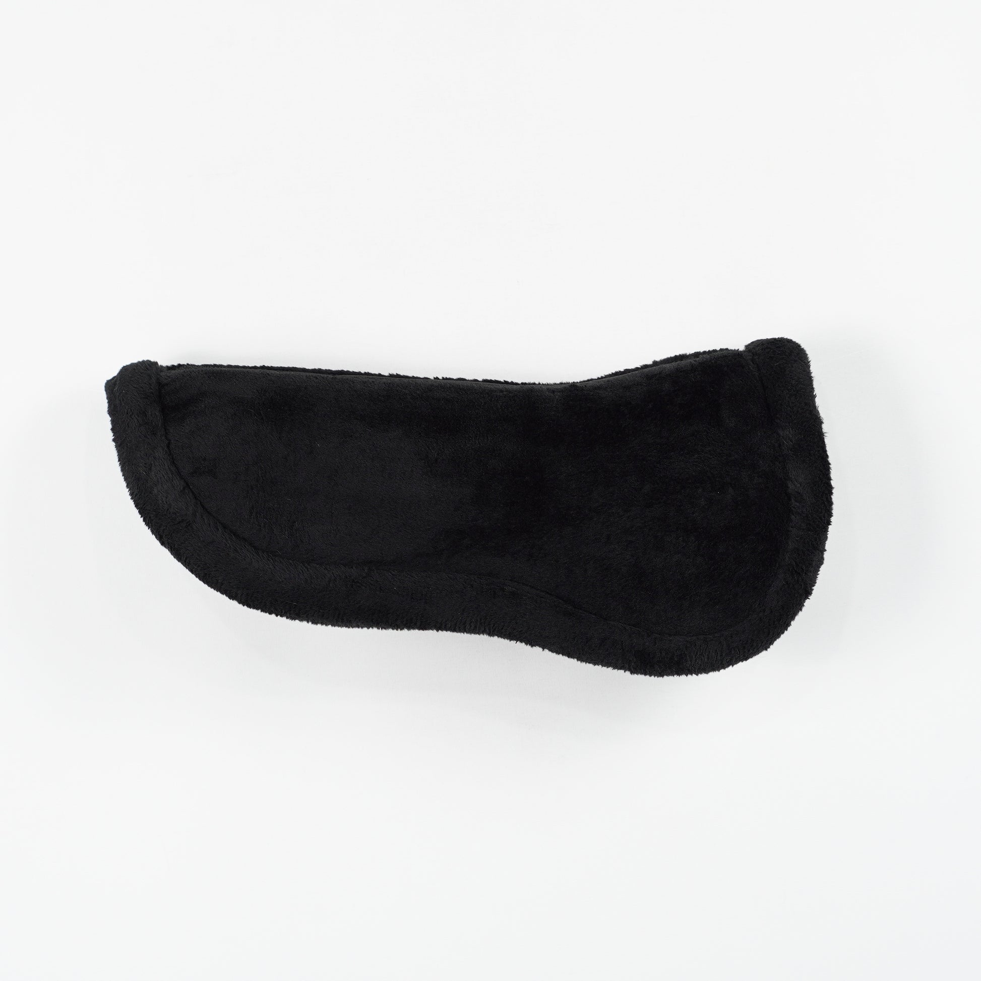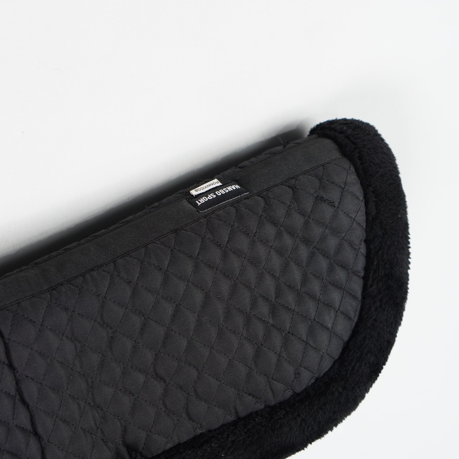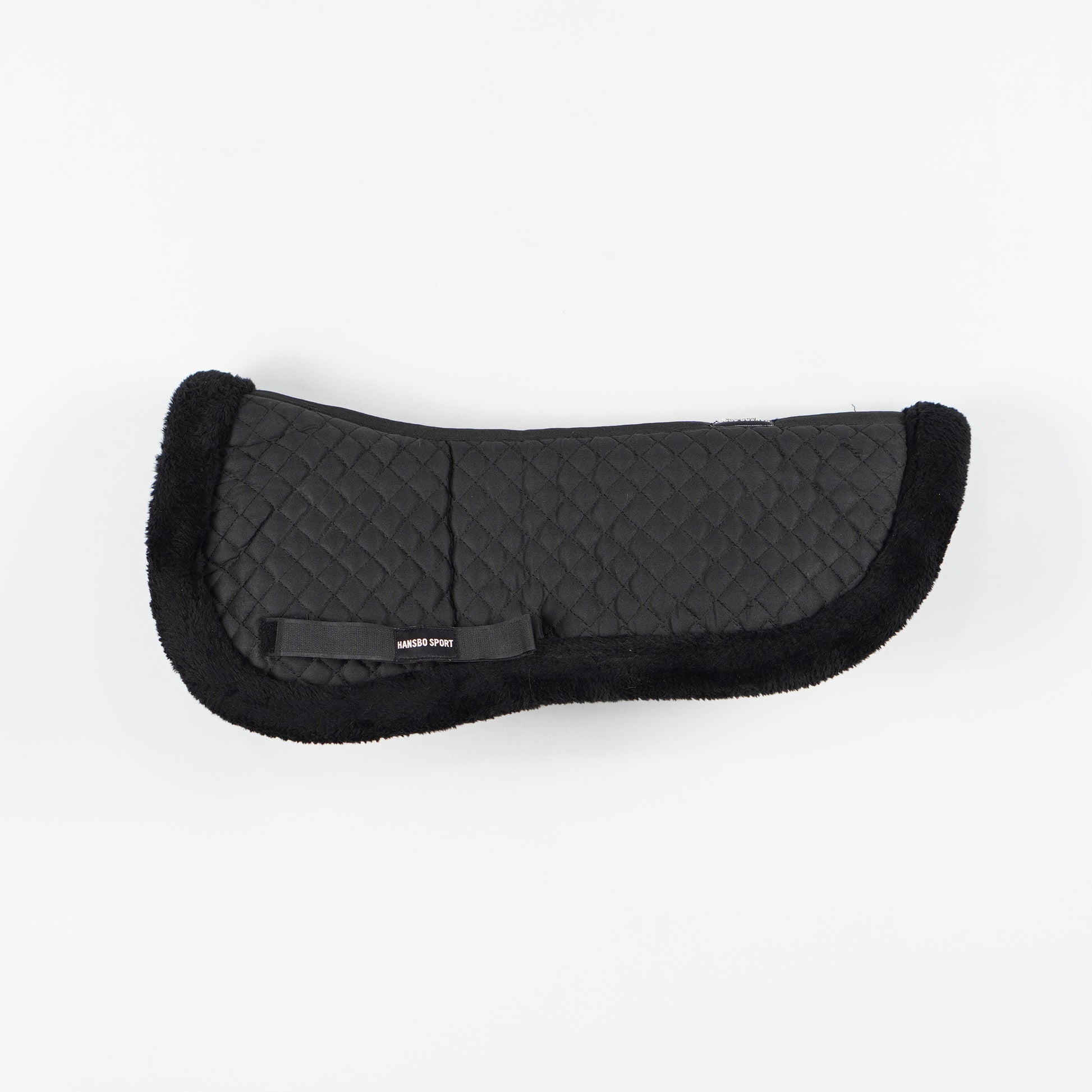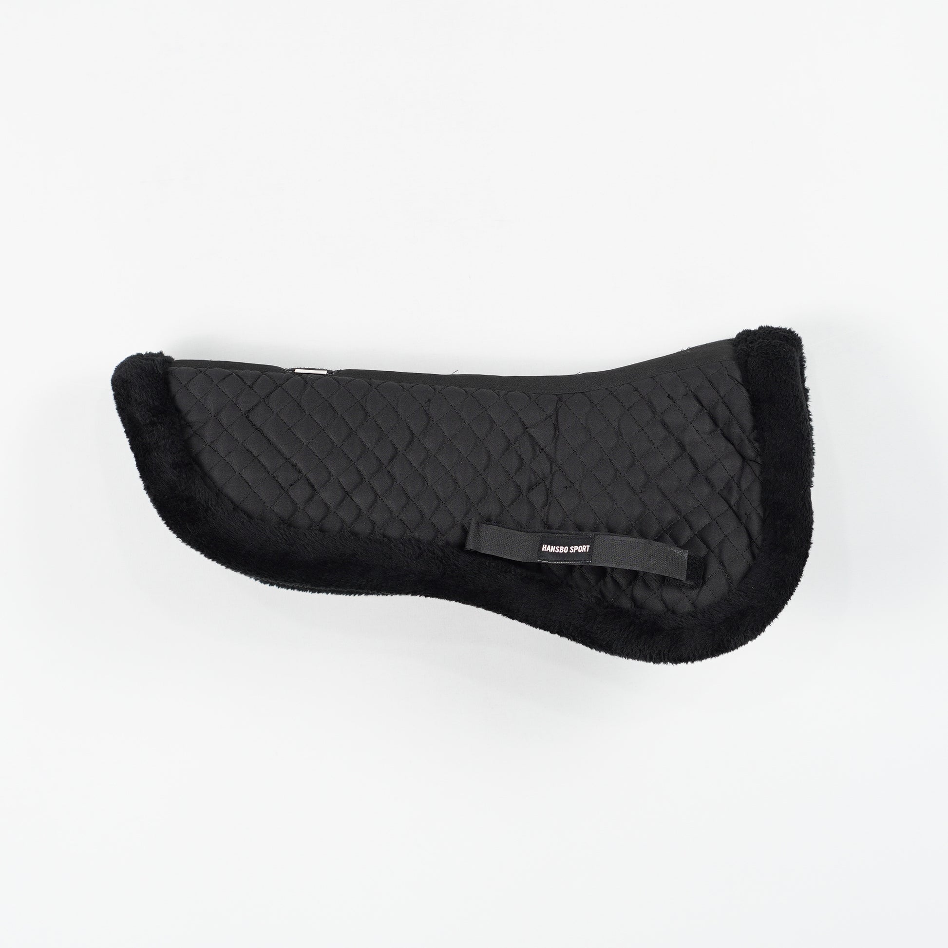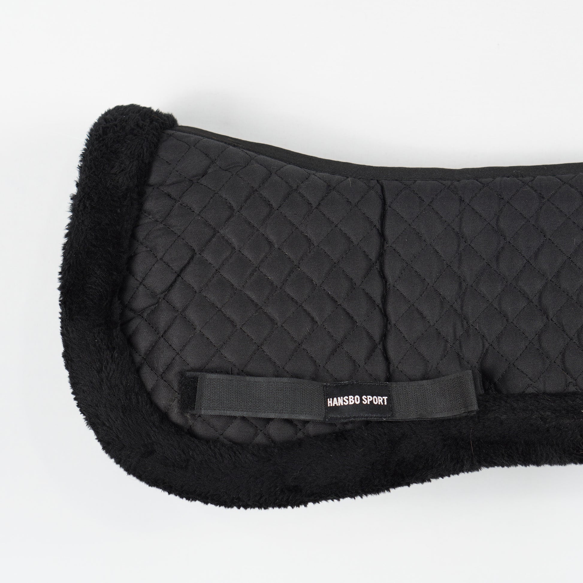 Svart sadelpadd med teddy på undersidan och kardborrestroppar från Hansbo Sport. Sadelpadden är märkt med storleken Ponny/Cob, se mått.