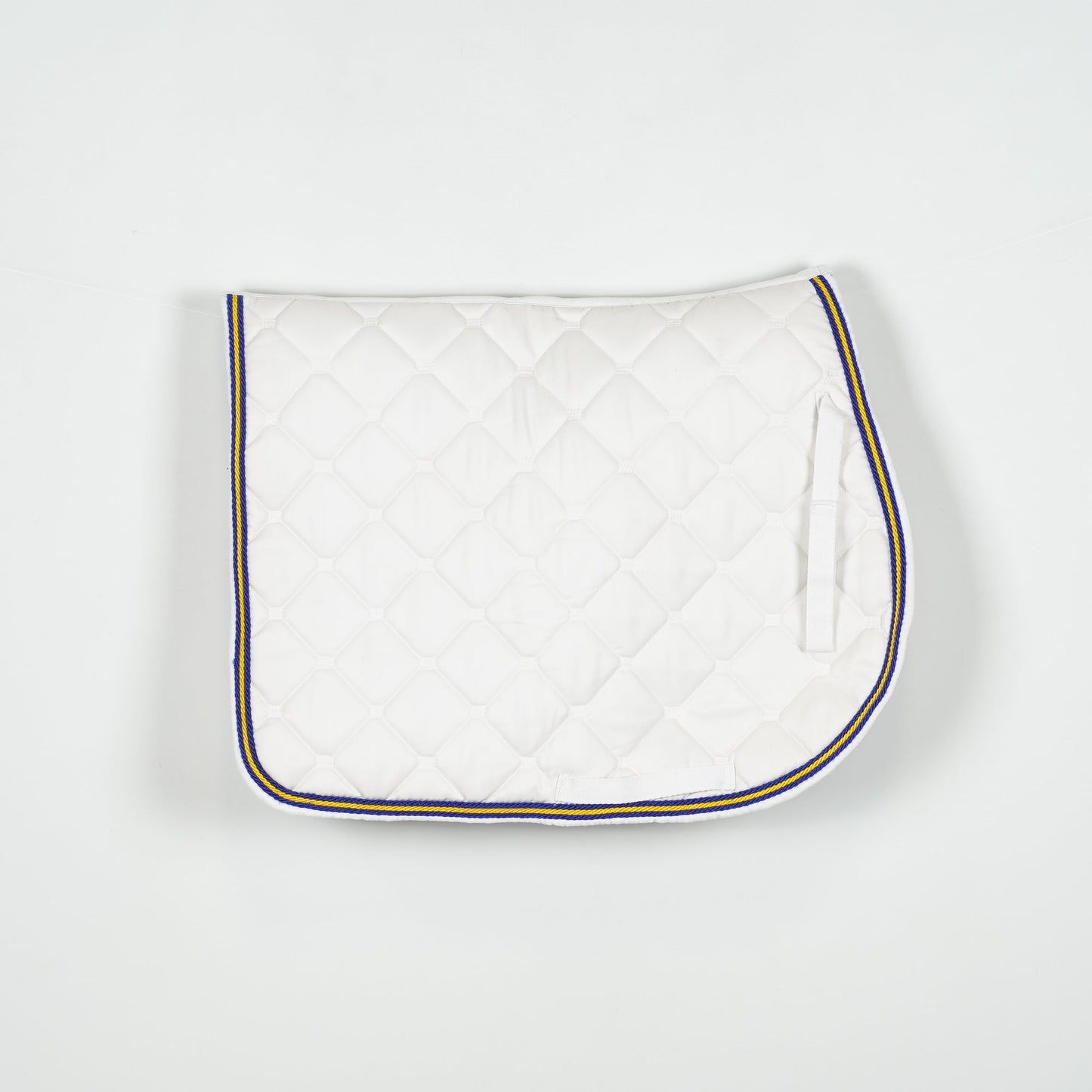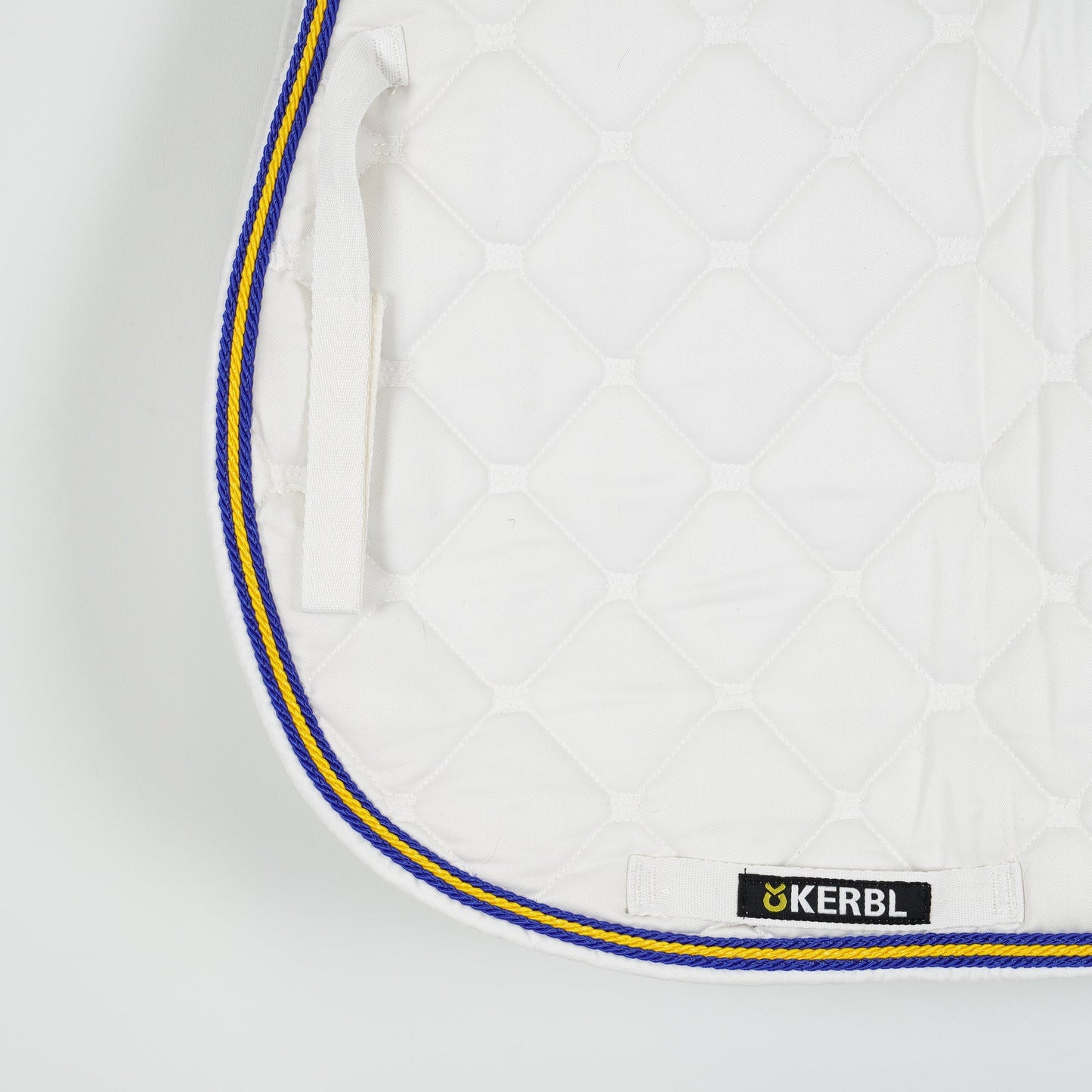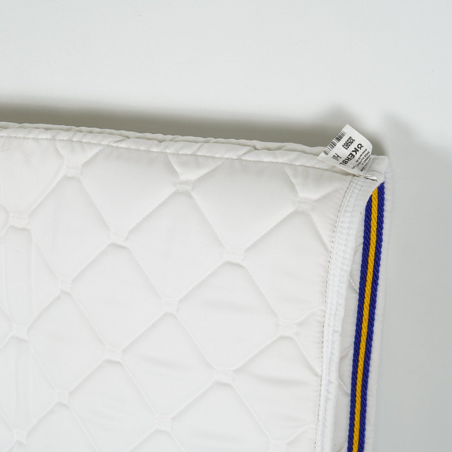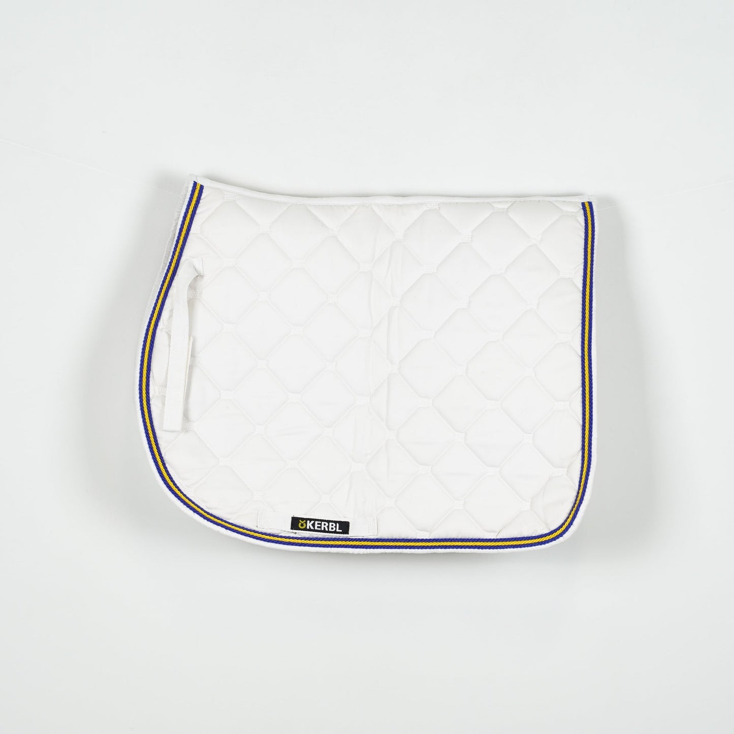 Vitt allroundschabrak från Kerbl med gul och blå passpoal. Schabraket är i ett bra skick.