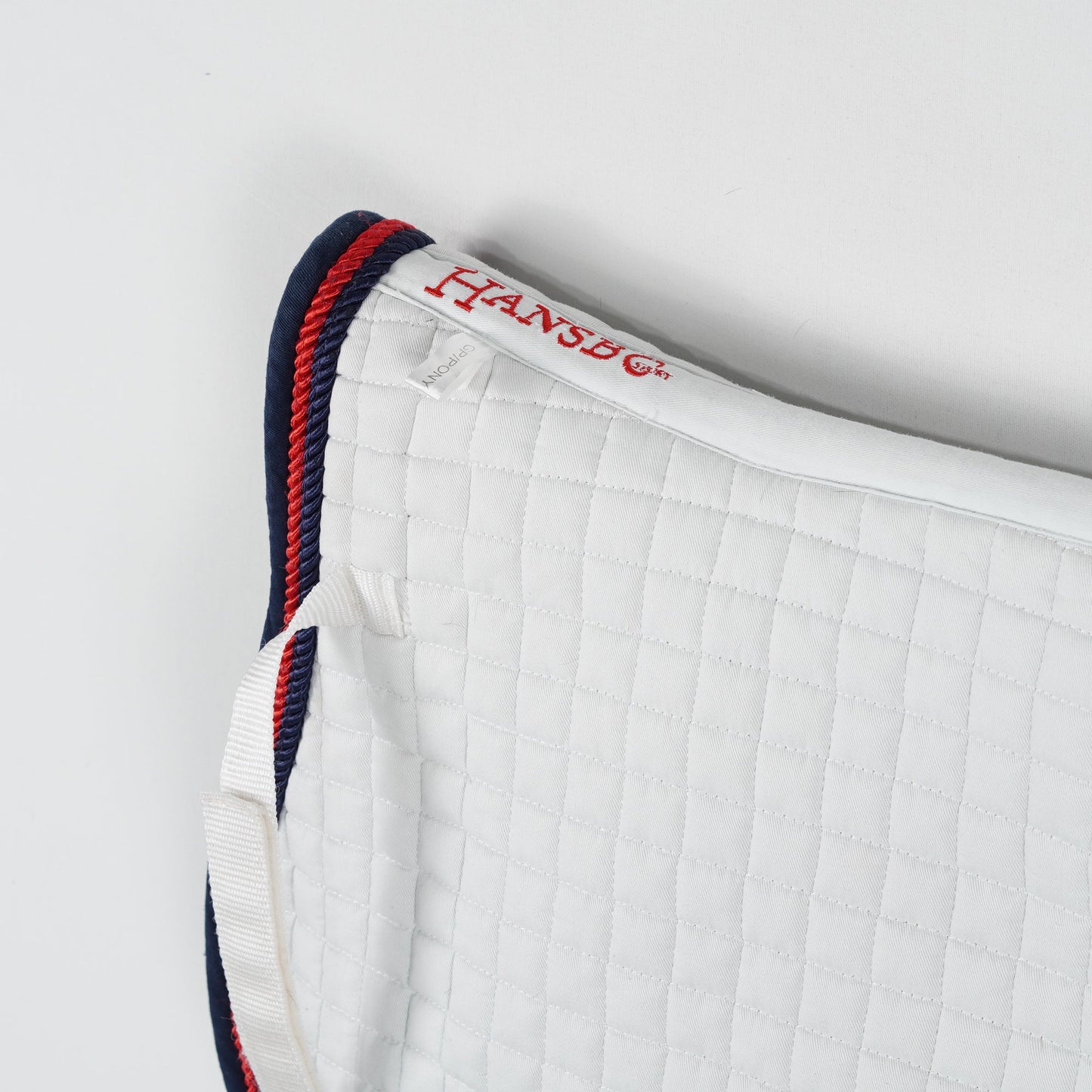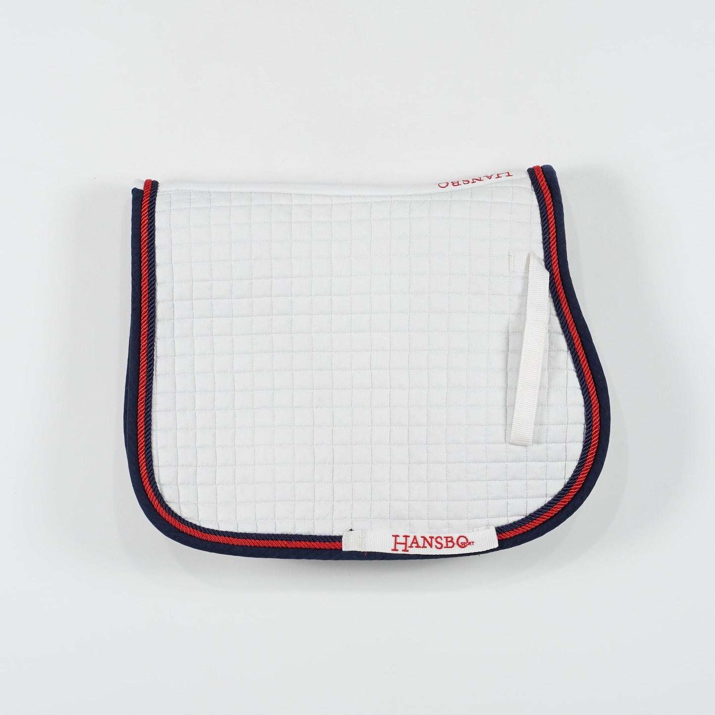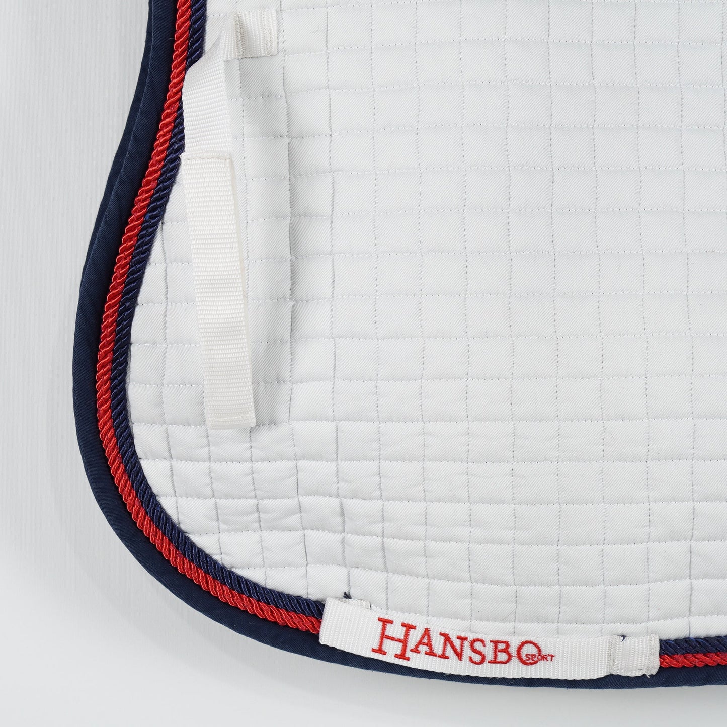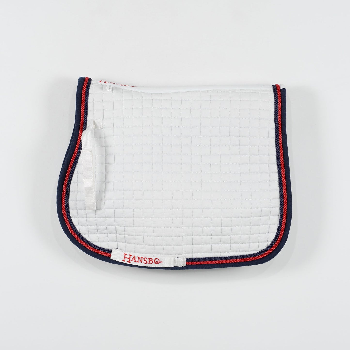 Vitt allroundschabrak med blå kant och röd passpoal från Hansbo Sport. Schabraket är i ett använt men bra skick.