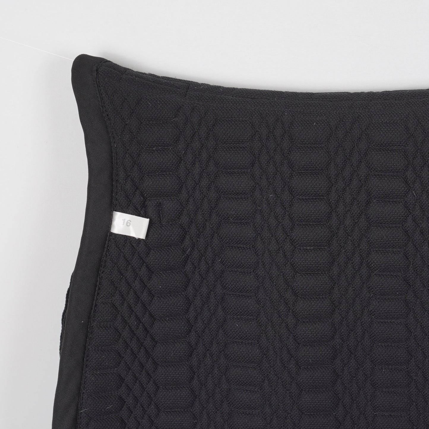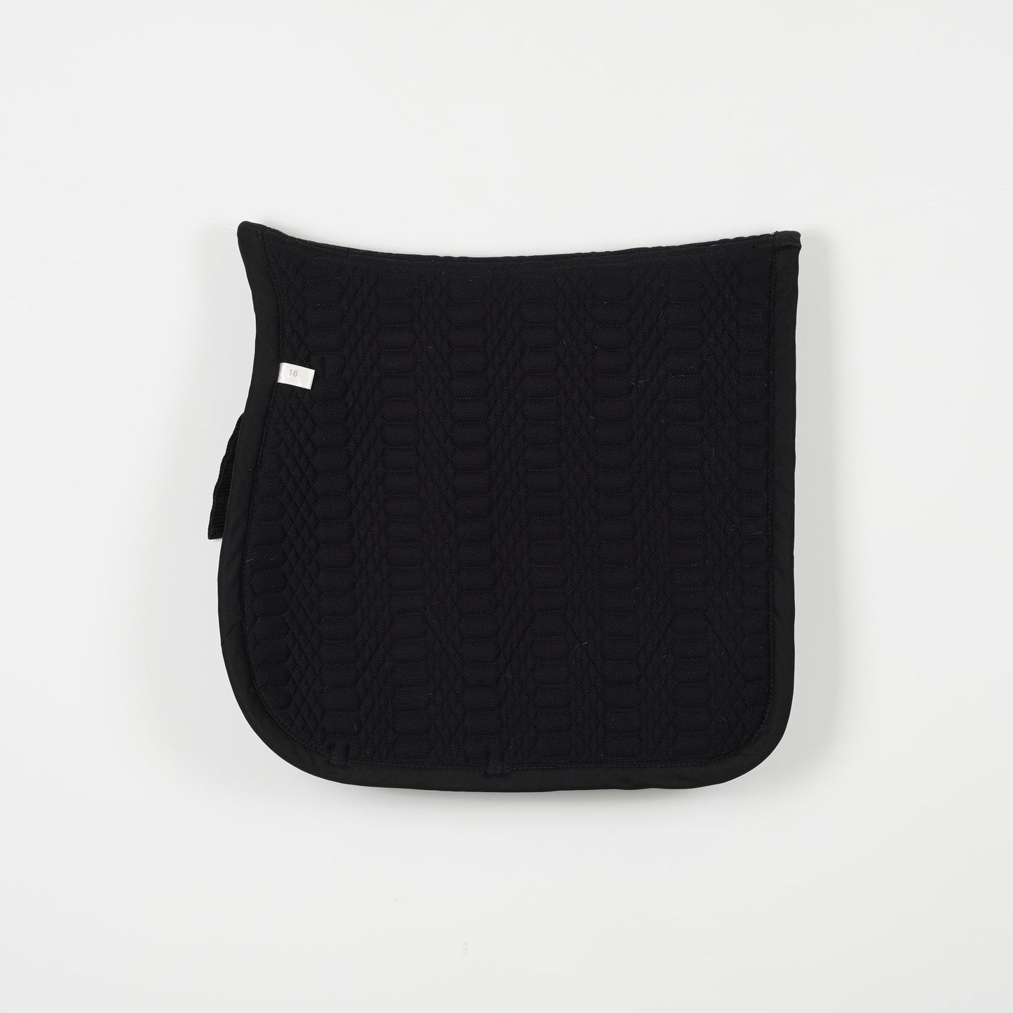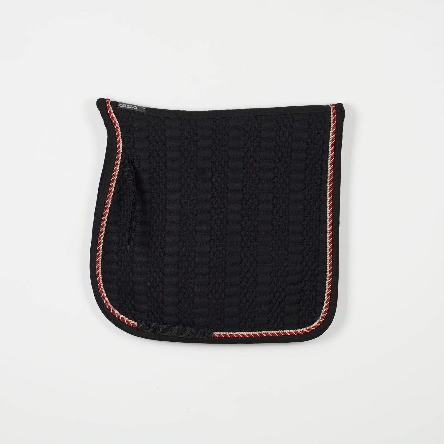 Svart dressyrschabrak från Catago med två passpoaler. Det står 16" på schabraket och den ser kort ut i ryggen.