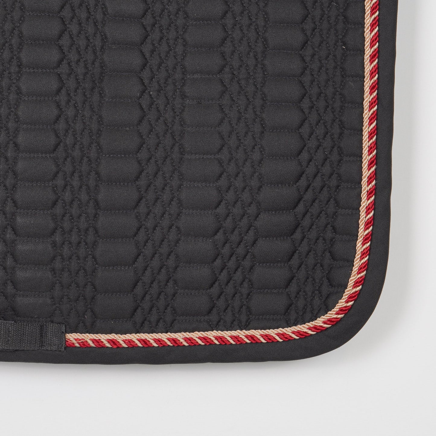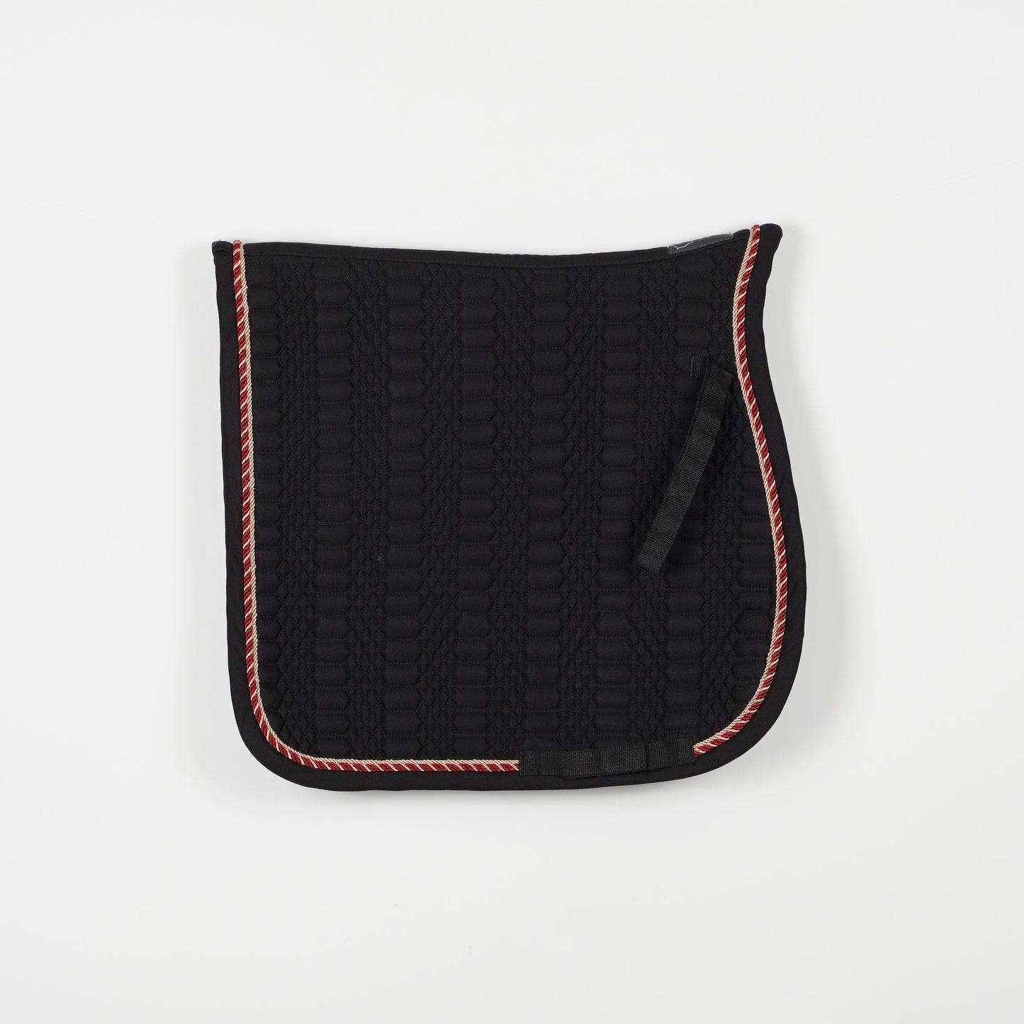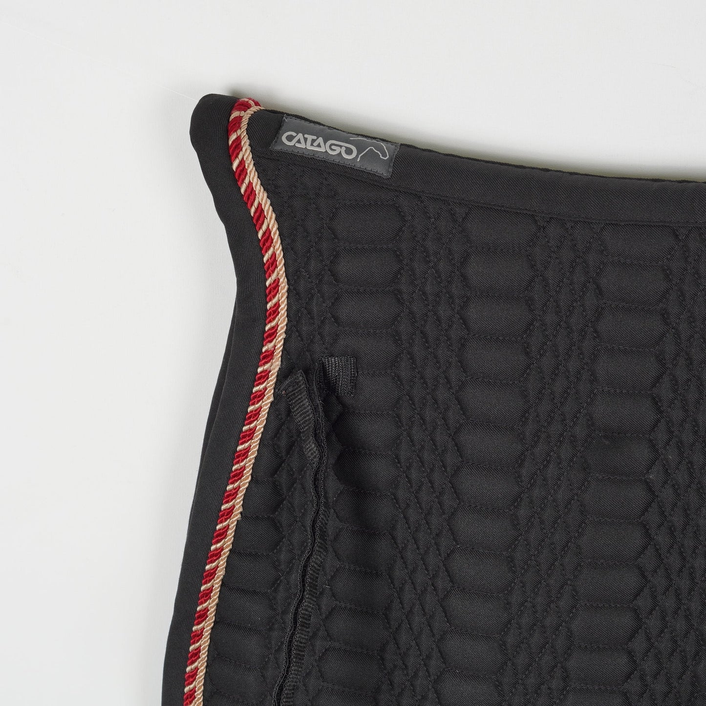 Svart dressyrschabrak från Catago med två passpoaler. Det står 16" på schabraket och den ser kort ut i ryggen.