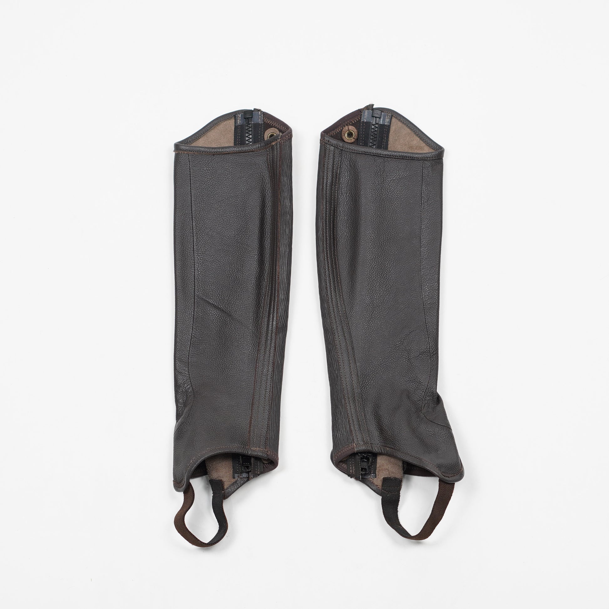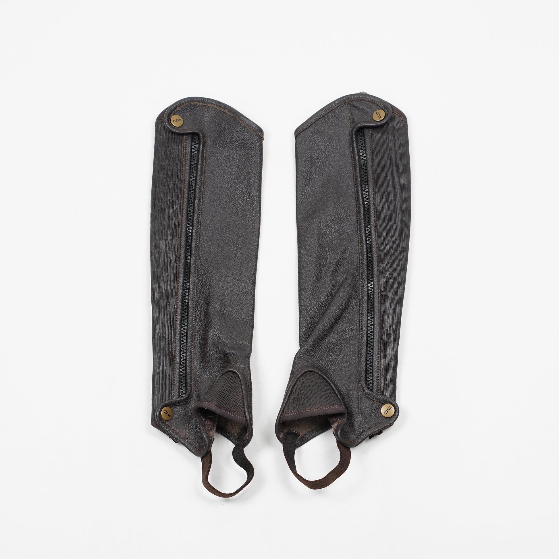 Shortchaps i brunt läder med mycket resår bak och mässingspännen från CRW.