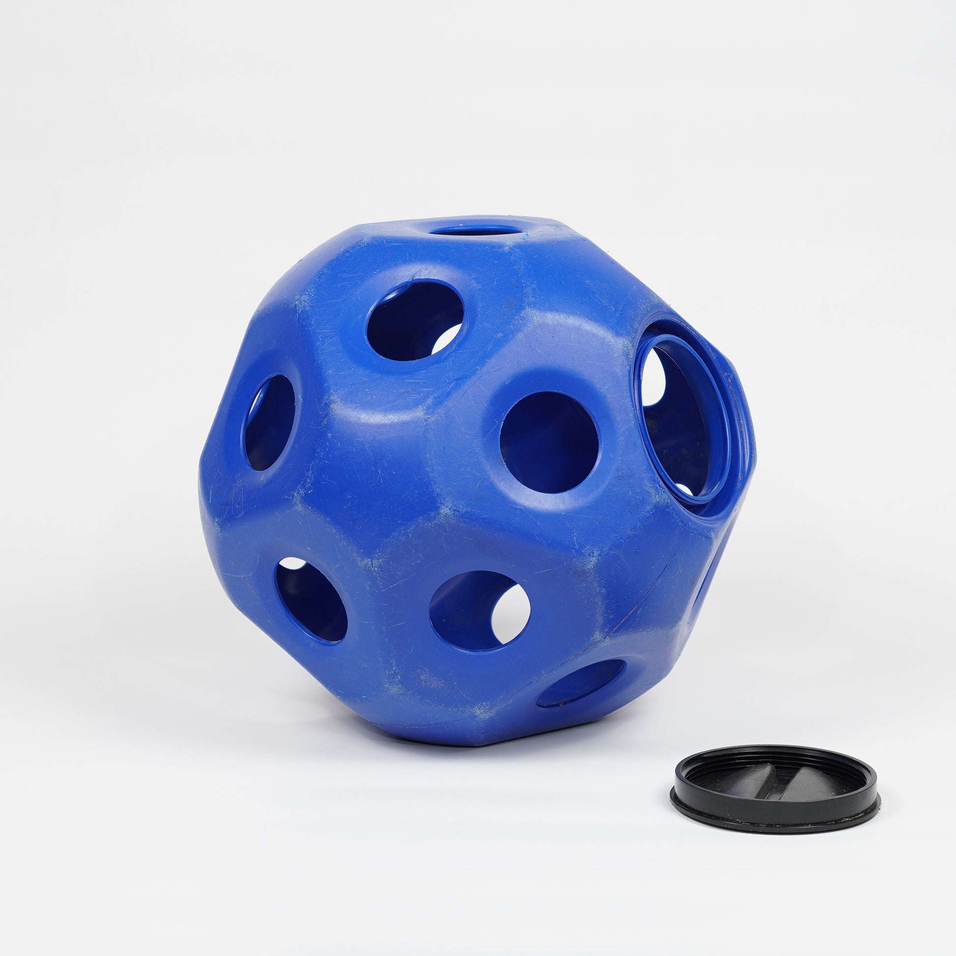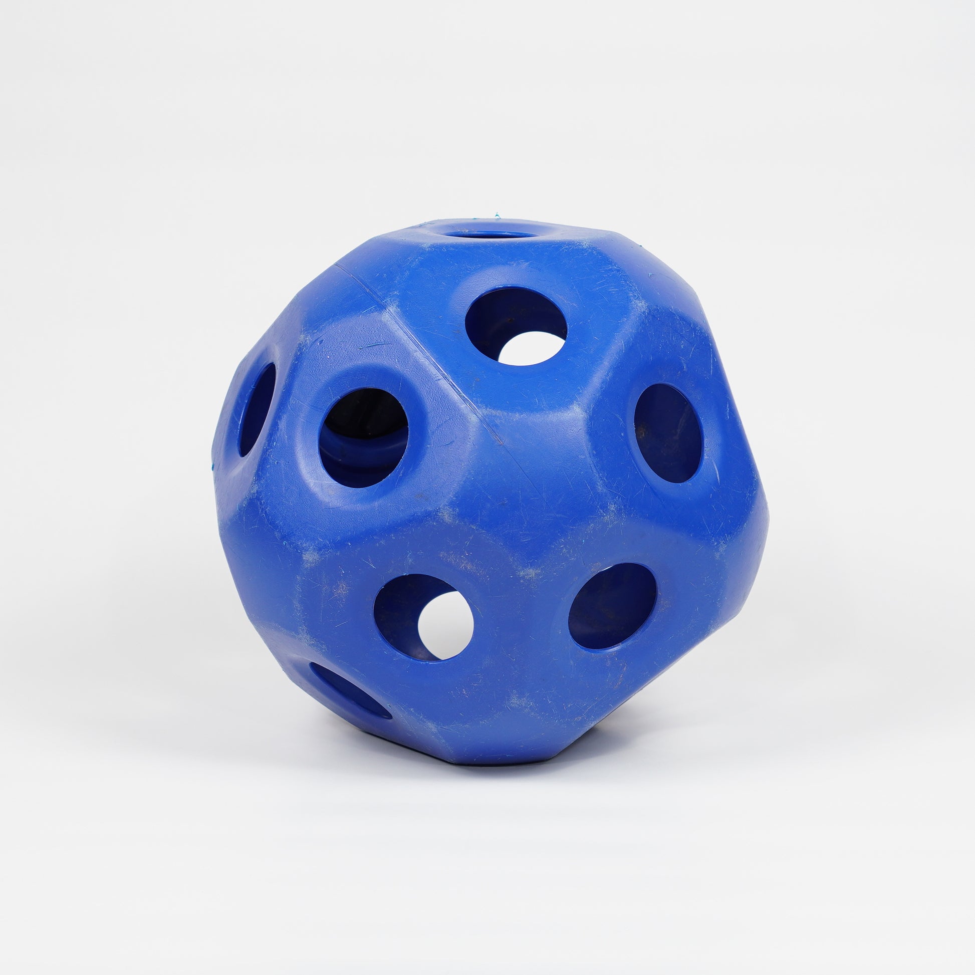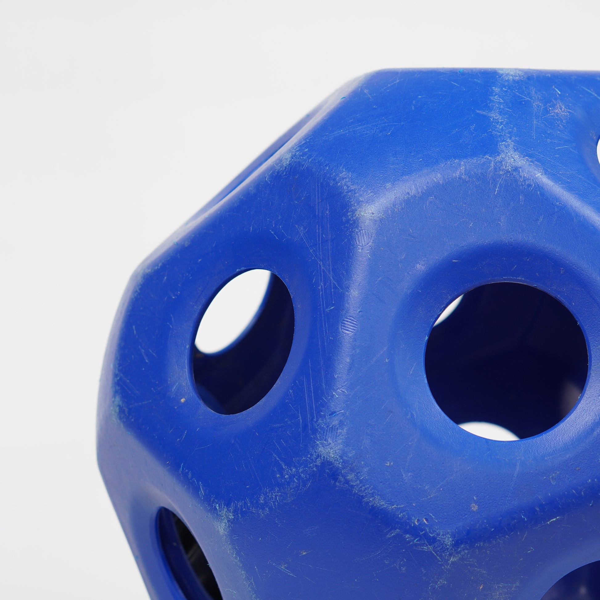 Slowfeeder/höboll i kraftig blå plast med hål som har en diameter på 7 cm. Höbollen är använd och tydliga märken finns men den i ett bra skick.