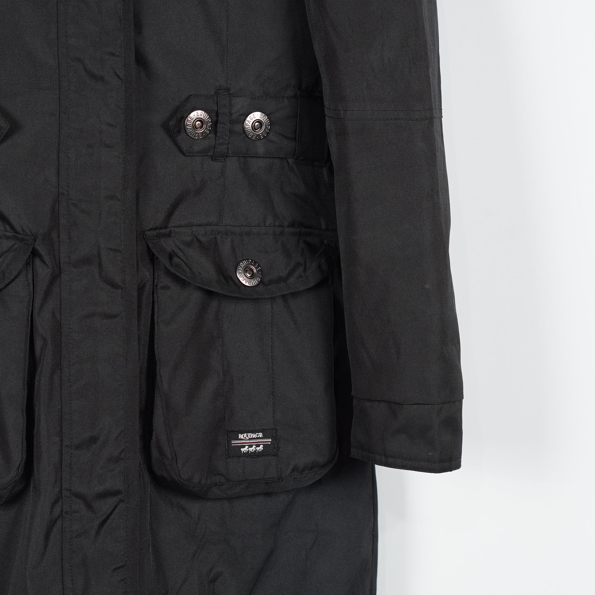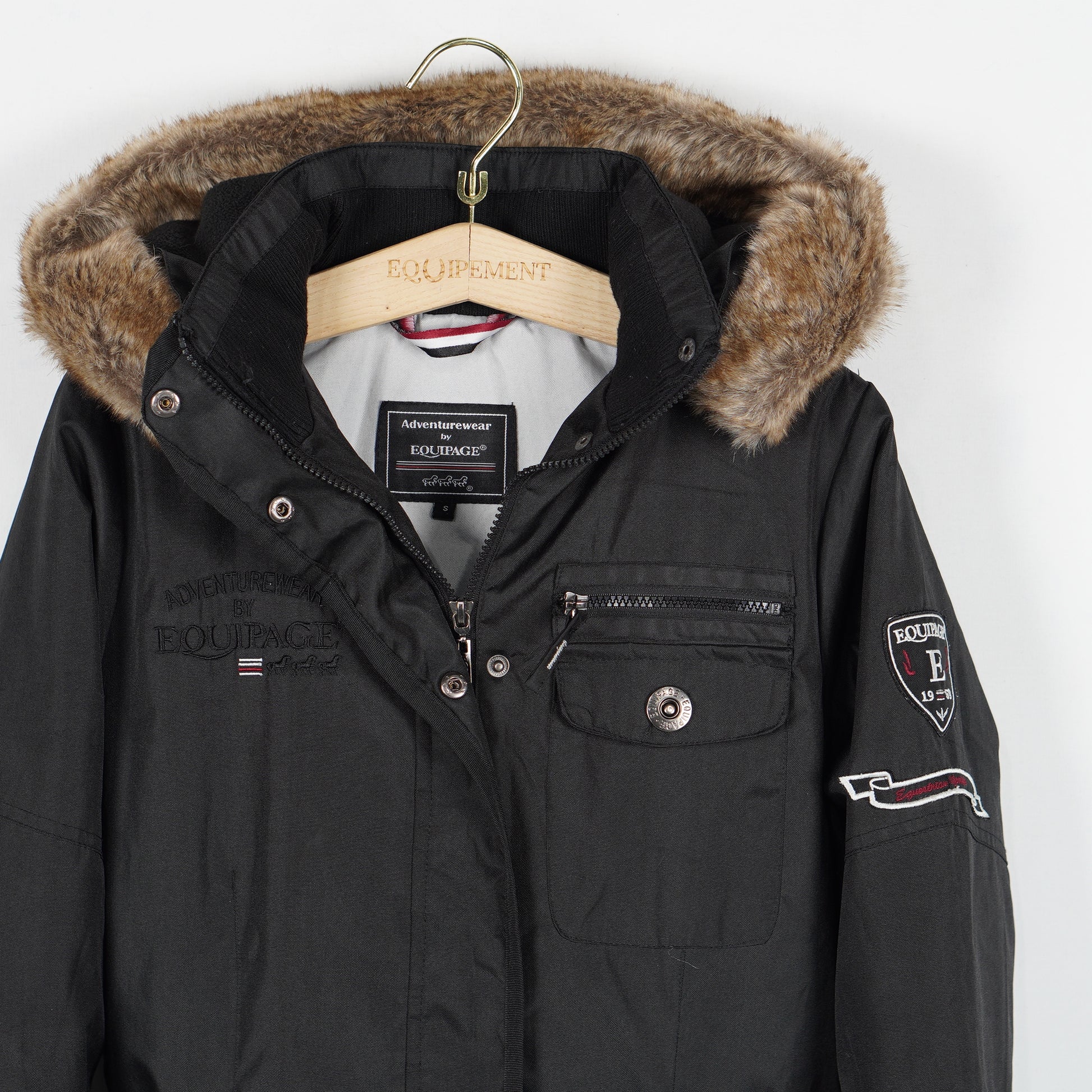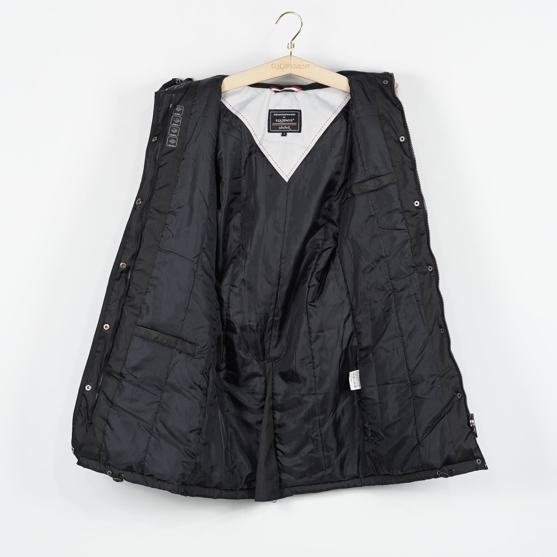 Fin vinterjacka från Equipage. Jackan har en fleecefodrad luva som går att ta av – luvan har också funktionen att fällas ut och bli djupare. Jackan har många praktiska fickor, både med dragkedja och knappar och det går att justera storleken vid midjan.