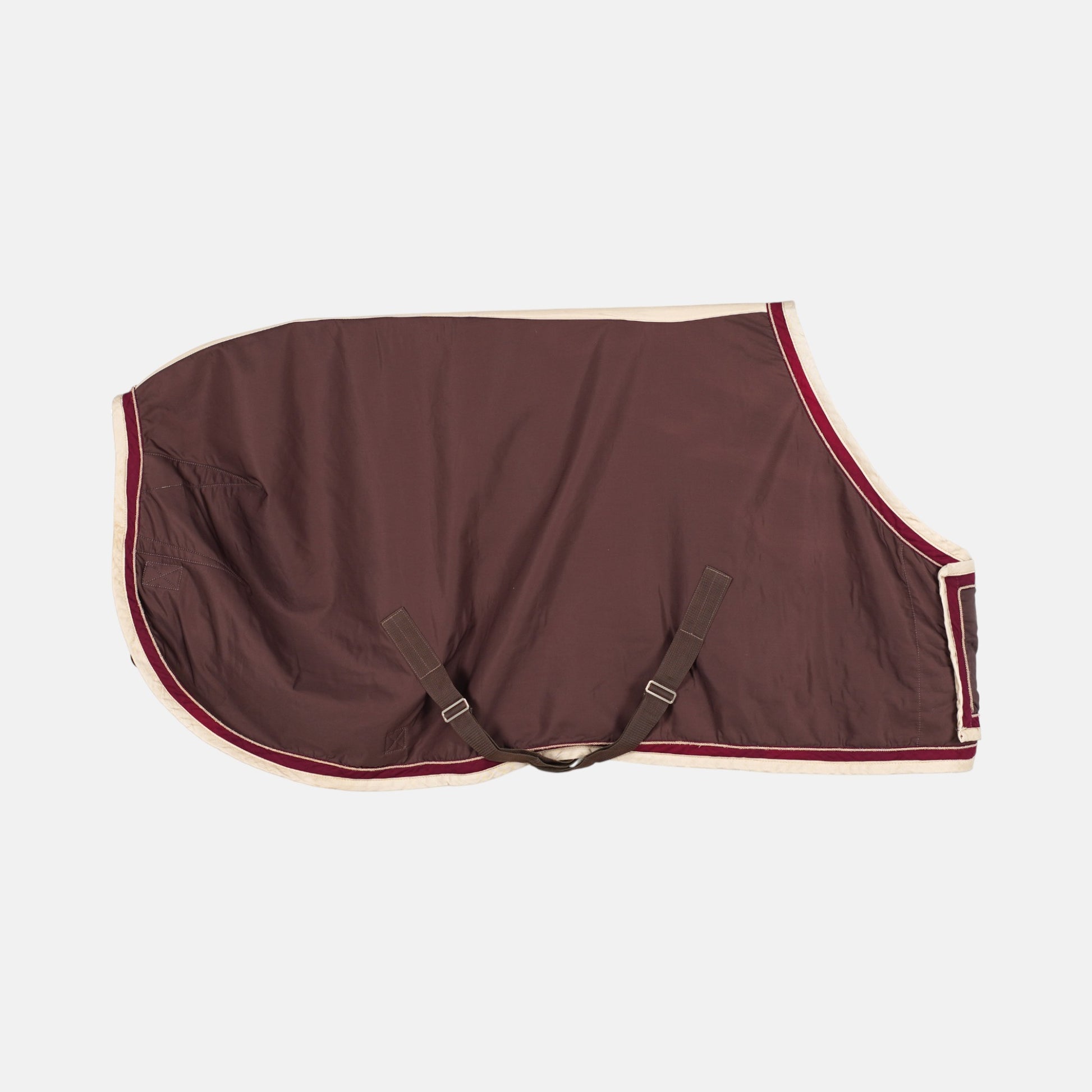 Transport- eller stalltäcke i brunt med en insida av borstad fleece, dubbla maggjordar och boglapp fram från Jacson.