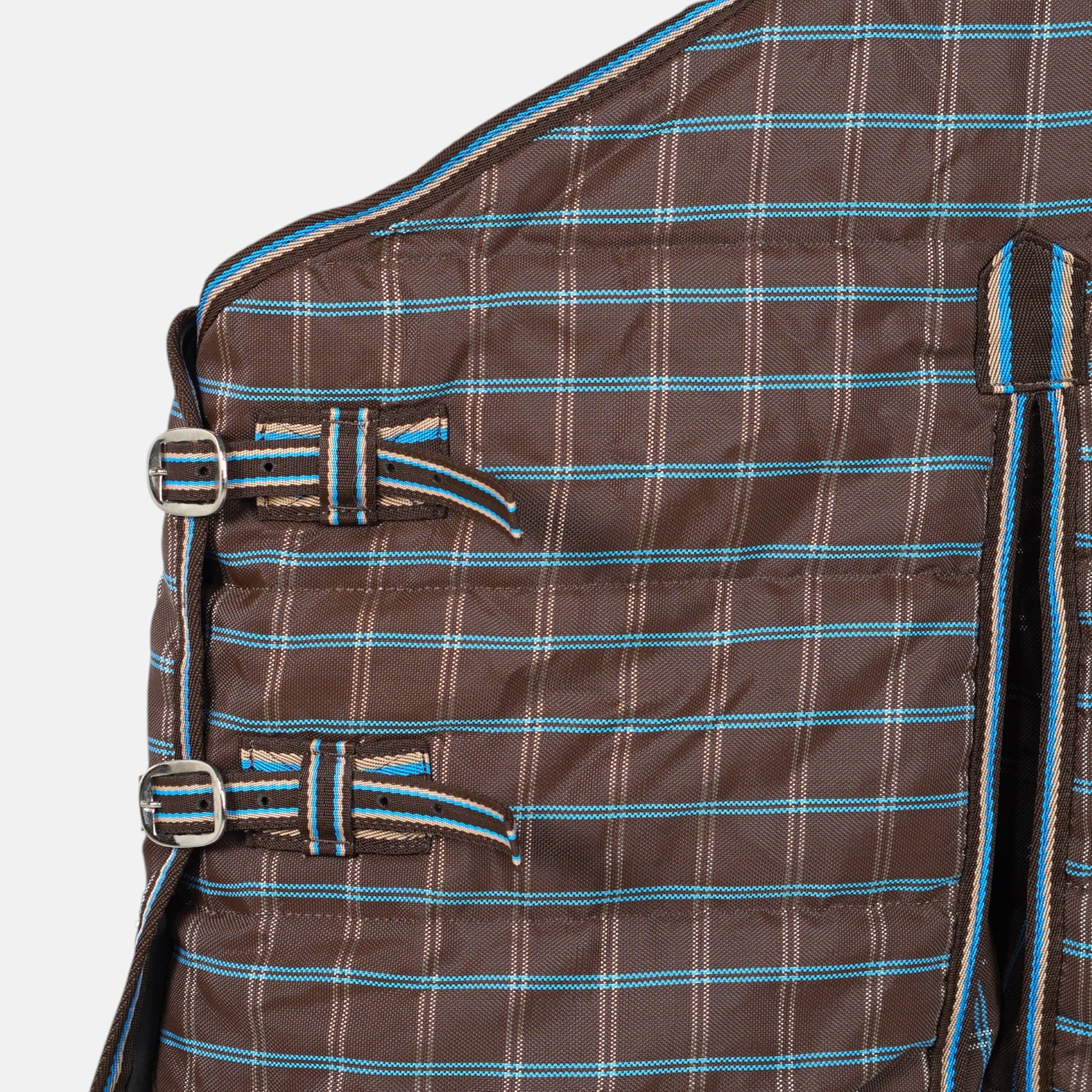 Rutigt stalltäcke i brunt från Biltema, med en fyllning som vi uppskattar till ca 200g.