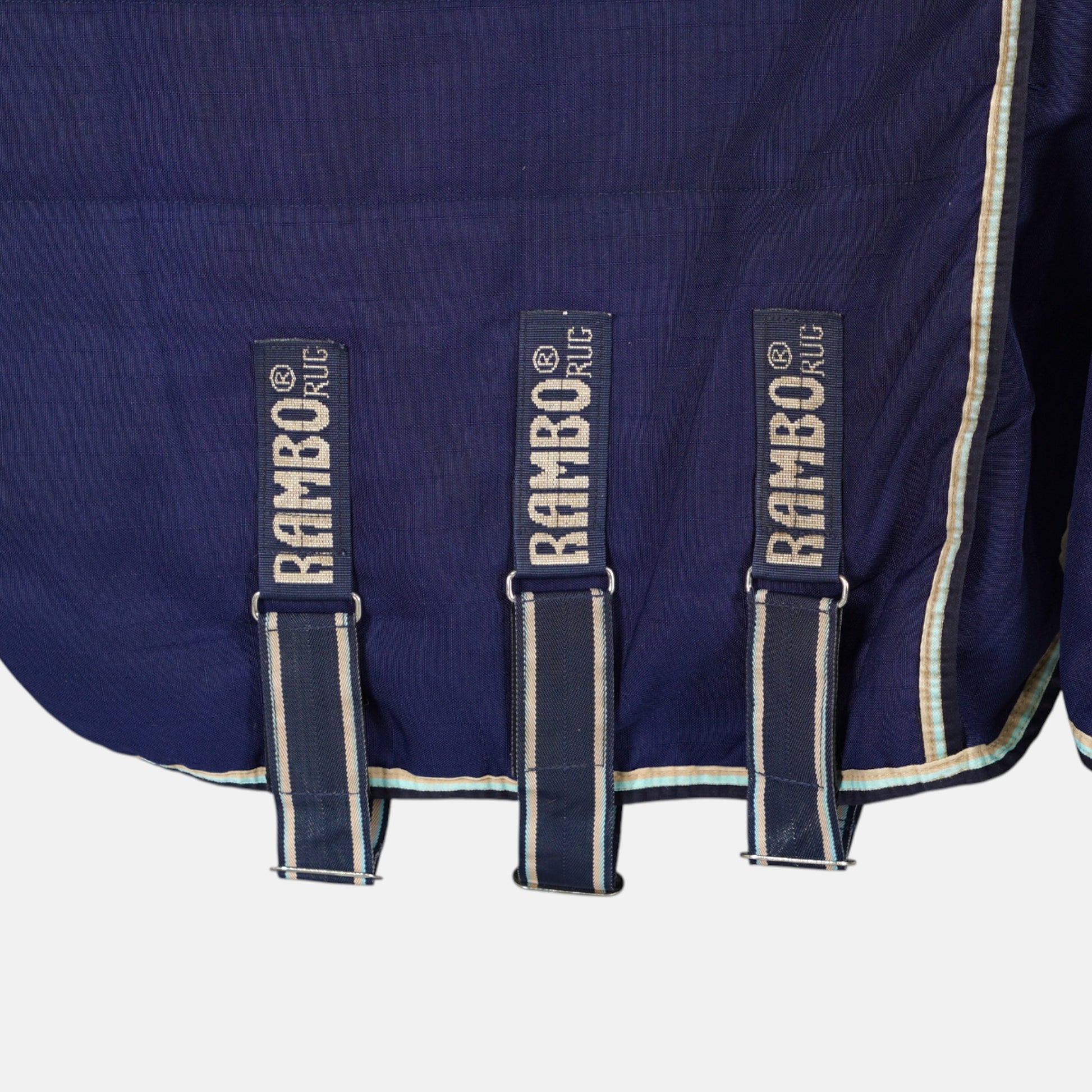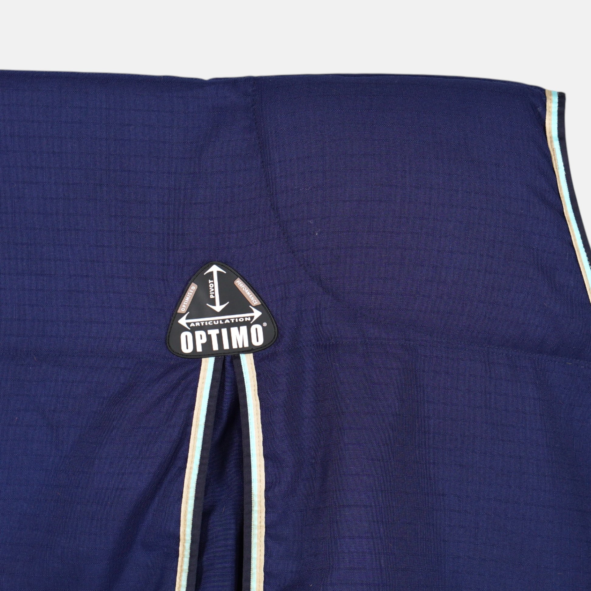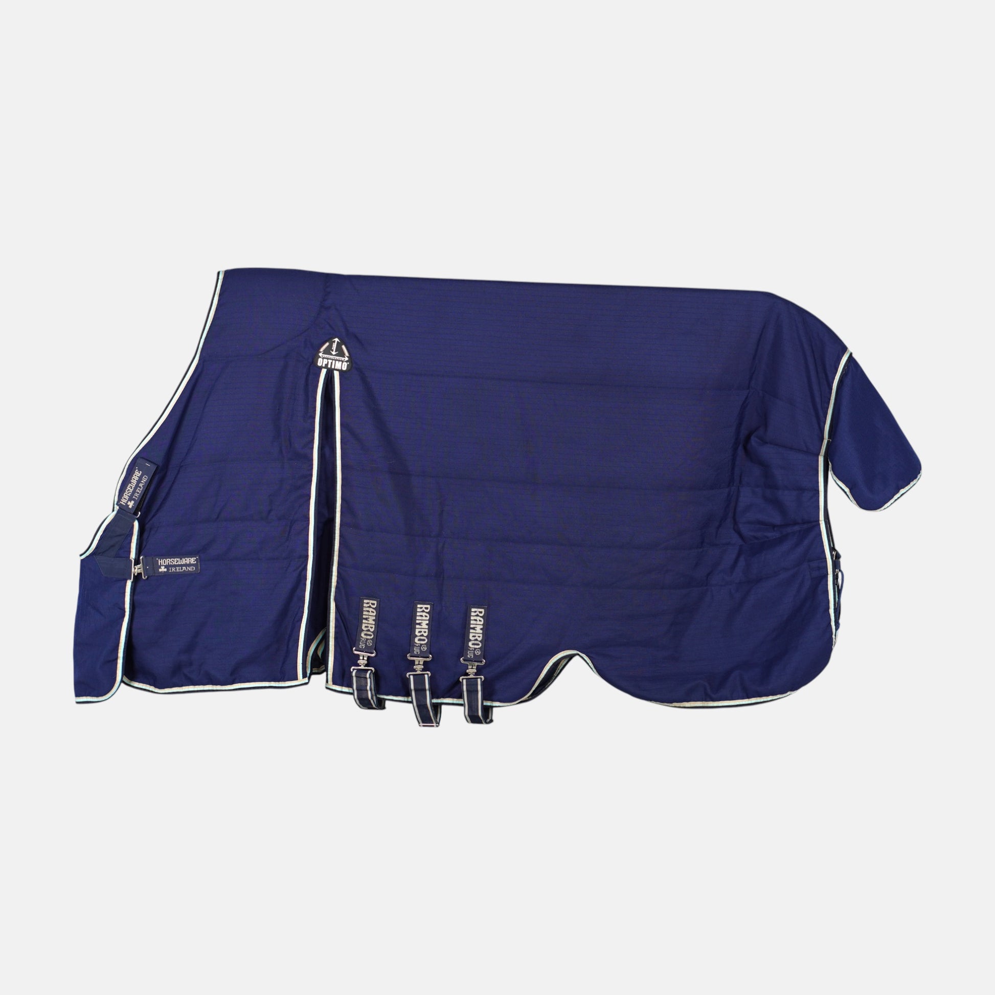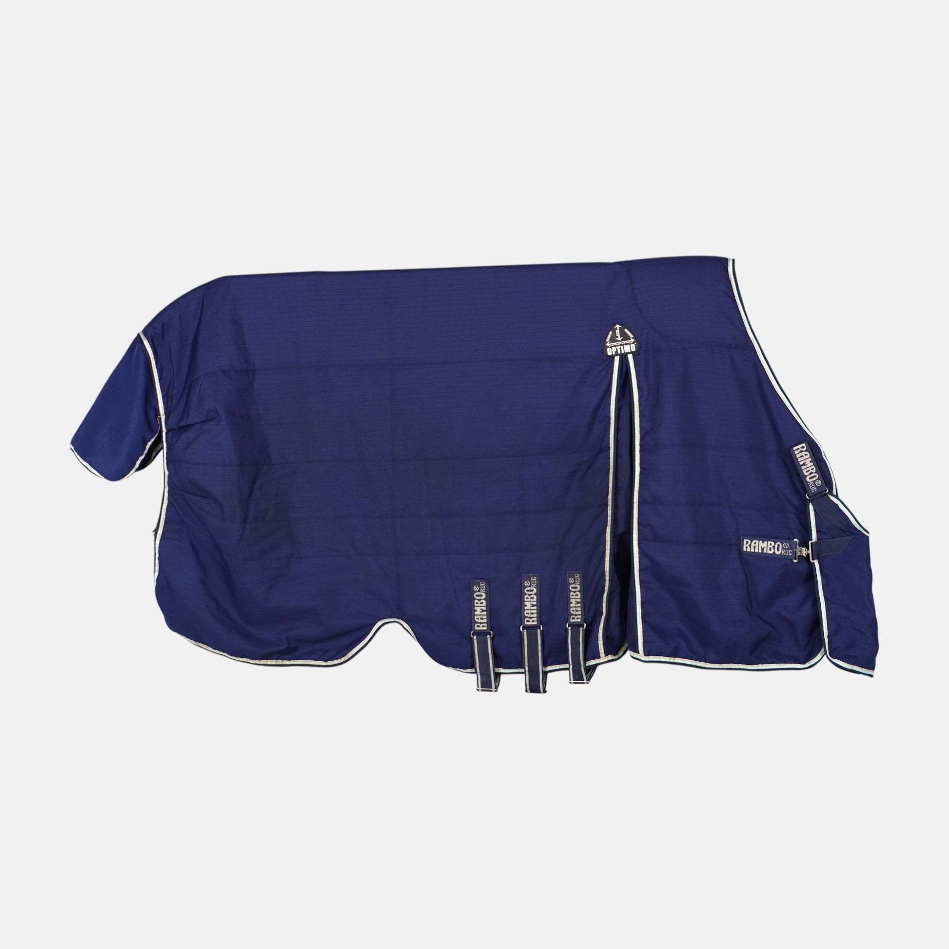 Stalltäcke Rambo Optimo i blått med 200g fyllning och avtagbara maggjordar från Horseware. Rambo Optimo har en generös passform och är bra för hästar som har en bred bog och behöver mer plats.