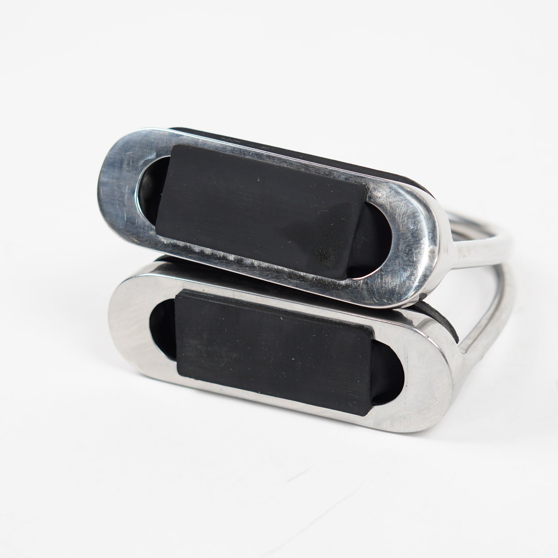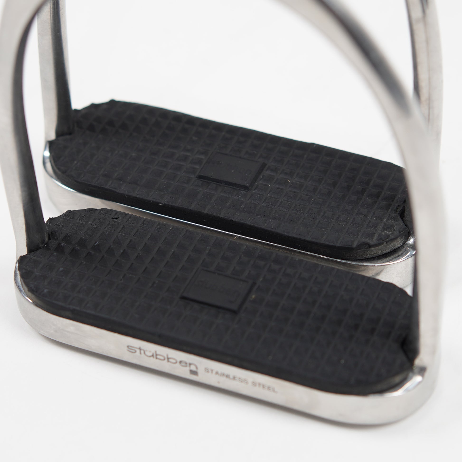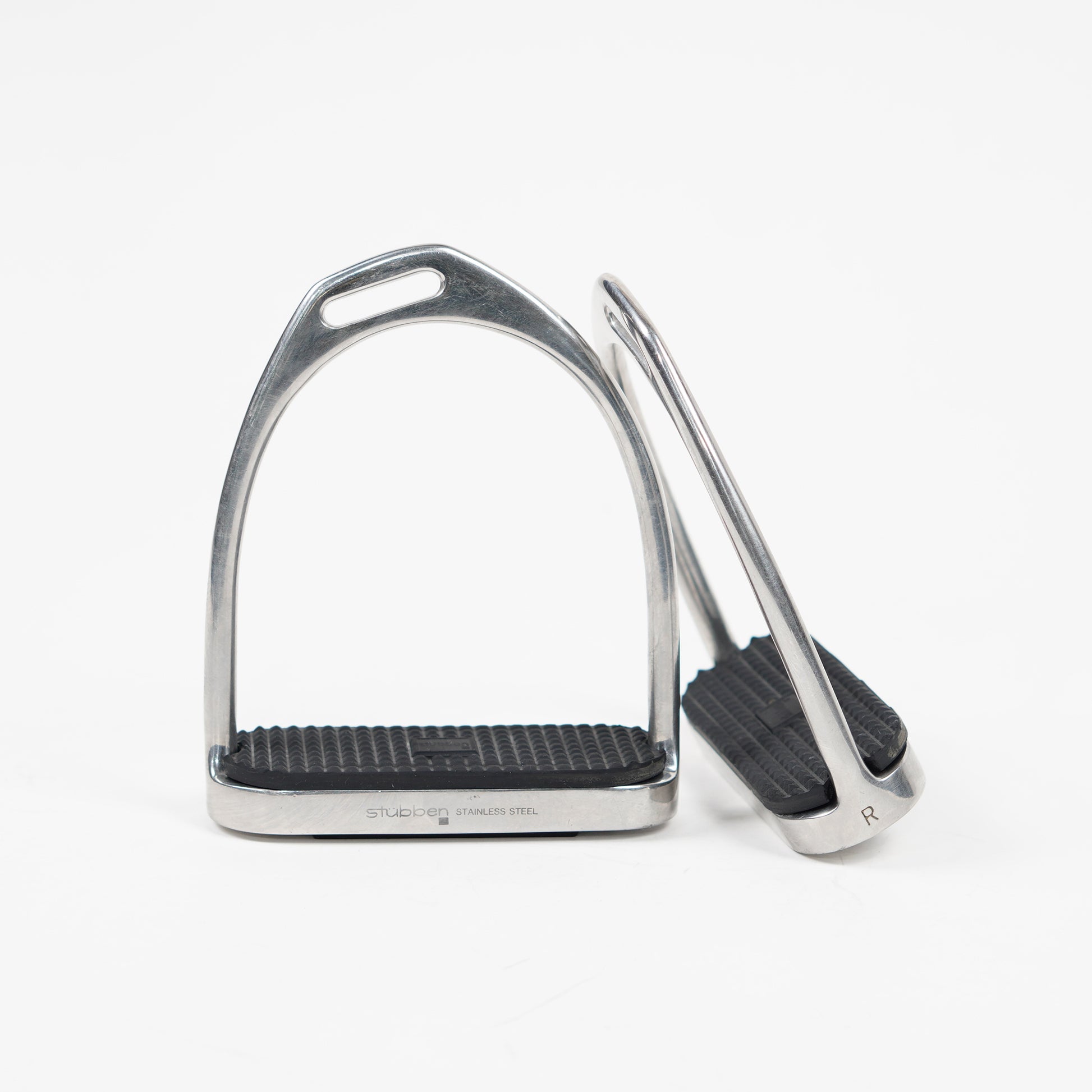 Stigbyglar i rostfritt stål med en förskjuten infästningsögla för att få en bättre vinkel och därmed grepp med foten.