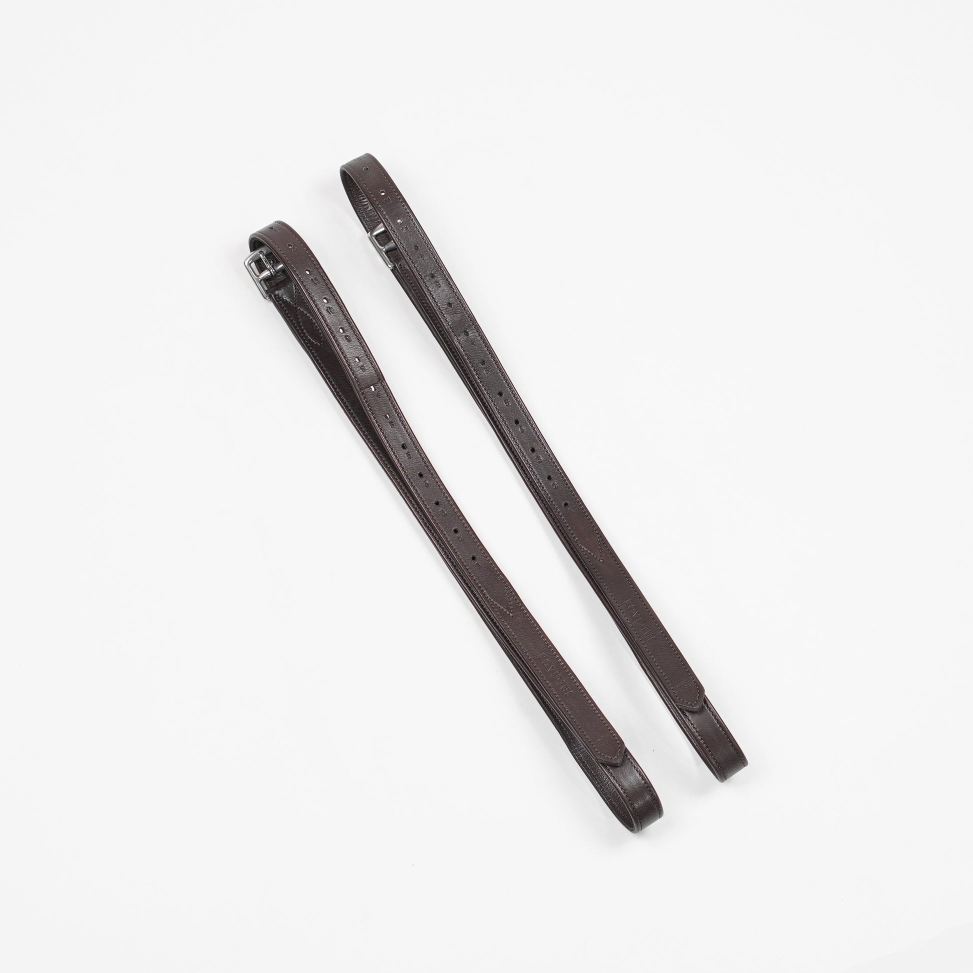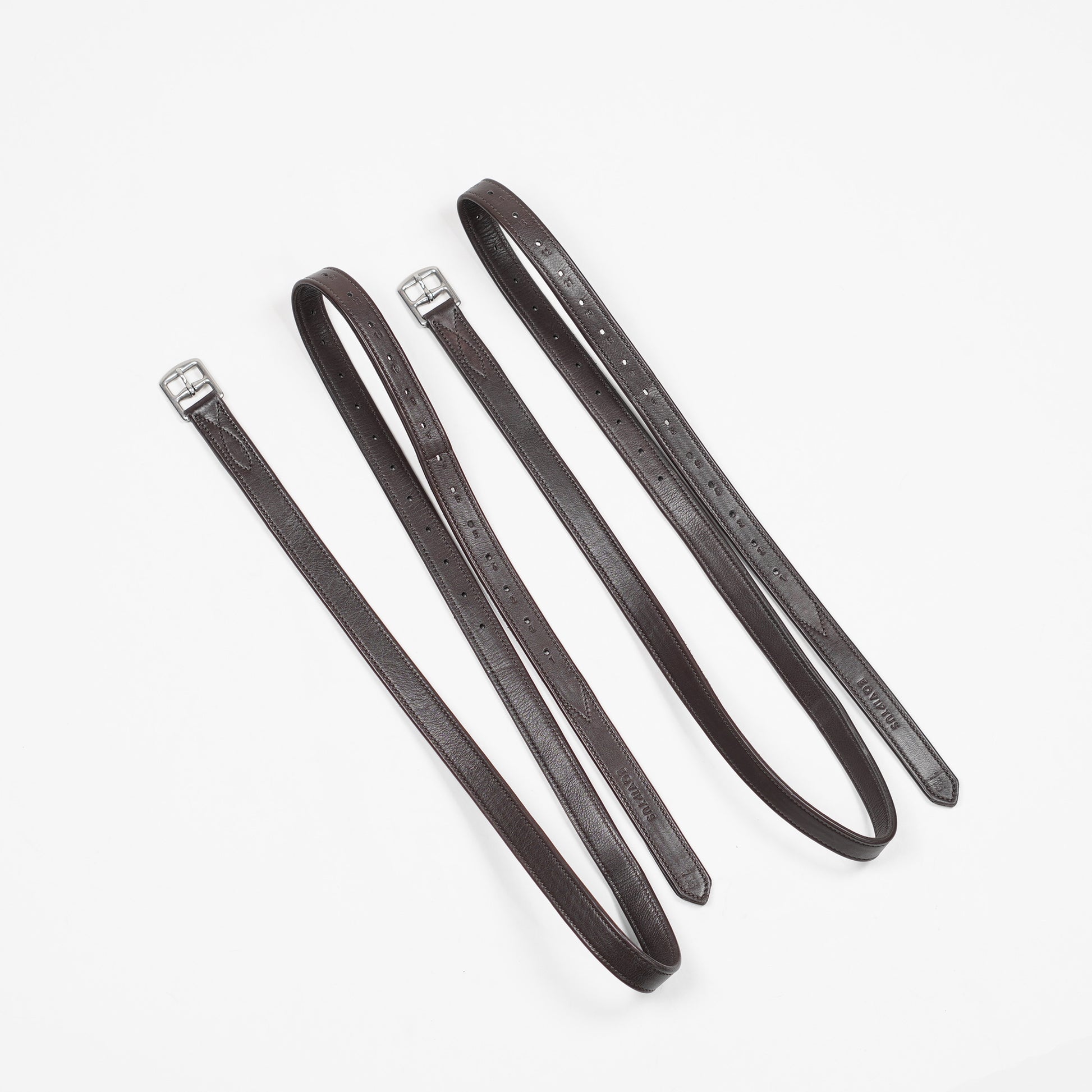 Bruna stigläder i kalvskinn med nylonförstärkt kärna från Eqviptus. Stigläderna är i ett tillsynes oanvänt skick.