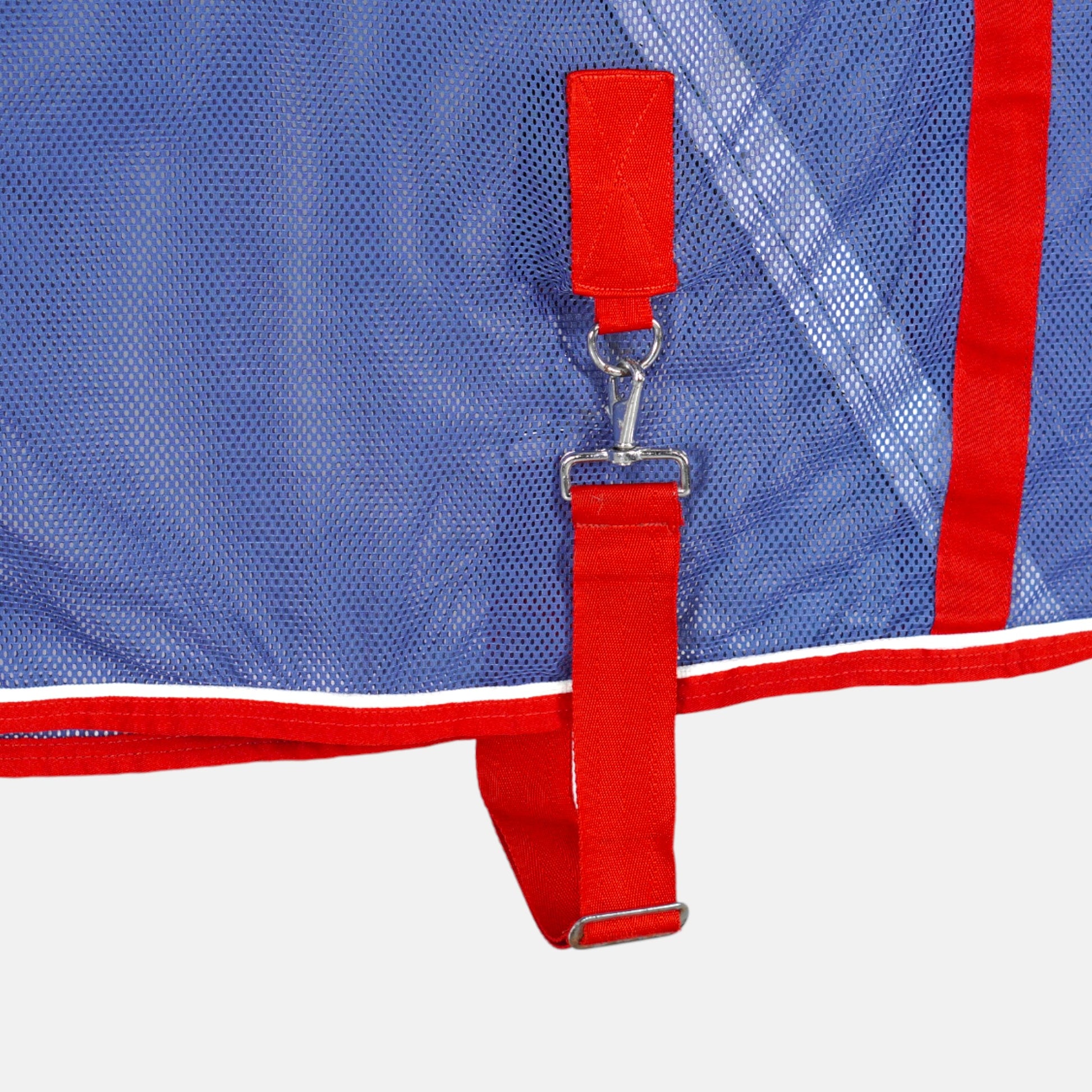 Blått nättäcke / svettäcke med teddy vid manken och avtagbar maggjord från Showmaster.