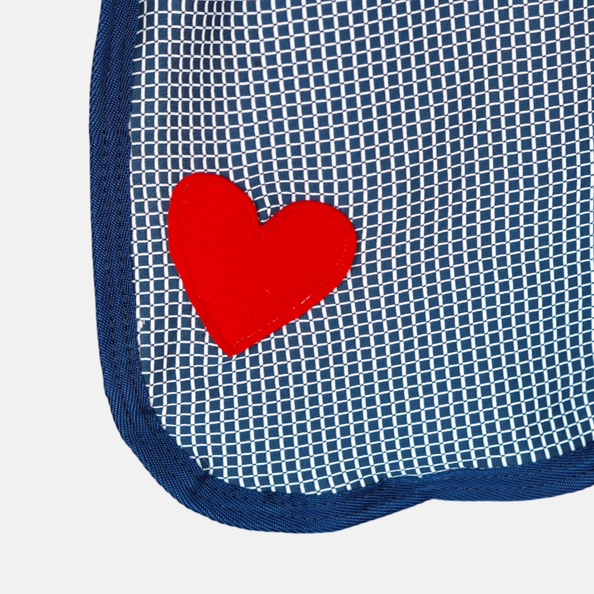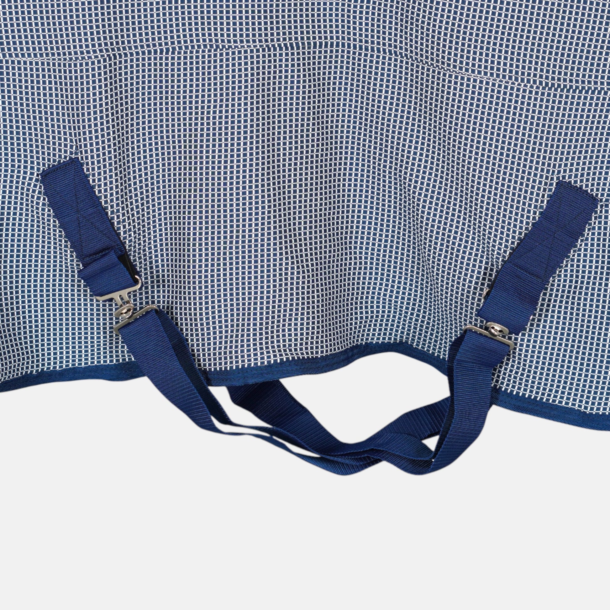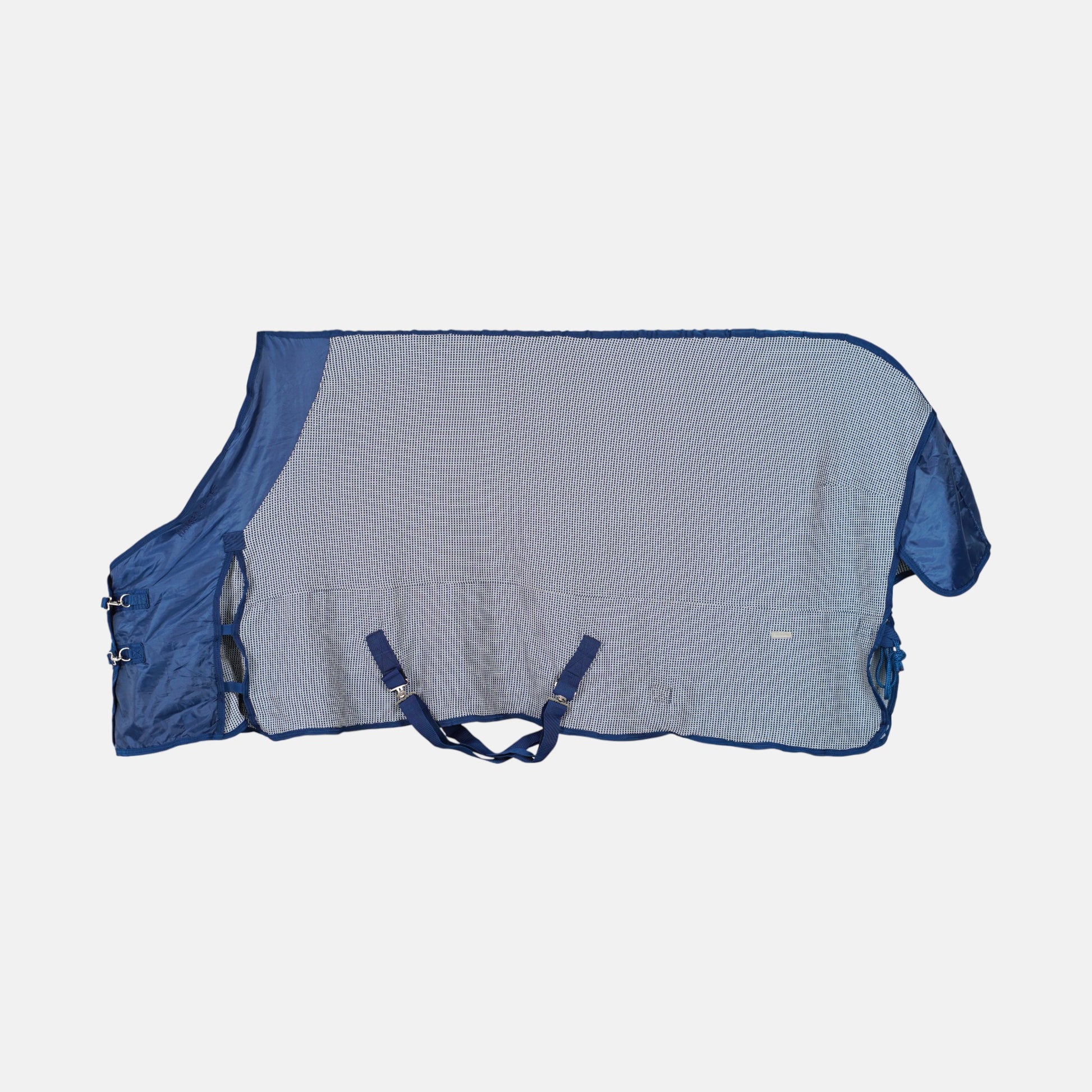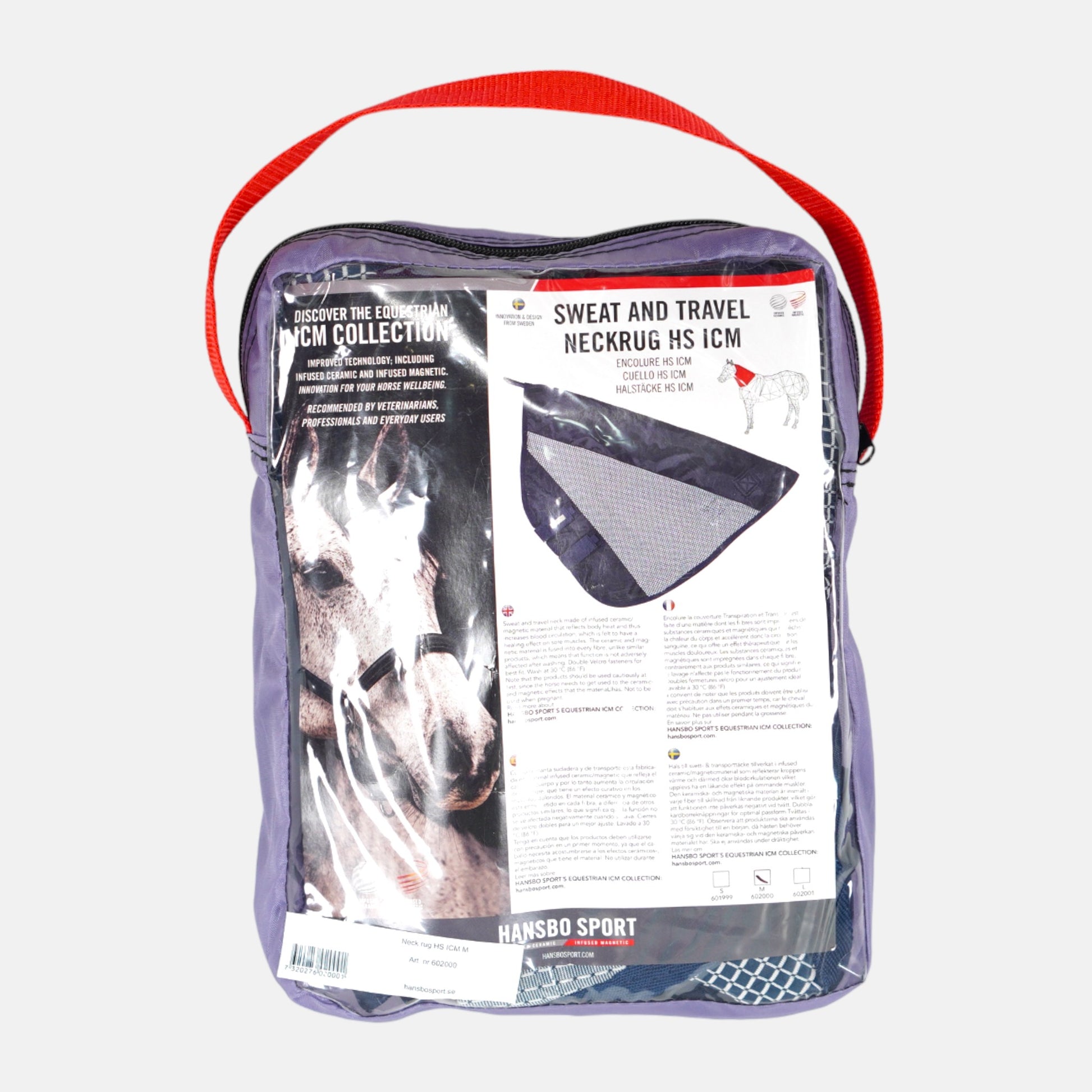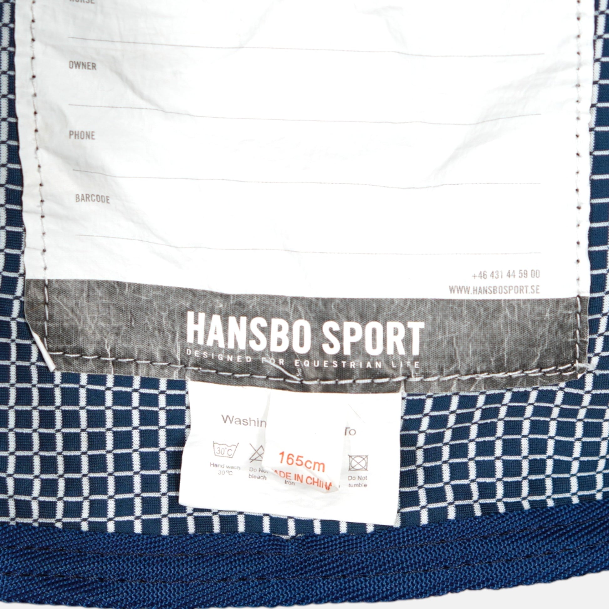 Blått svett- och transporttäcke med dubbla maggjordar och en avtagbar hals från Hansbo Sport. Täcket är i ett använt men mycket bra skick, det hade ett mindre hål bak på rumpan, vilket vi har lagat, se bild.