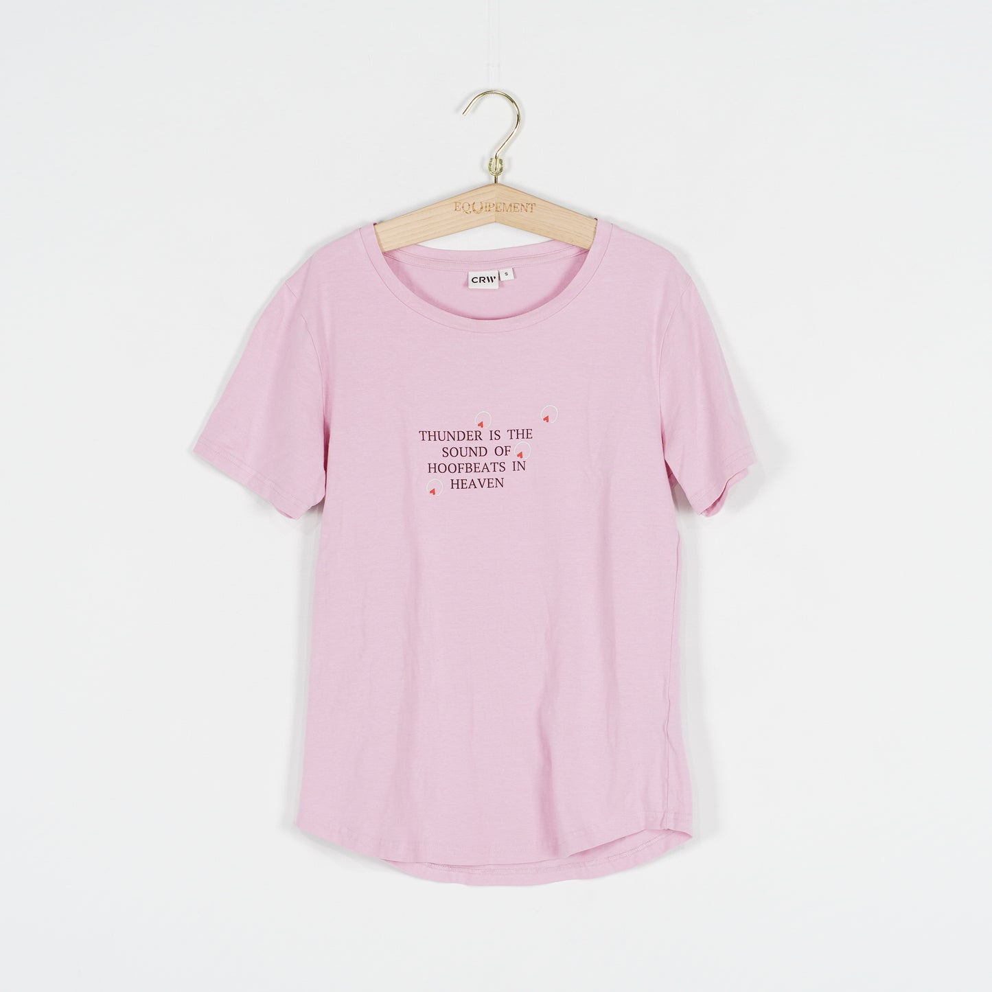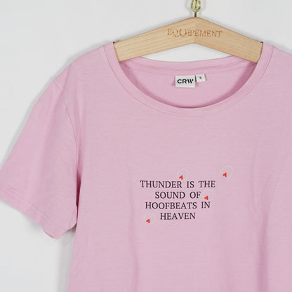 Rosa t-shirt i bomull med citatet "Thunder is the sound of hoofbeats in heaven" från CRW.