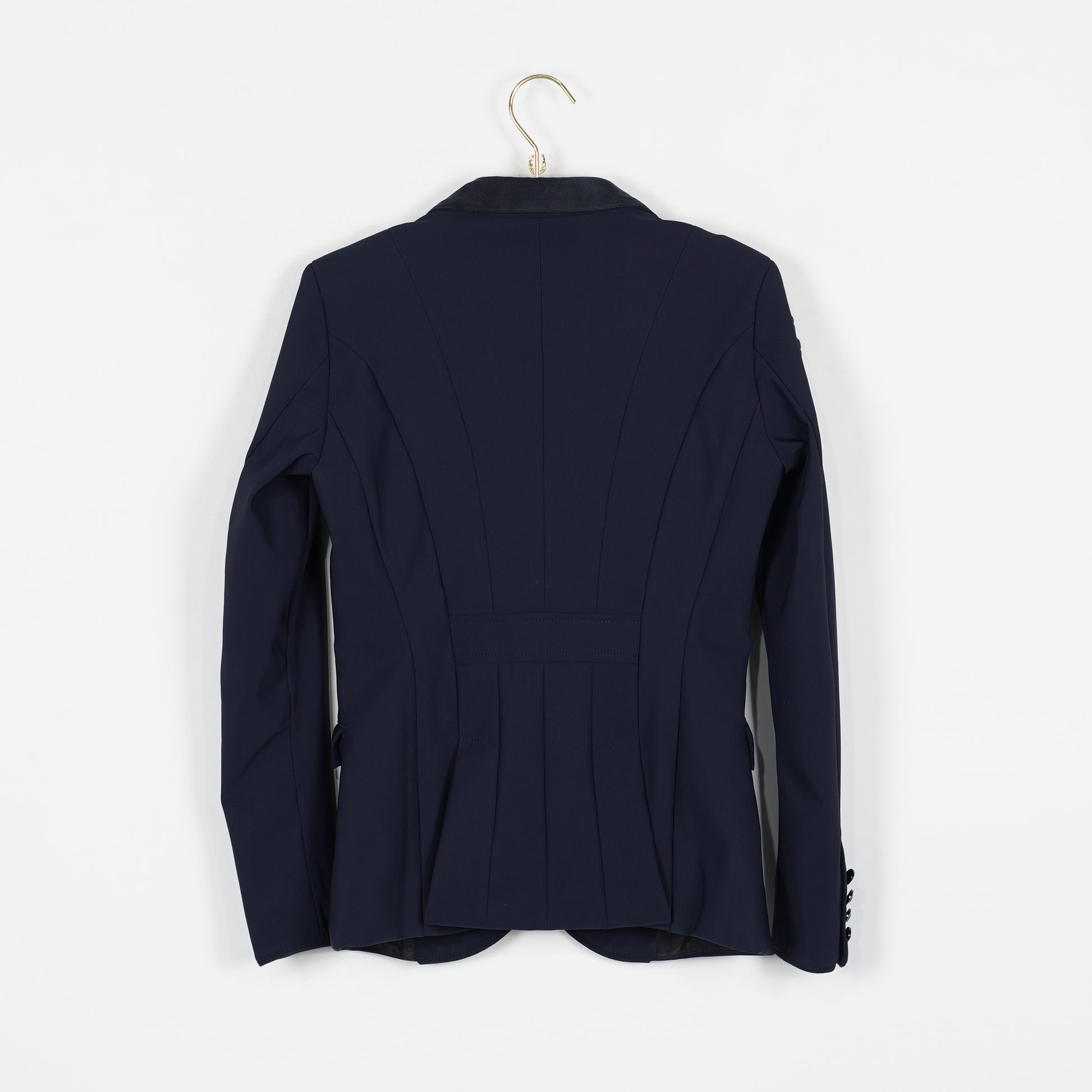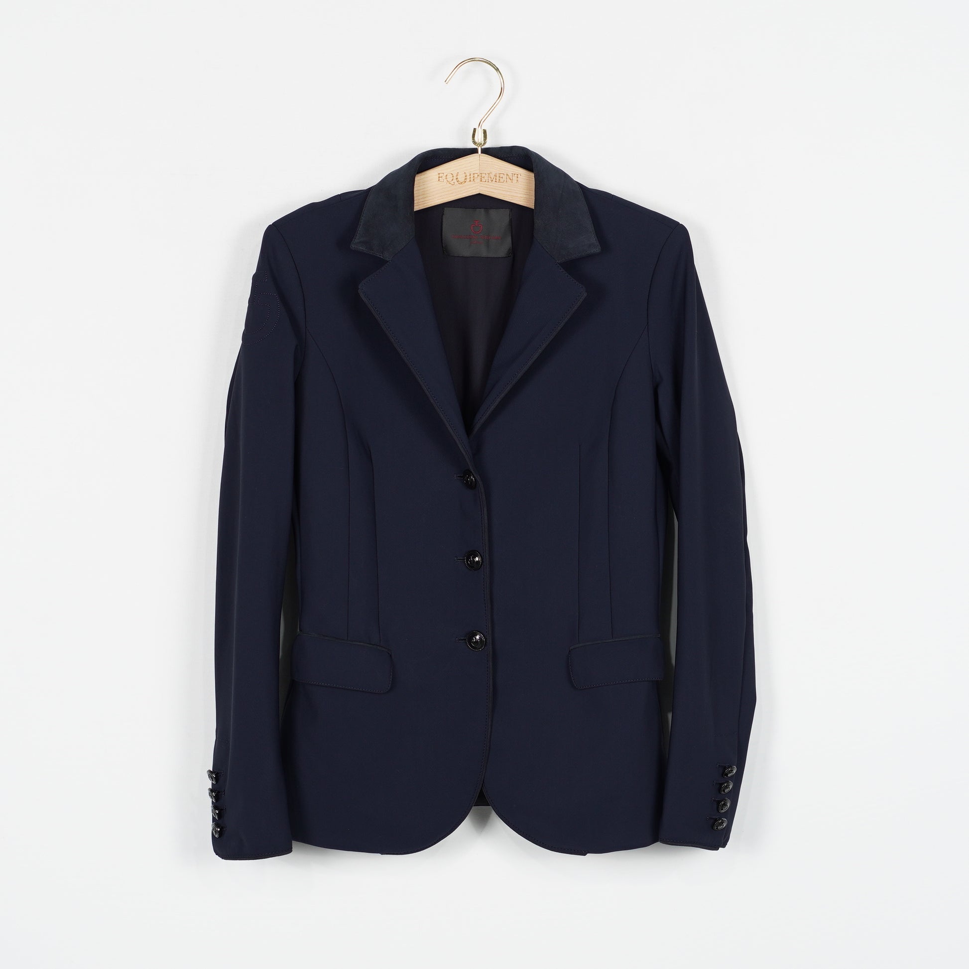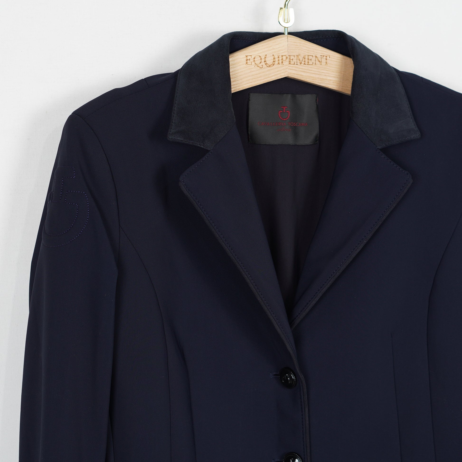 Snygg tävlingskavaj i mörkblått stretchigt material och med en krage i syntetmocka från Cavalleria Toscana. Det finns enstaka små hål i fodret på insidan, se bilder. I övrigt är kavajen i ett bra skick.