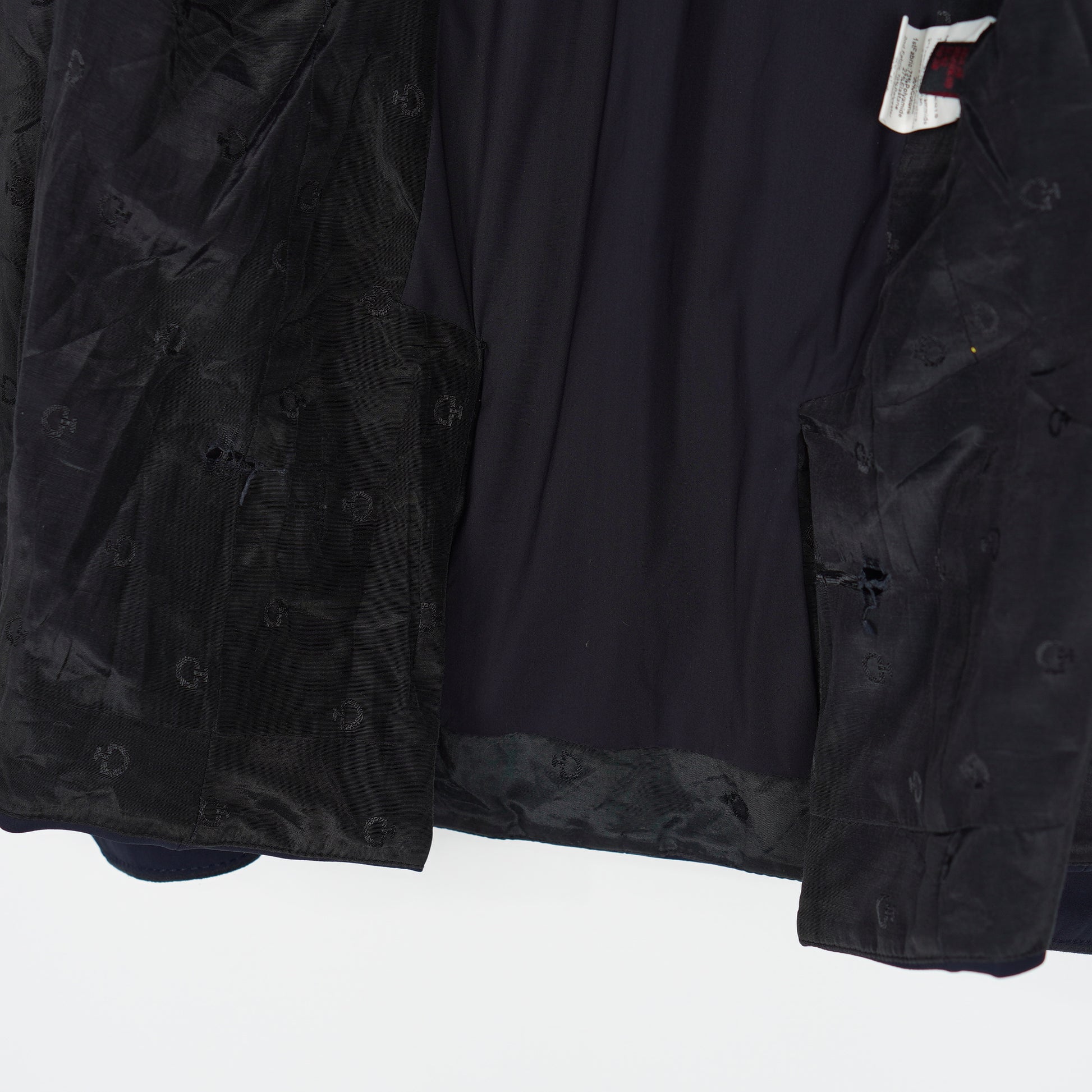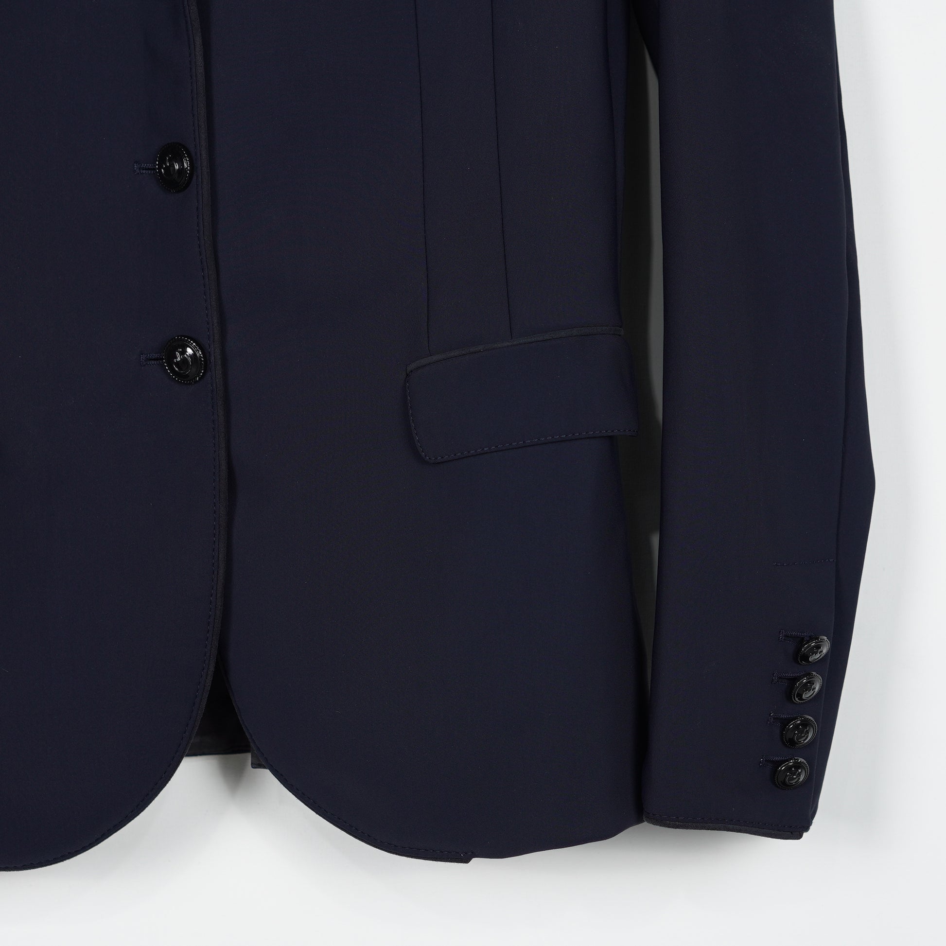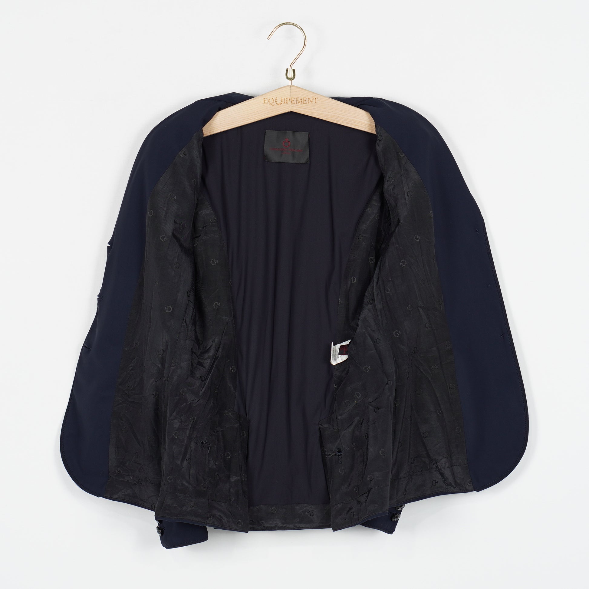 Snygg tävlingskavaj i mörkblått stretchigt material och med en krage i syntetmocka från Cavalleria Toscana. Det finns enstaka små hål i fodret på insidan, se bilder. I övrigt är kavajen i ett bra skick.