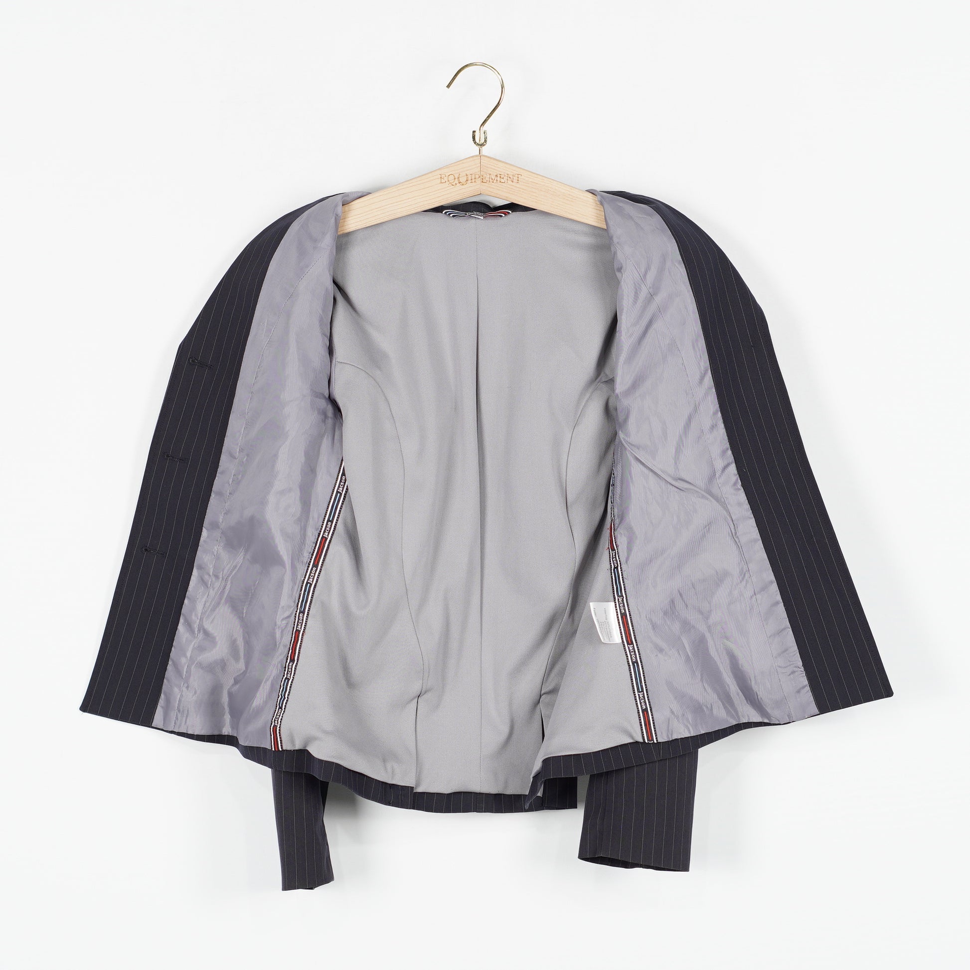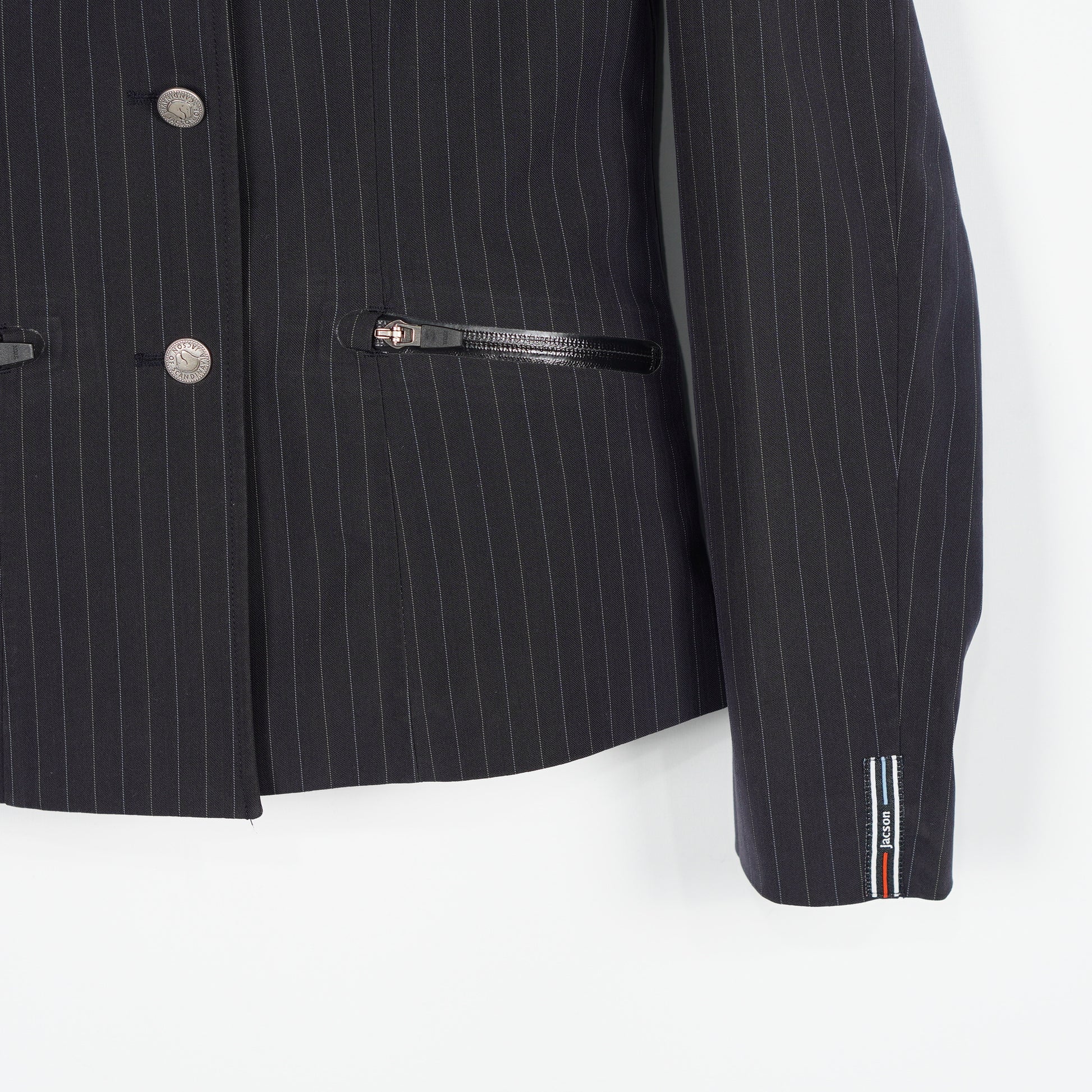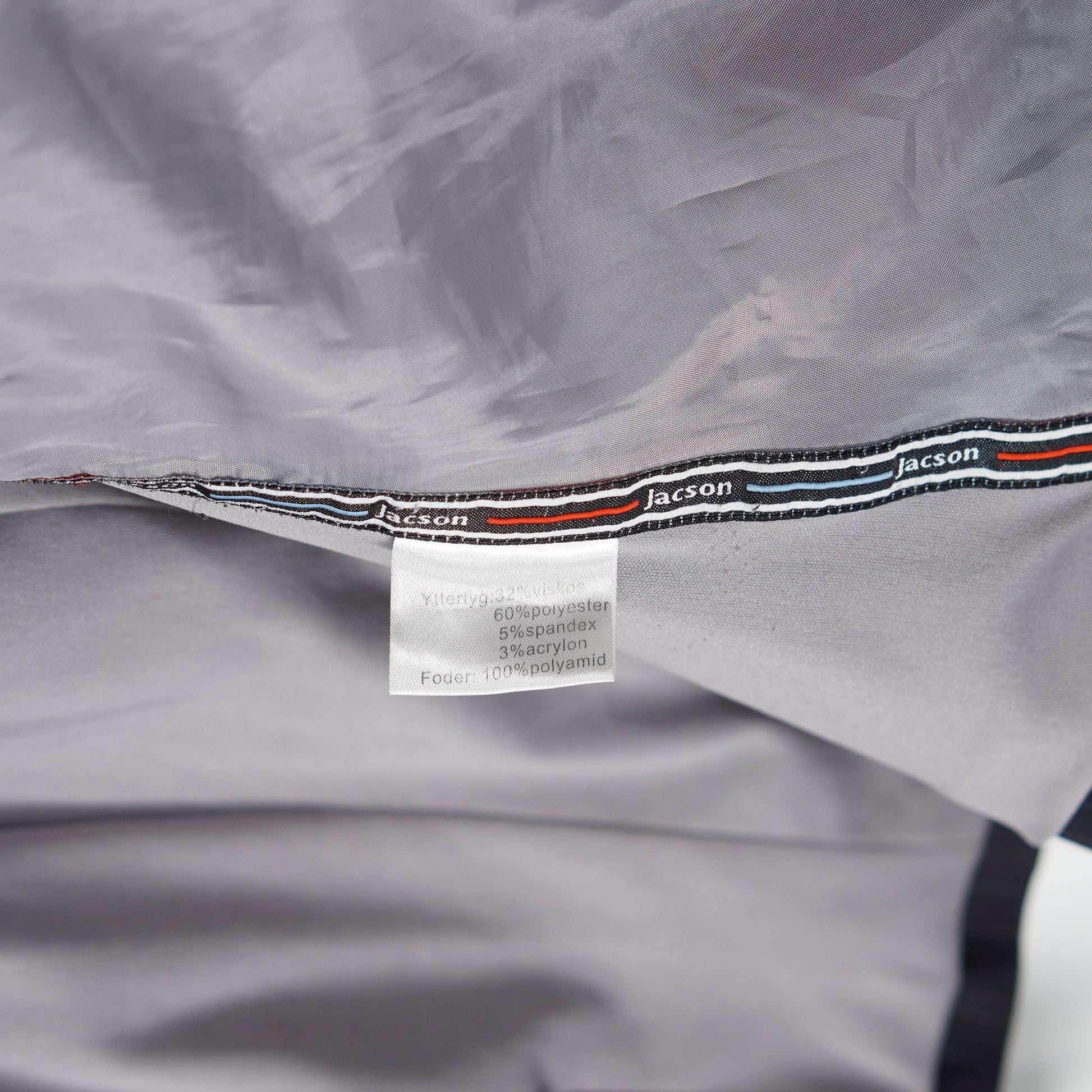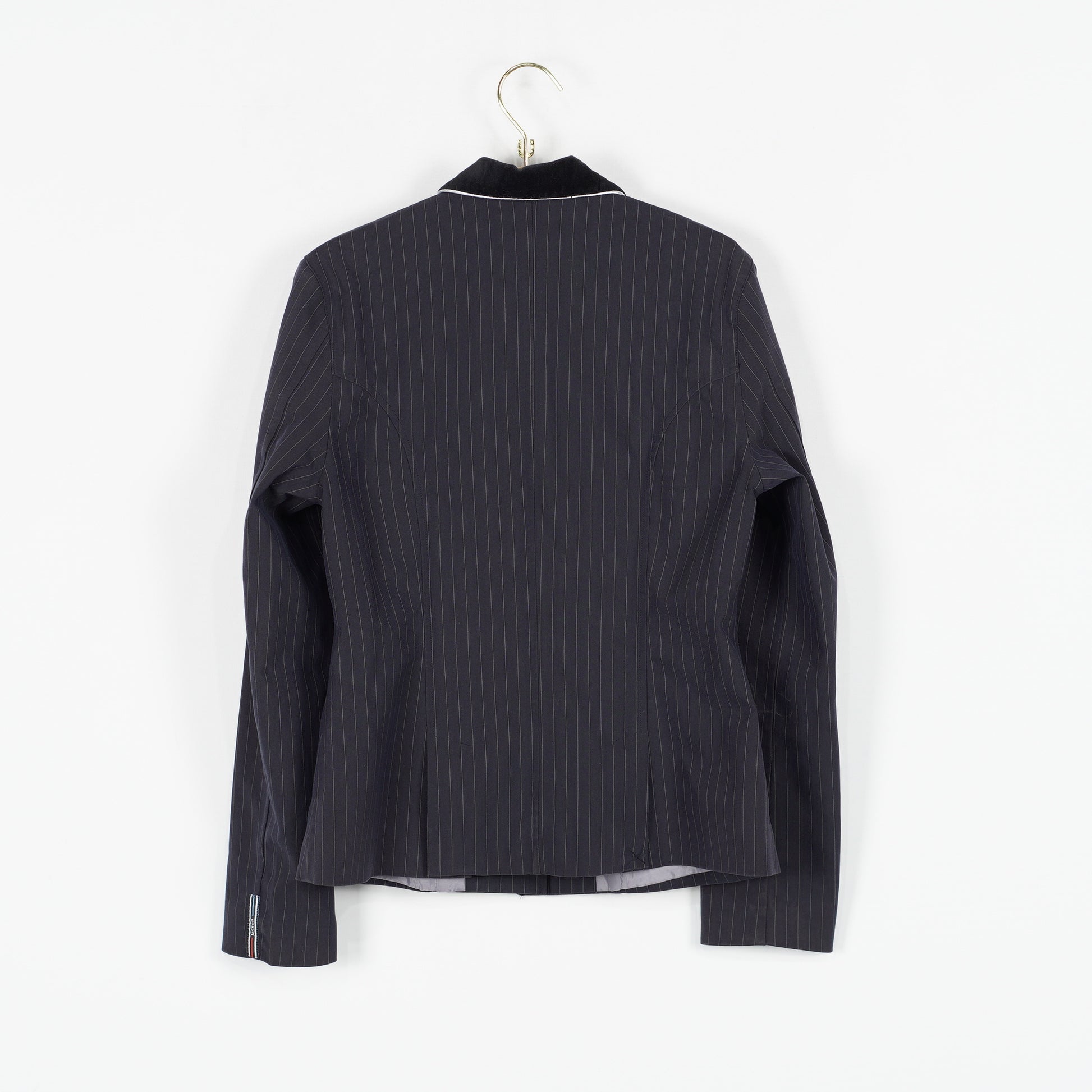 En mörkgrå tävlingskavaj med blåa toner, kritstrecksränder och sammetskrage från Jacson.
