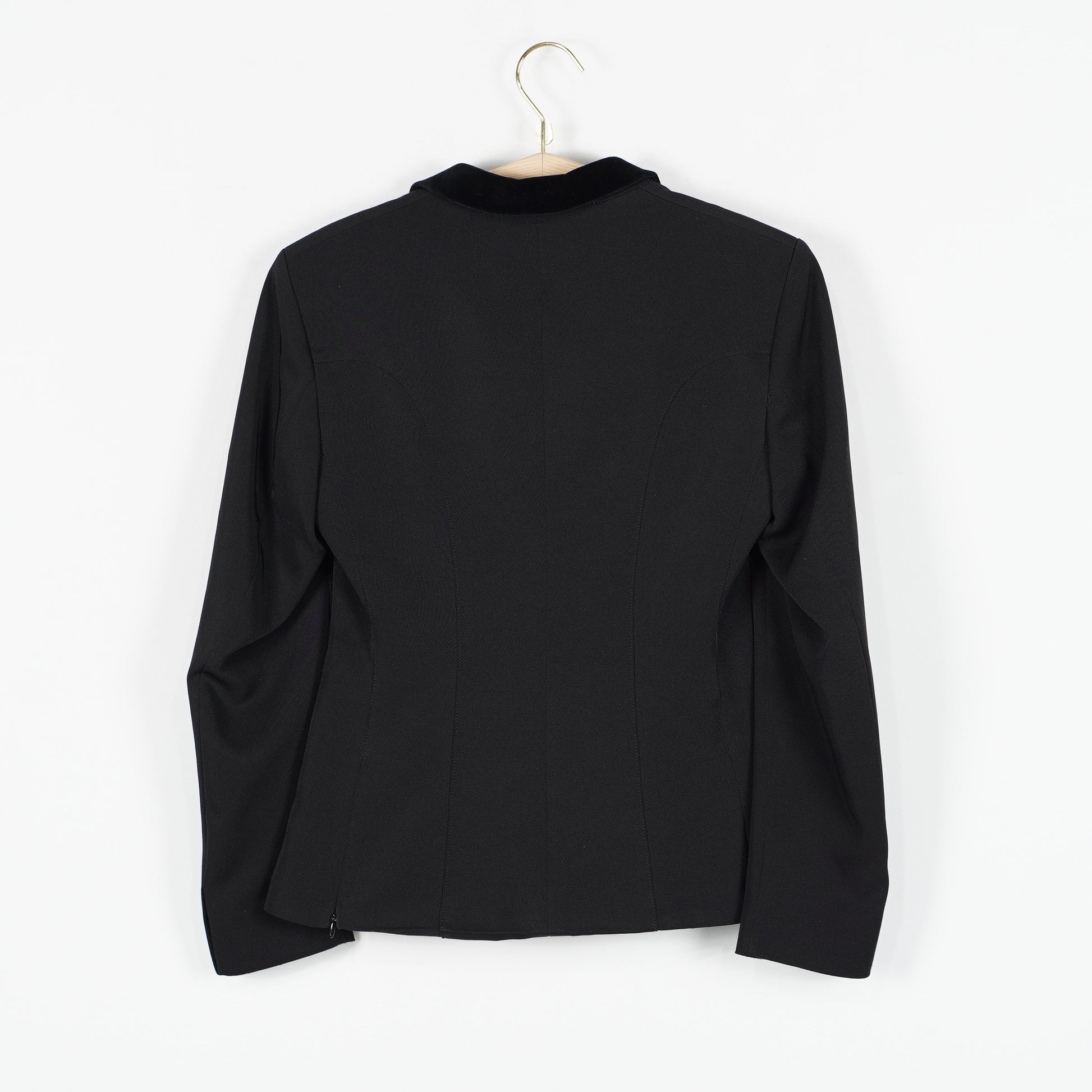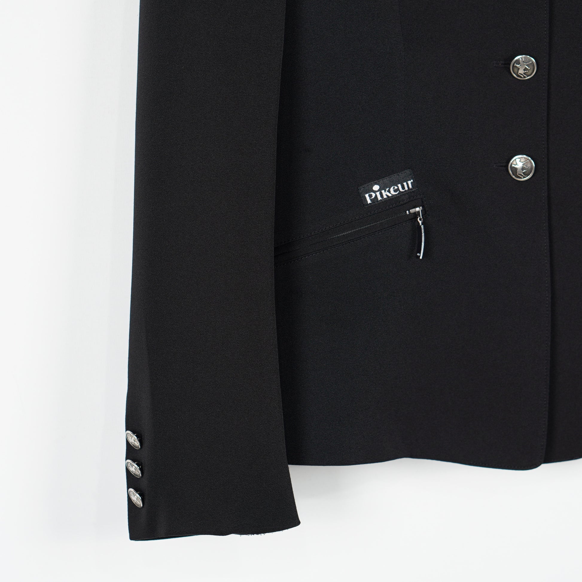 Pikeurs klassiska tävlingskavaj Skarlett i svart med sammetskrage i en lång modell. Kavajen är i ett bra skick med har lite slitage på linern i ländryggen (se bild).