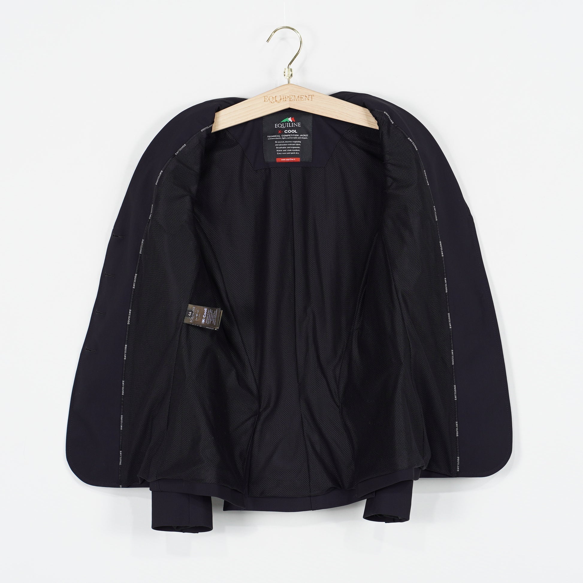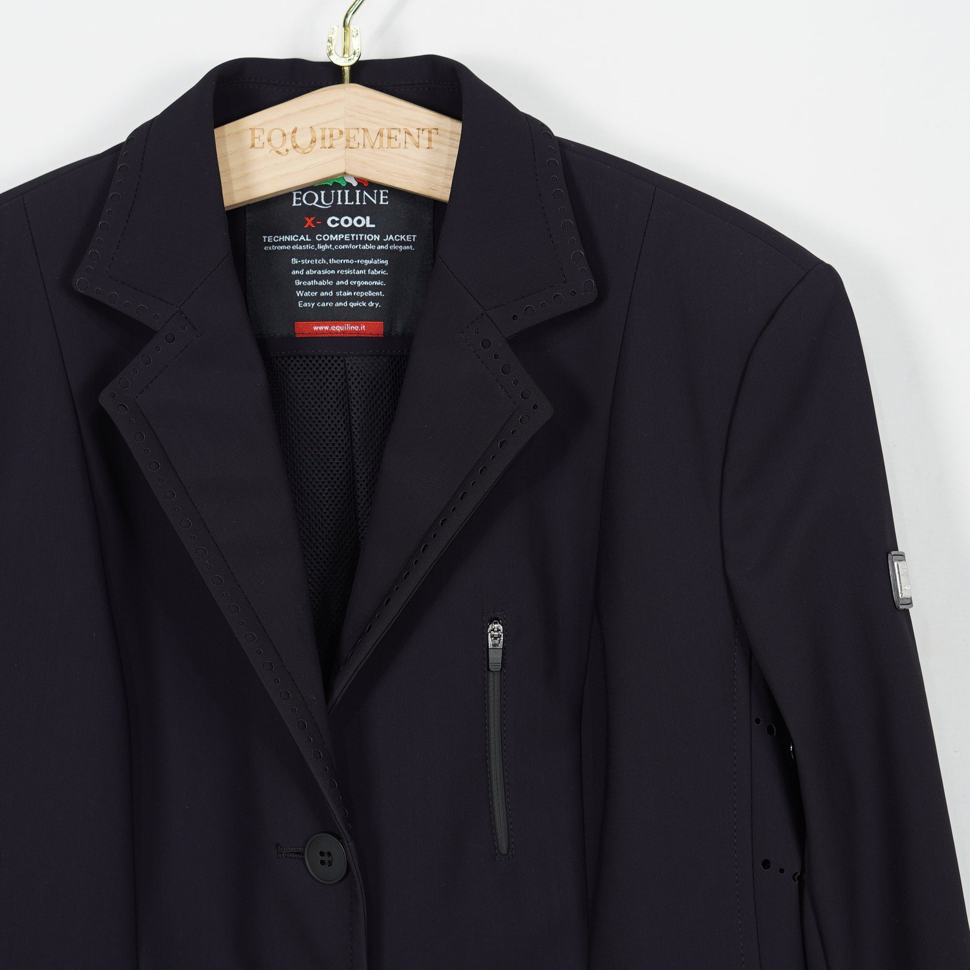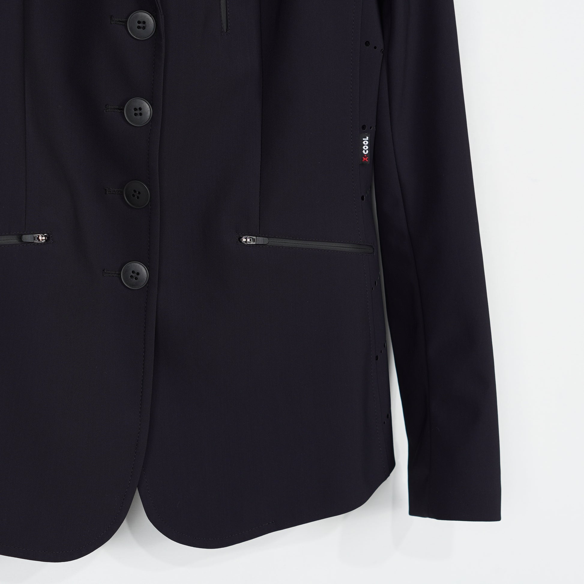 Supersnygg tävlingskavaj i ett tunt stretchigt material och meshfoder från Equilines X-Cool serie. Kavajen har en mörkblå färg, fickor med dragkedja samt perforerade detaljer längs sidorna vilket ger ett sportigt men elegant intryck. Kavajen är i ett mycket sparsamt använt skick och säljs med originalgalge samt resegarderob.