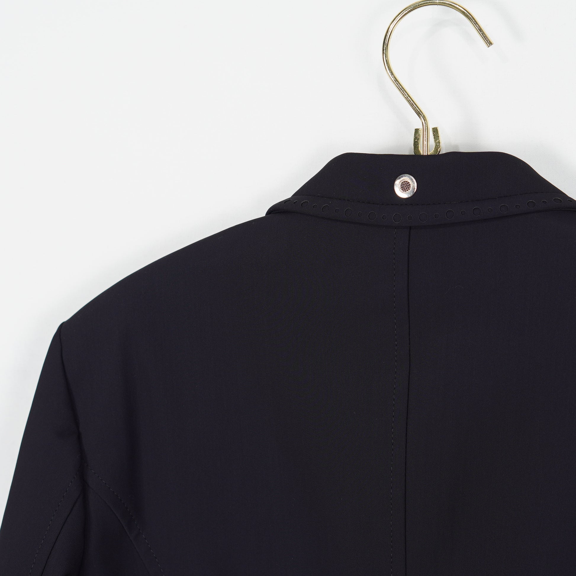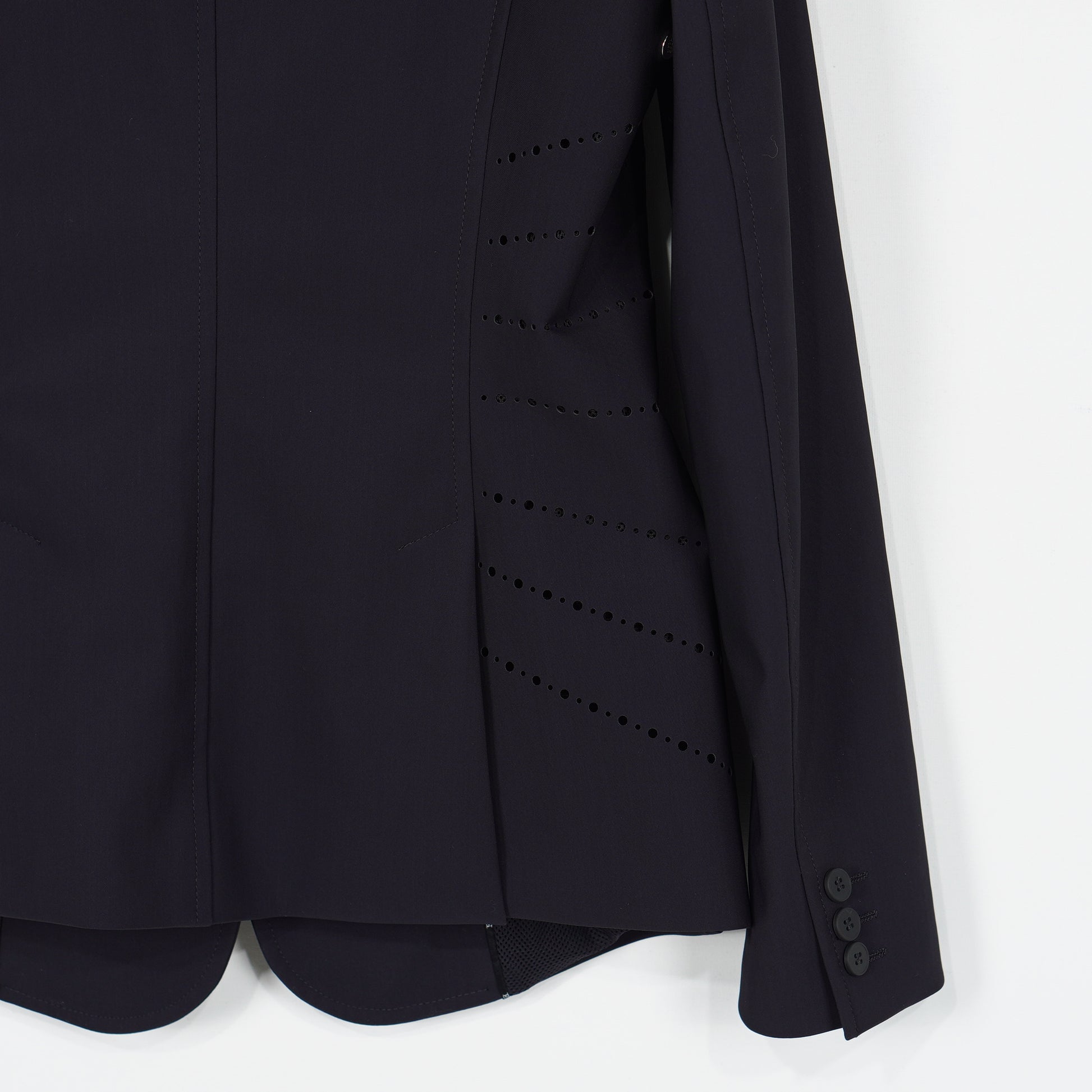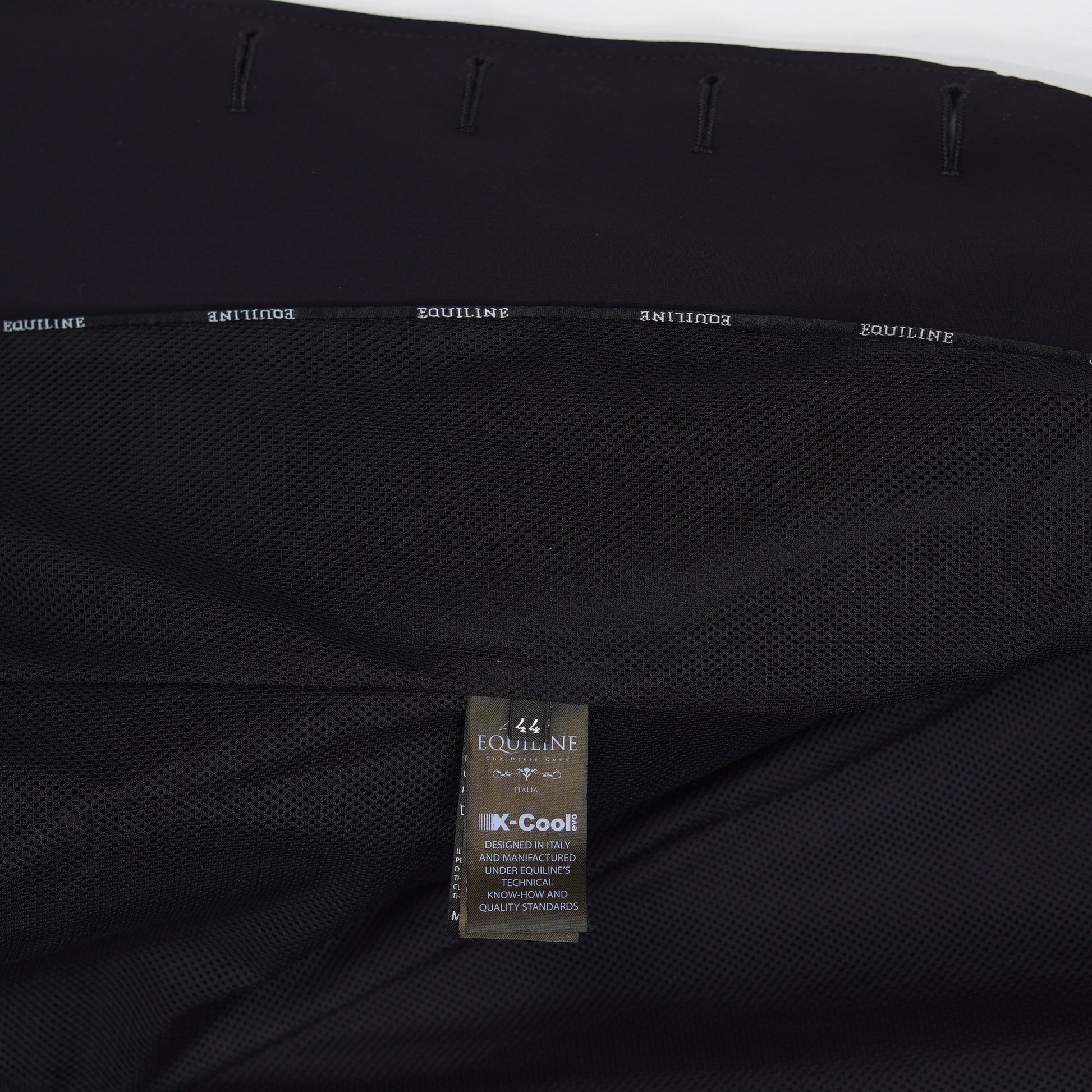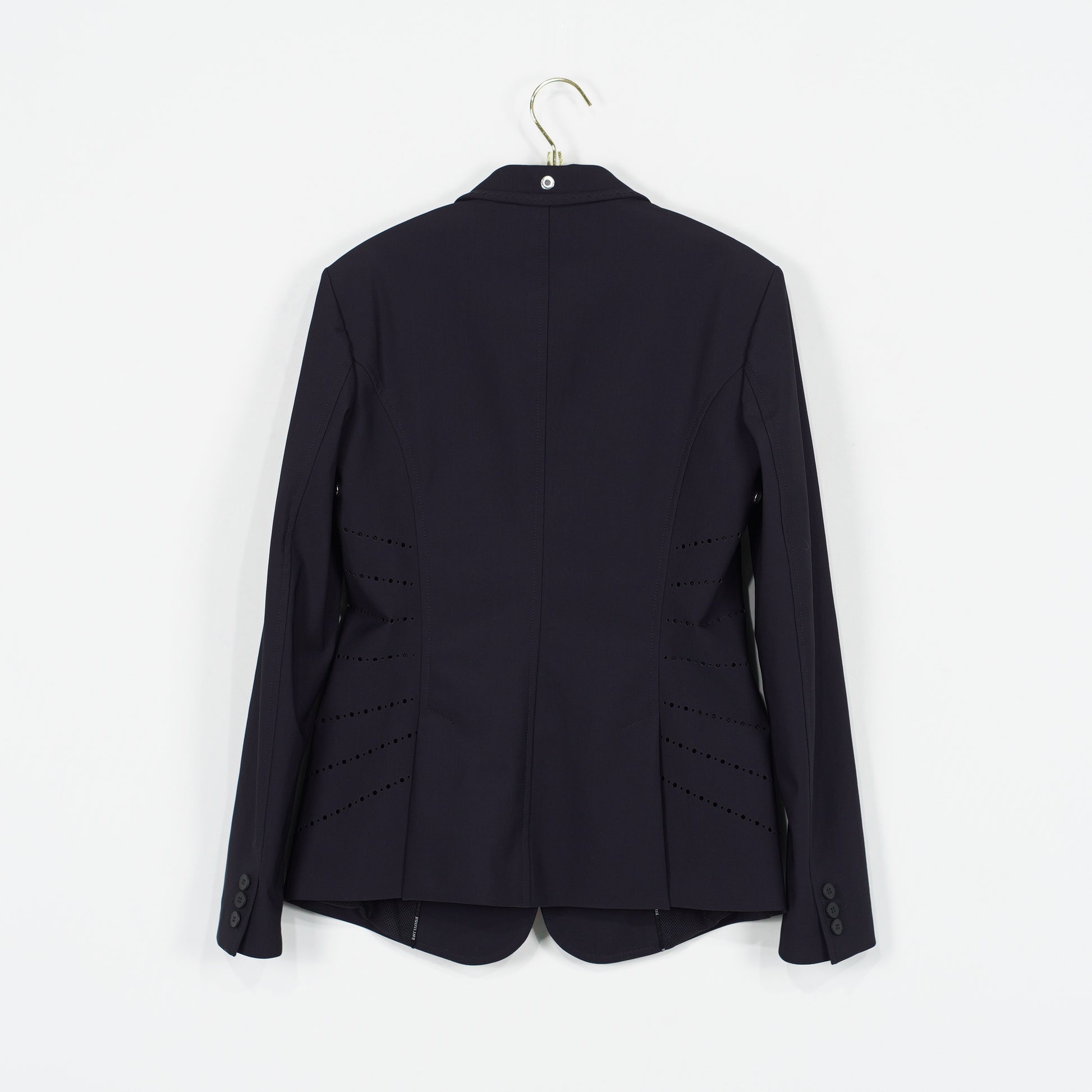 Supersnygg tävlingskavaj i ett tunt stretchigt material och meshfoder från Equilines X-Cool serie. Kavajen har en mörkblå färg, fickor med dragkedja samt perforerade detaljer längs sidorna vilket ger ett sportigt men elegant intryck. Kavajen är i ett mycket sparsamt använt skick och säljs med originalgalge samt resegarderob.