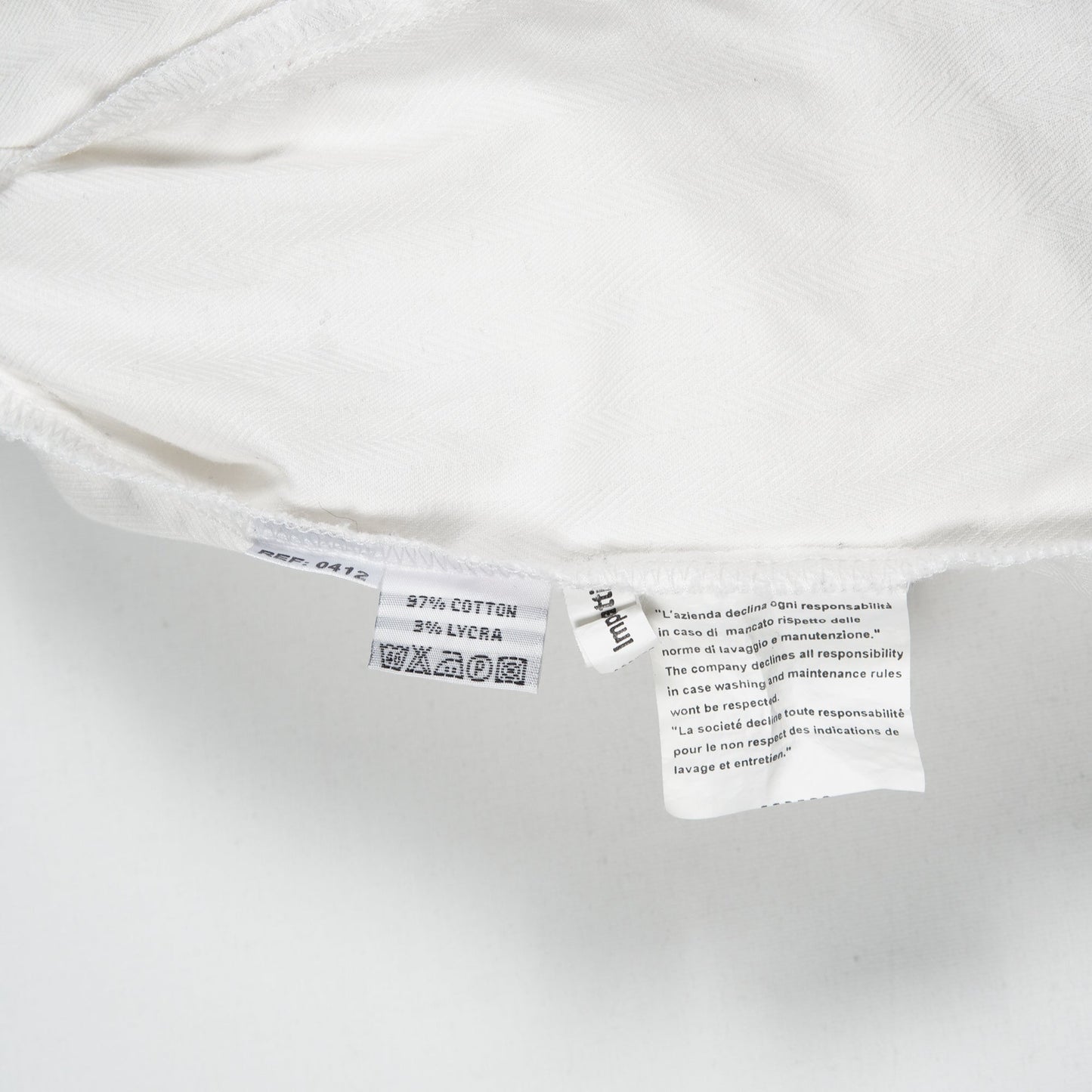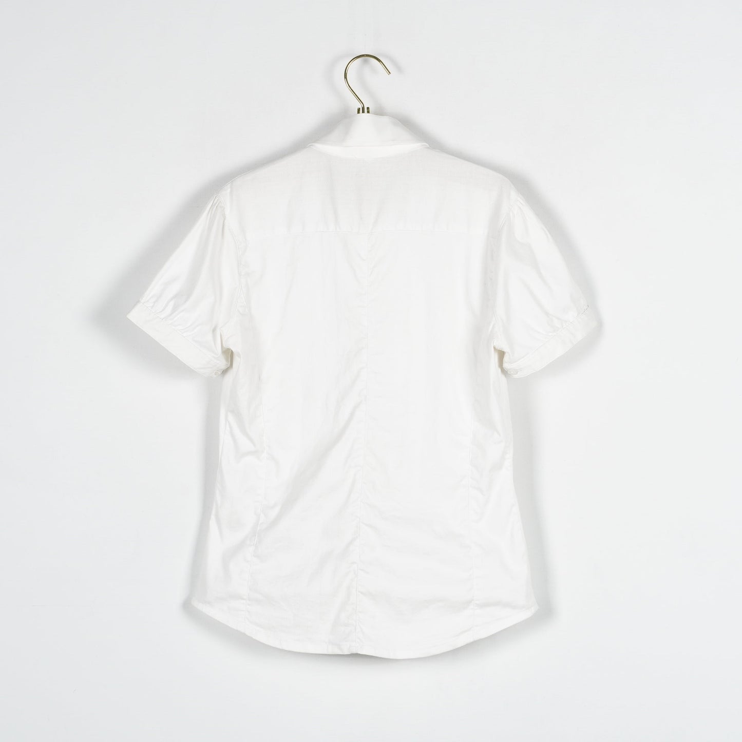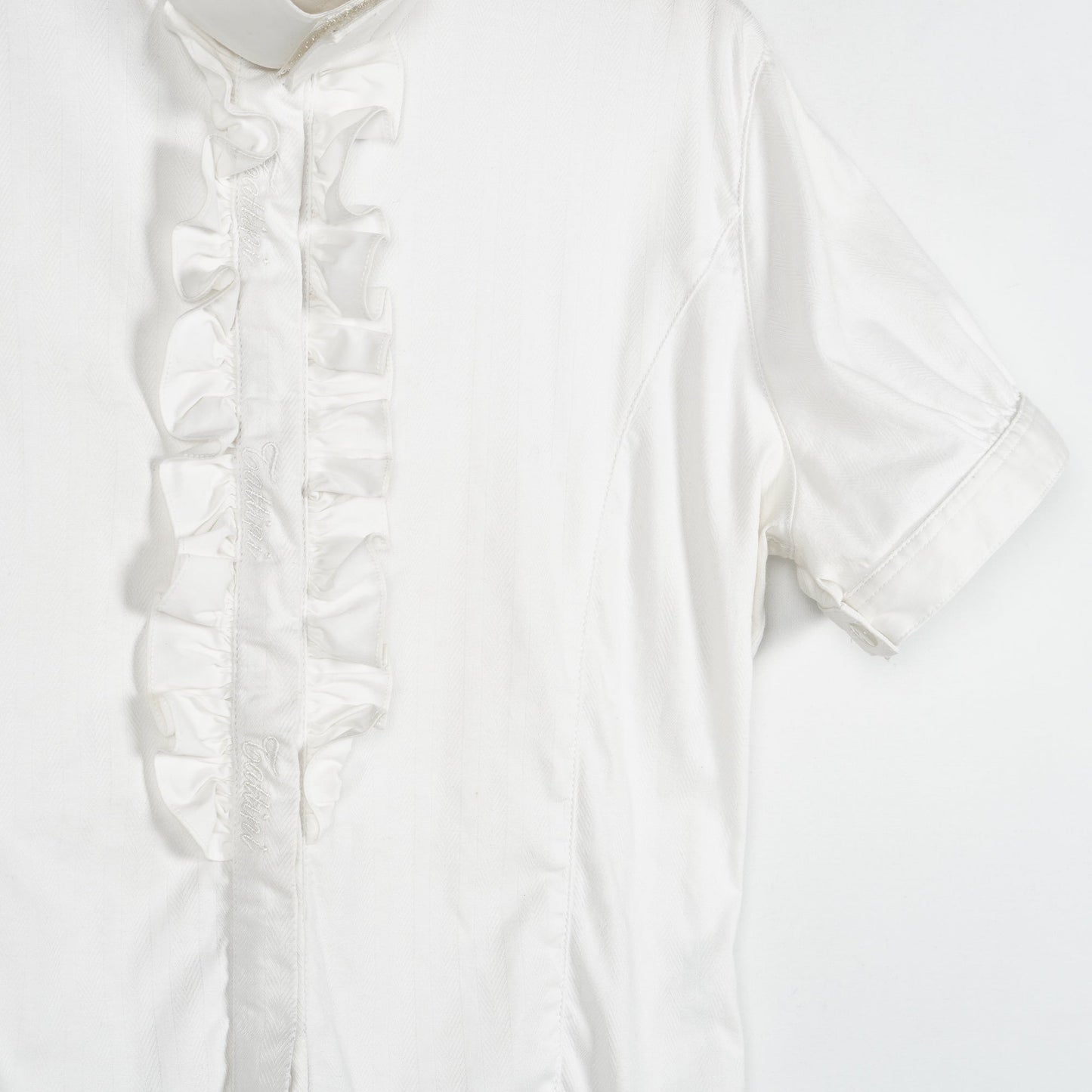 Snygg tävlingstopp i vit bomull från Tattini. Toppen har avtagbar krage och är i ett använt men mycket bra skick.