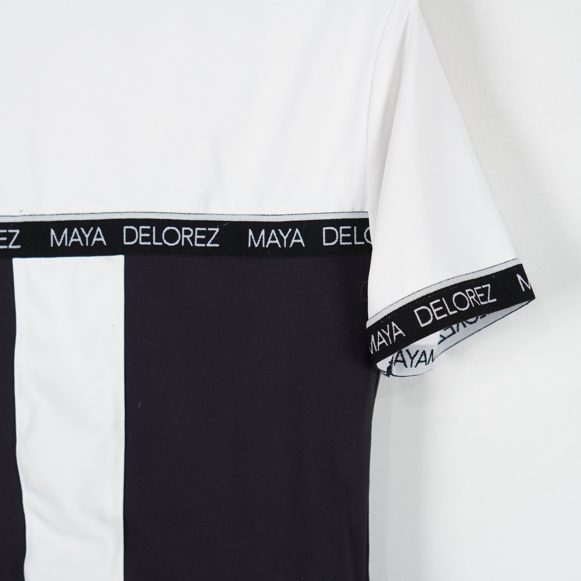 Supersnygg tävlingstopp "Competition Sport Shirt" i vitt och svart med knapp vid halsen från Maya Delorez.