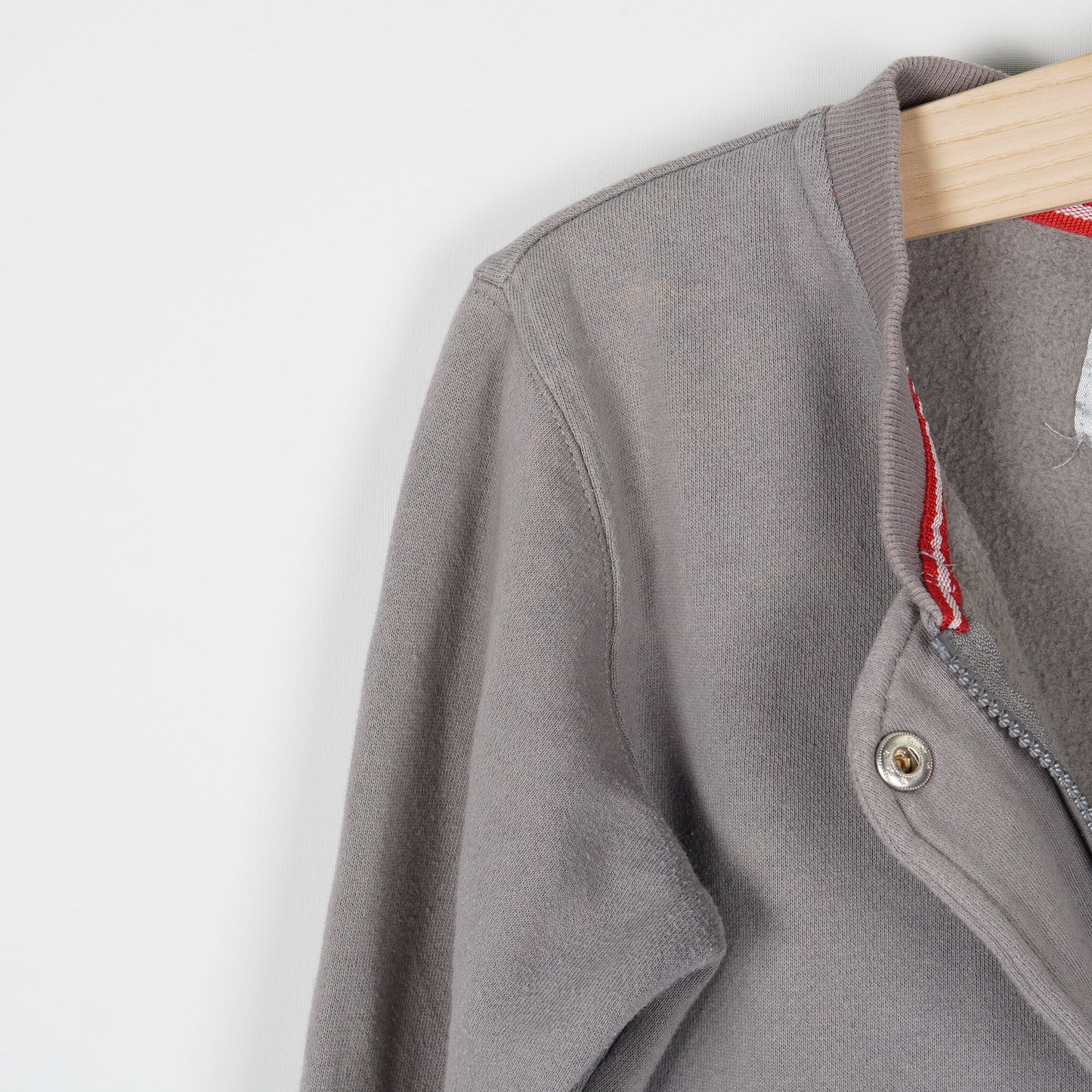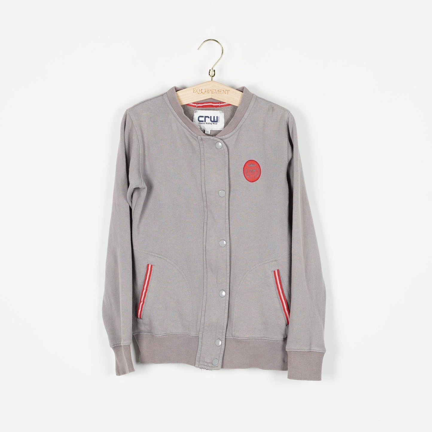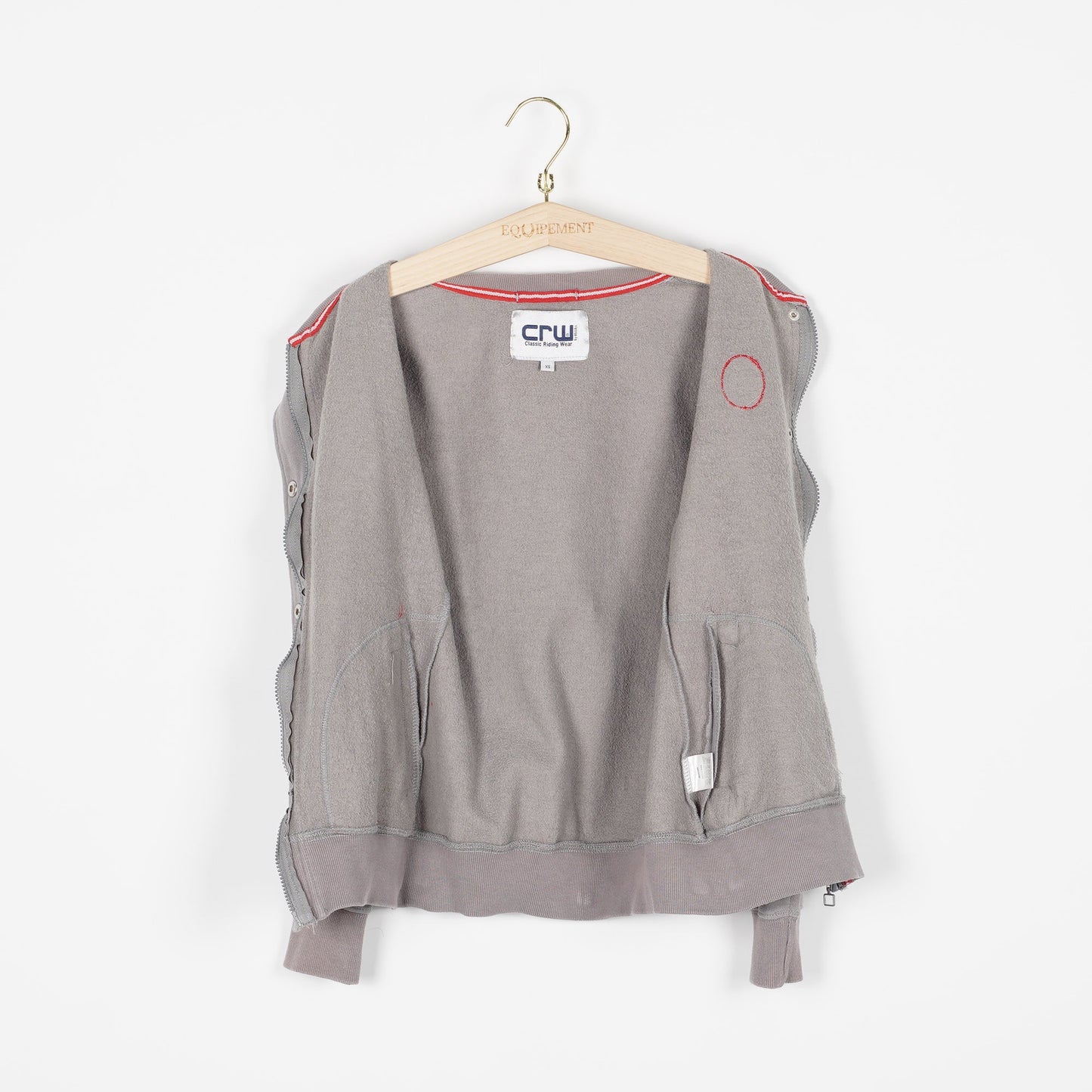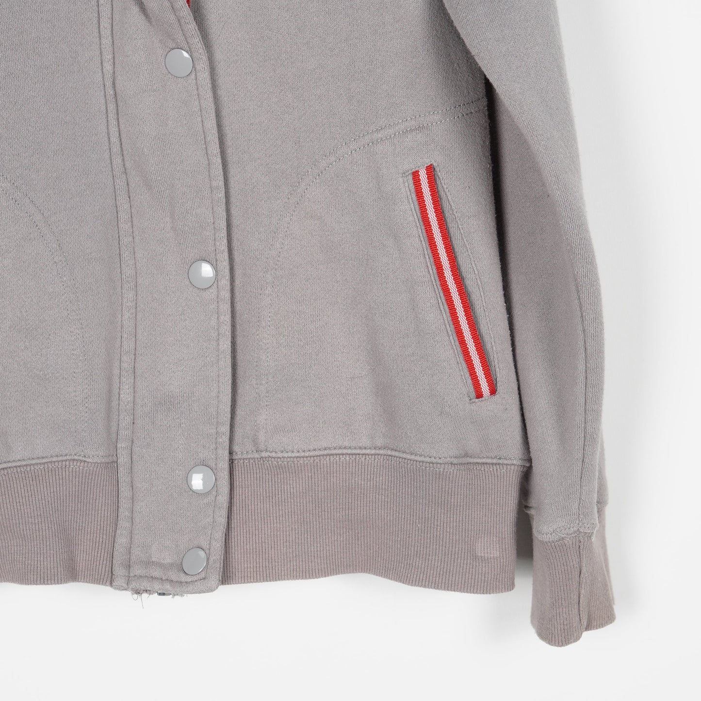 Grå collegetröja från CRW med rosa detaljer. Stängs med dragkedja och knappar. Tröjan är välanvänd och har en missfärgning på ena axeln. I övrigt fullt funktionell.