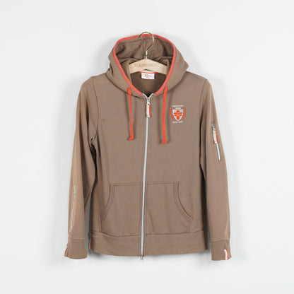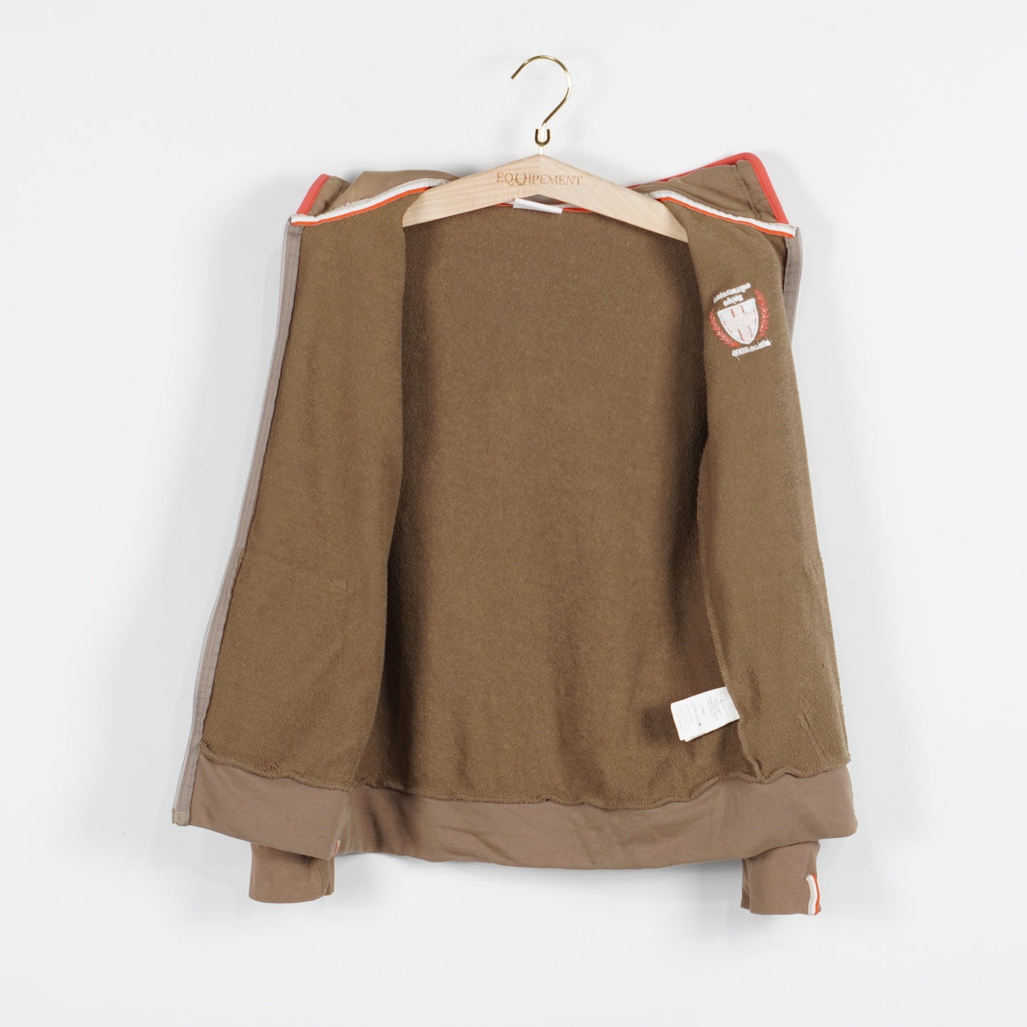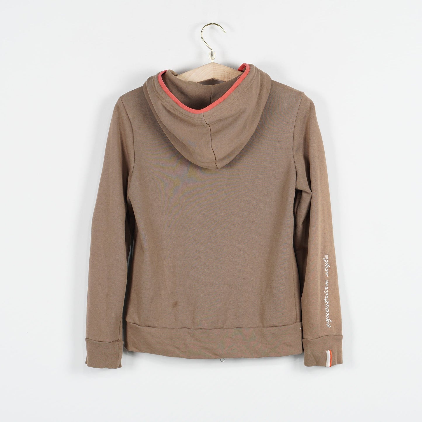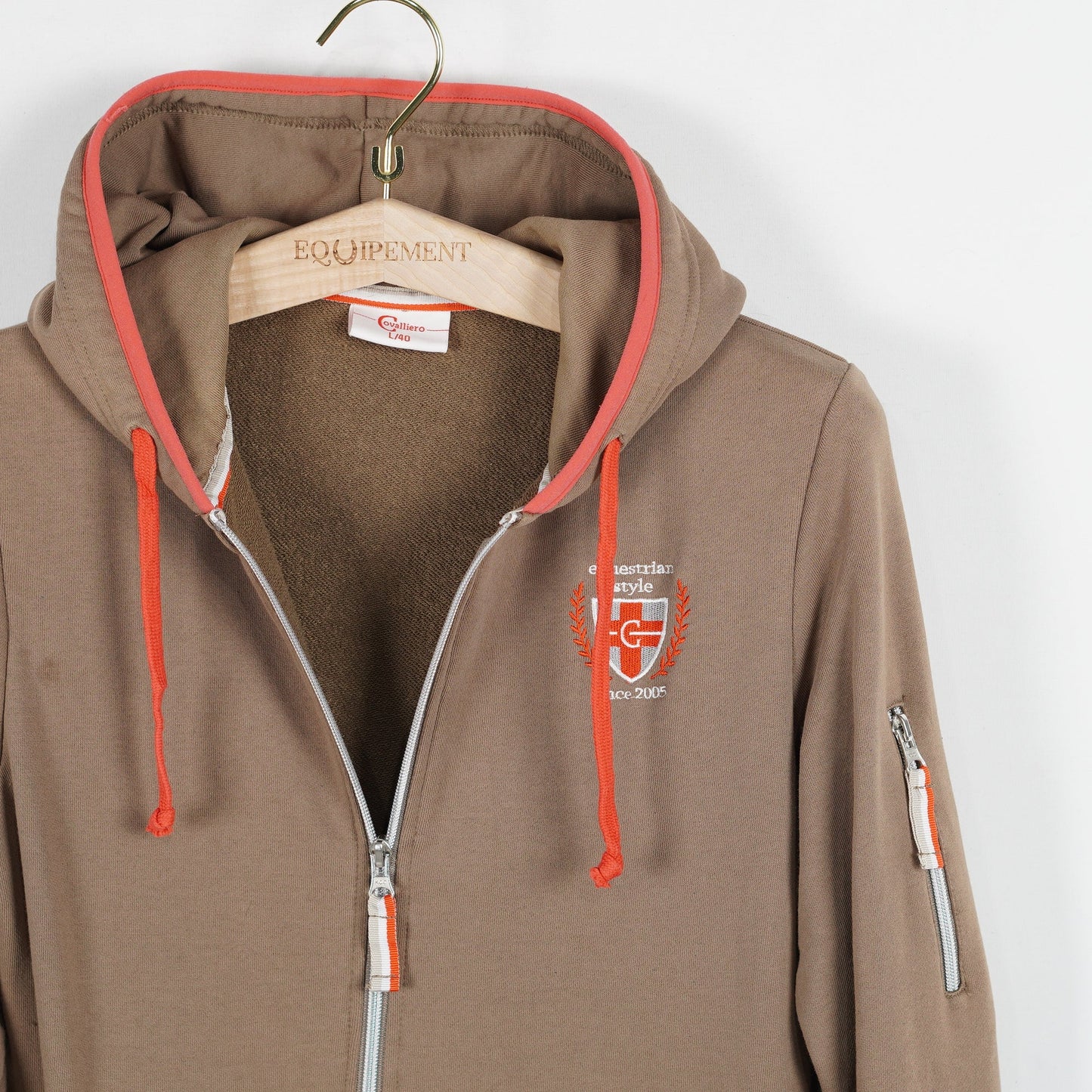 Zip-tröja med luva från Covalliero. Tröjan är i ett tydligt använt skick och har tappat sin form något samt blivit blekt. Men hel och funktionell. (Färgen är mer grågrön än vad som visas på bilden).