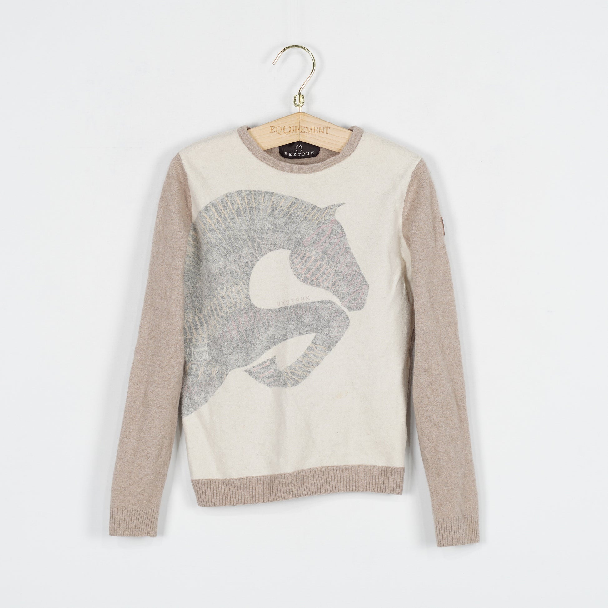 Tunn, men supermysig stickad tröja i lanaull (merino) och kashmir från Vestrum, modell Fernie. Perfekt för höstens kalla dagar! Tröjan är märkt med "S", men storleken jämförs med barn 140/146. Är lite blek i färgerna.