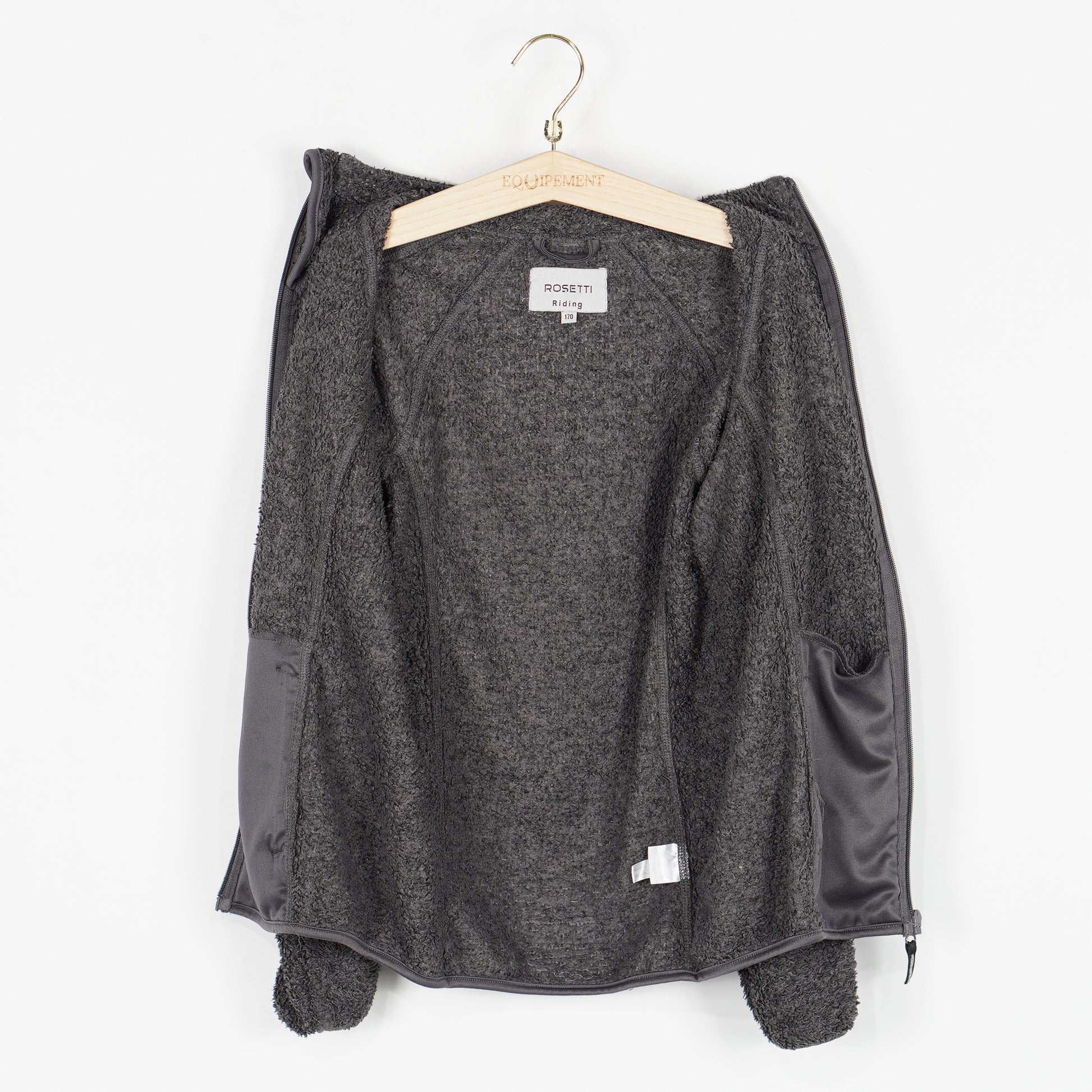 Grå teddytröja med dragkedja och fickor från Rosetti Riding. Reflexen bak har spruckit lite, se bild.