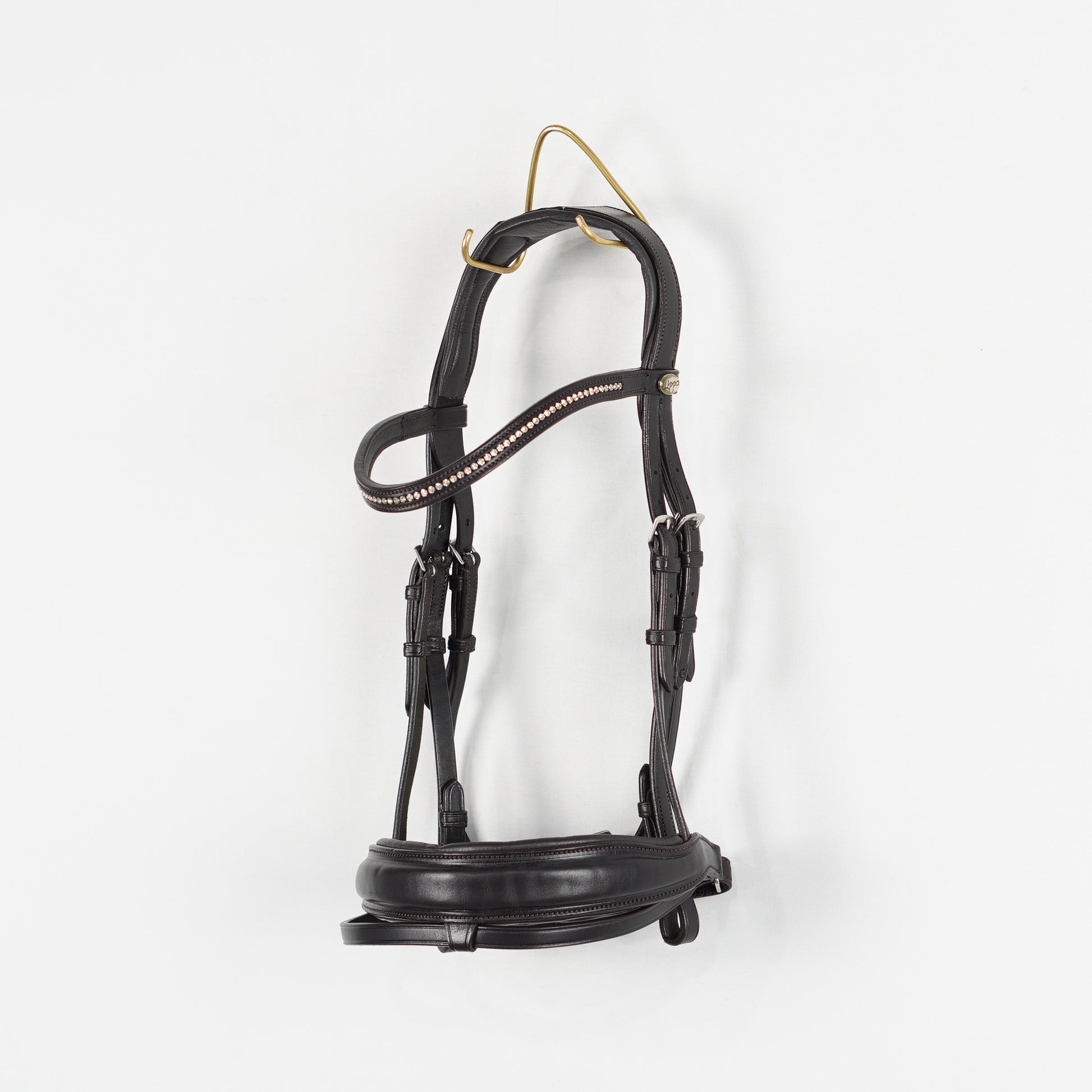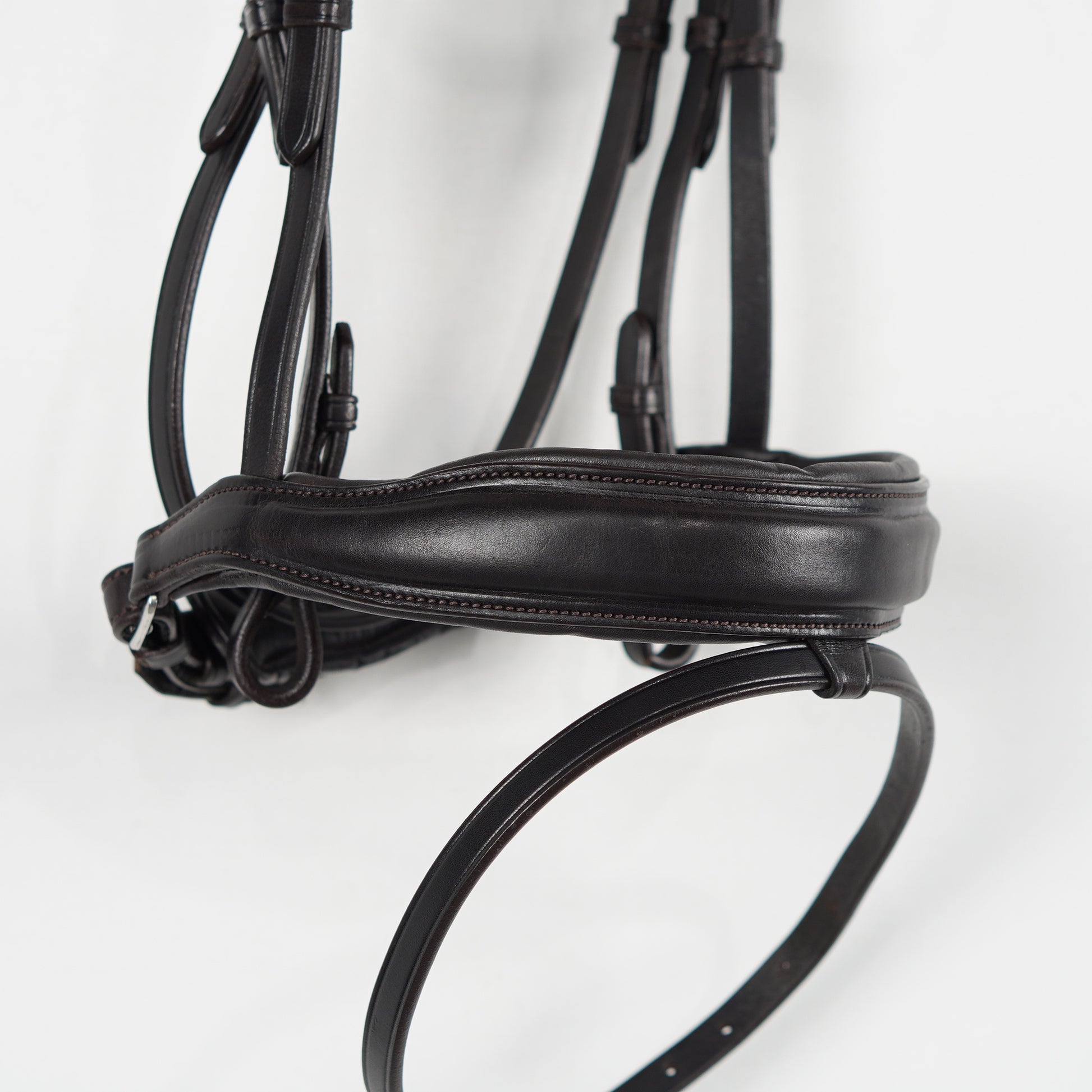 Fint dressyrträns från Lippo, modell Integro i mörkbrun färg med elegant pannband som har små vita stenar. Nosgrimman är anatomiskt formad med mjuk vaddering, även nackstycket.