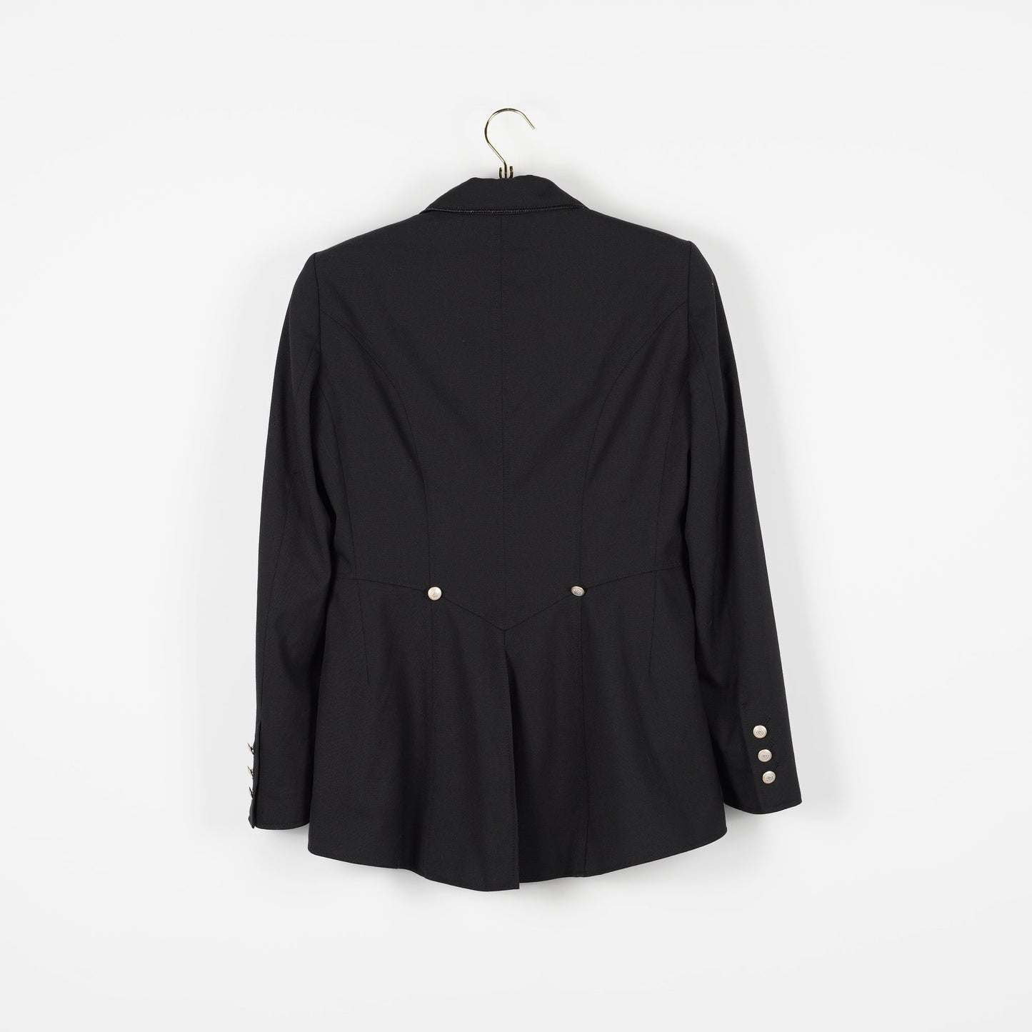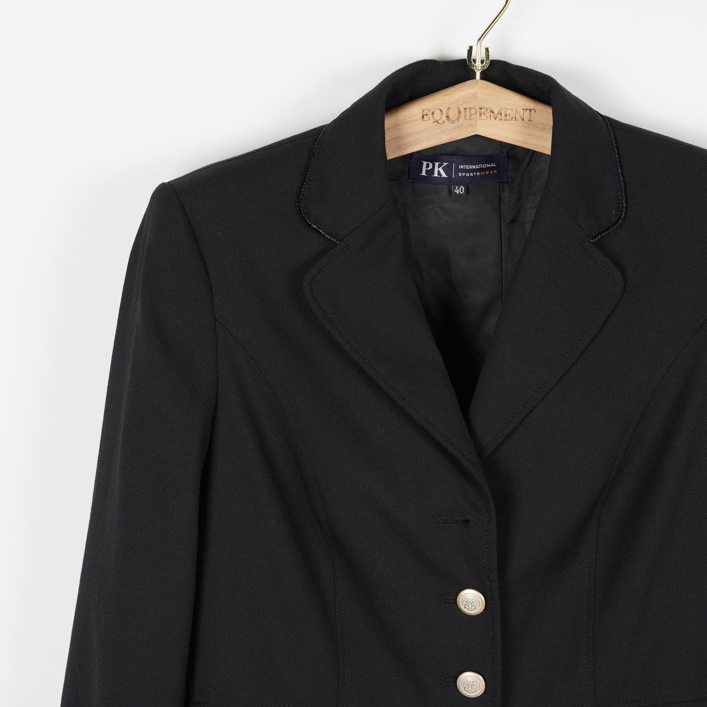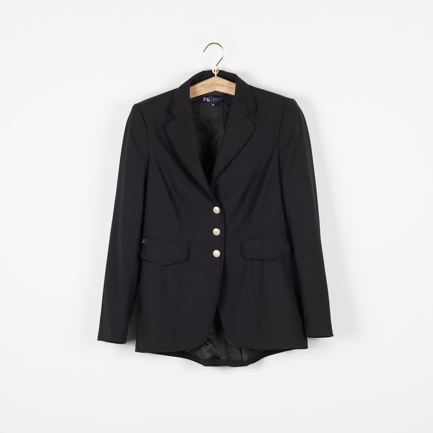 Svart tävlingskavaj från PK med knappar fram och fin detalj på kanten av fickorna och kragen. Tyvärr saknas den 4e knappen, se bild.