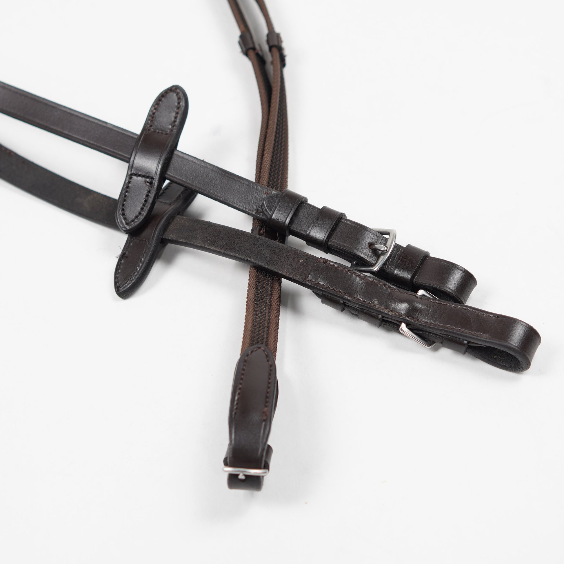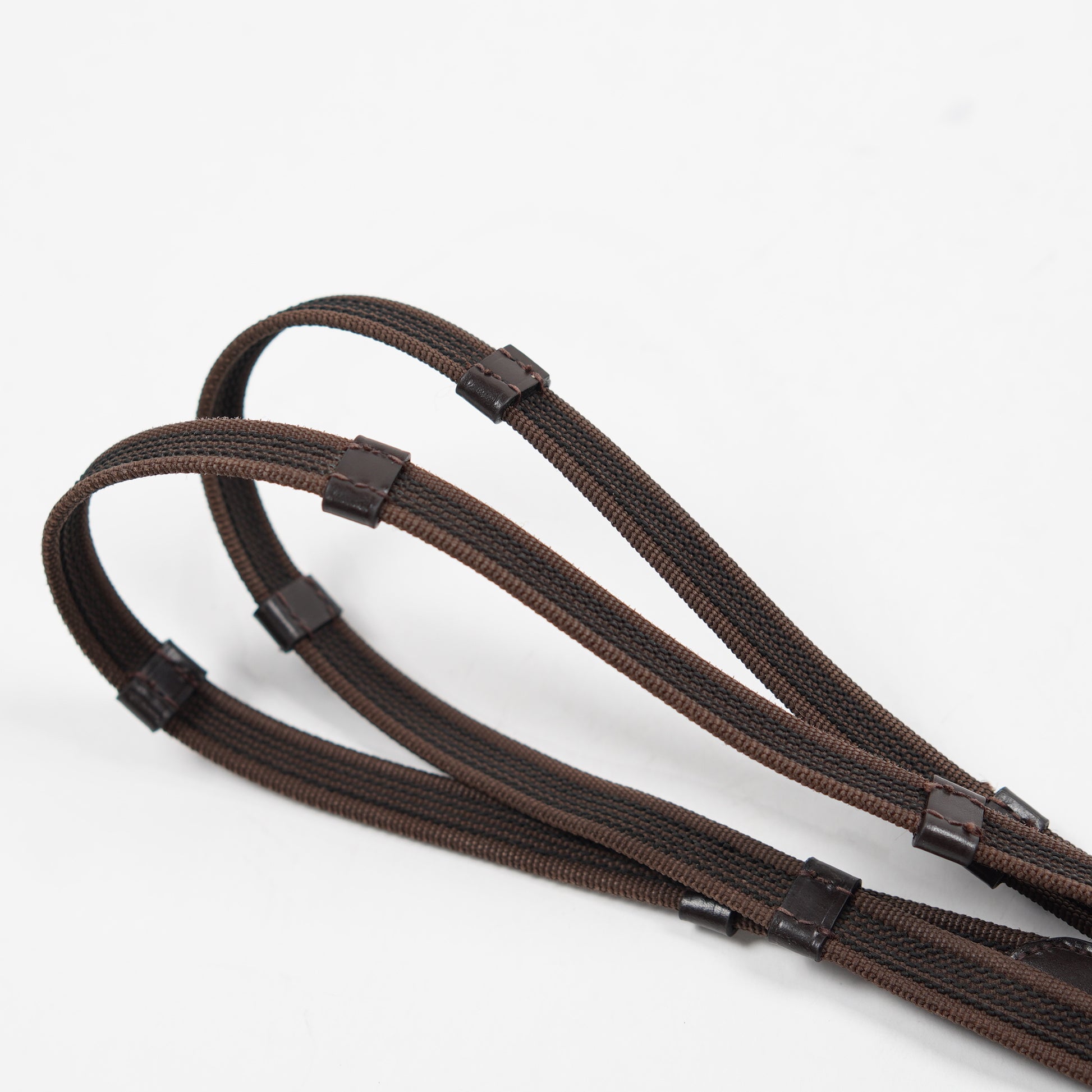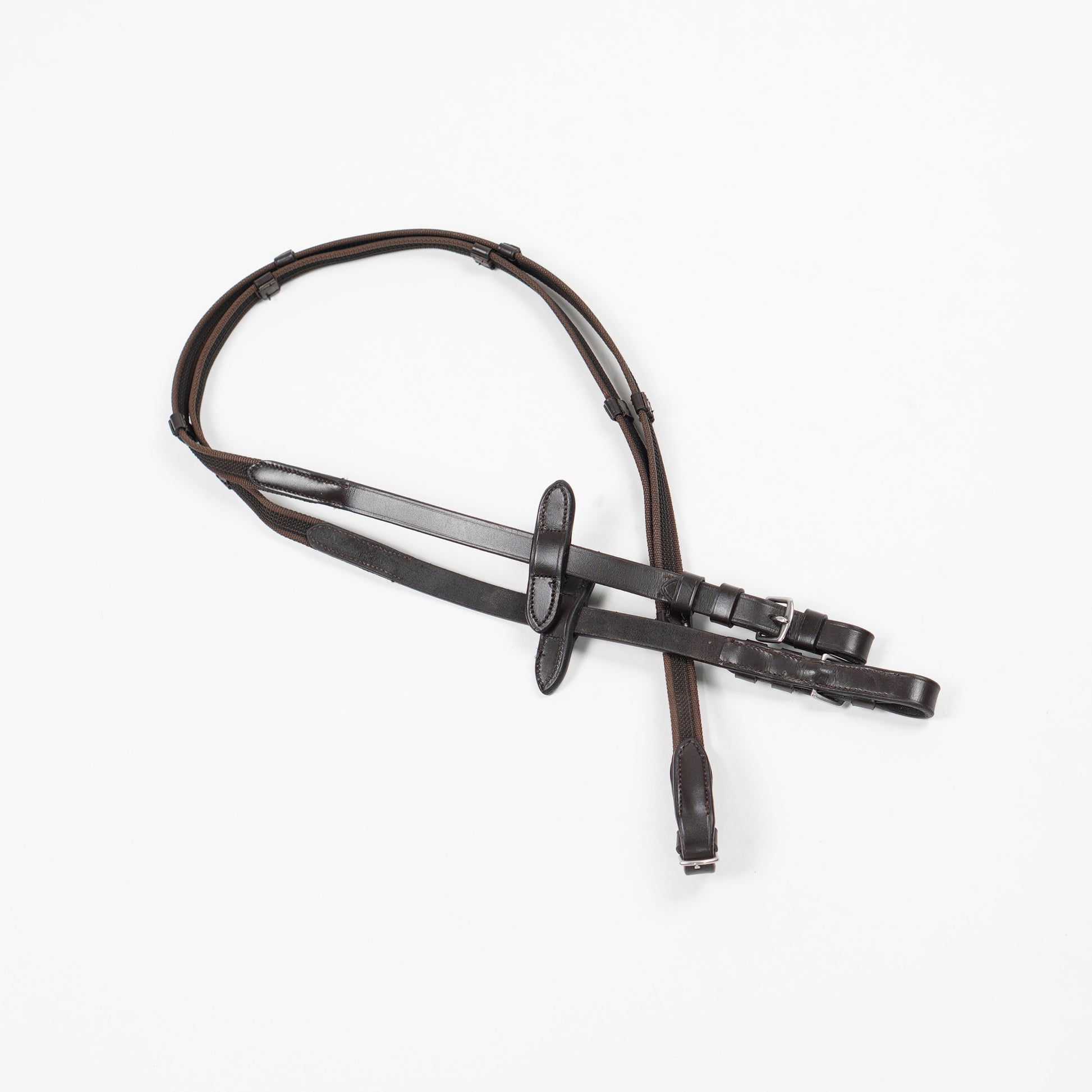 Bruna tyglar med gummiväv och läderändar med martingalstopp.