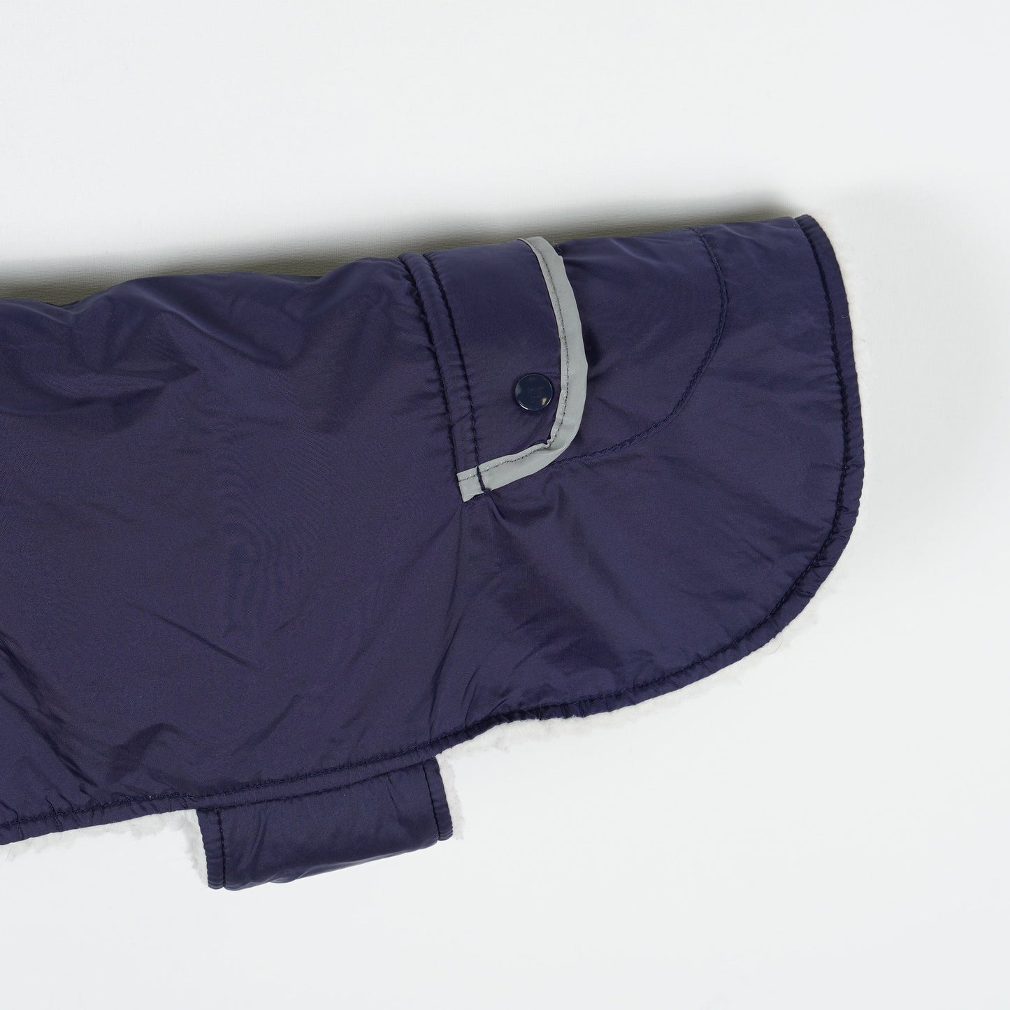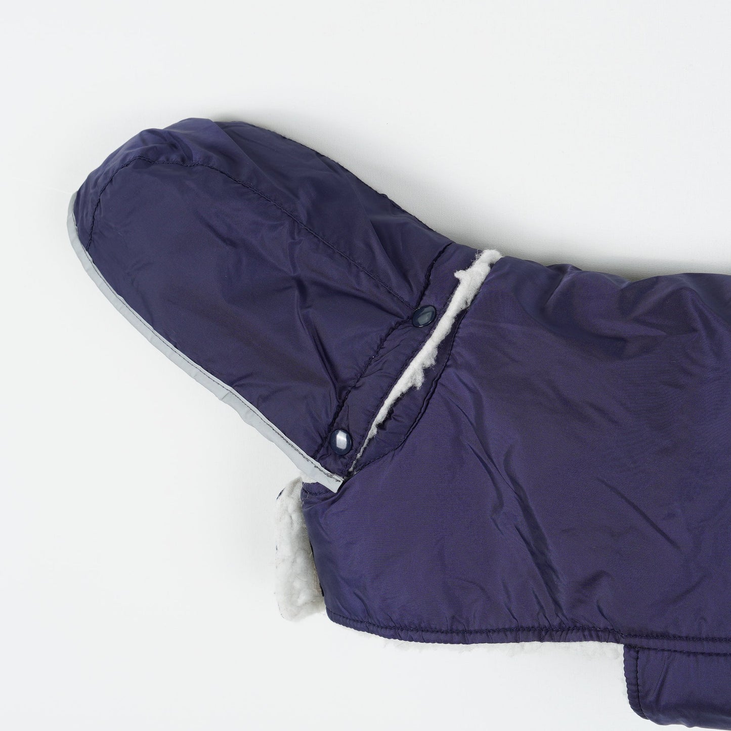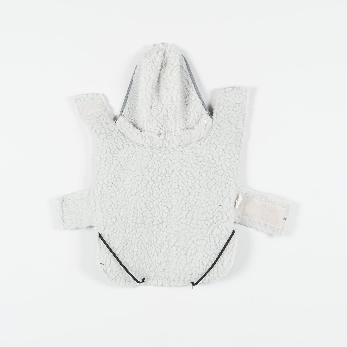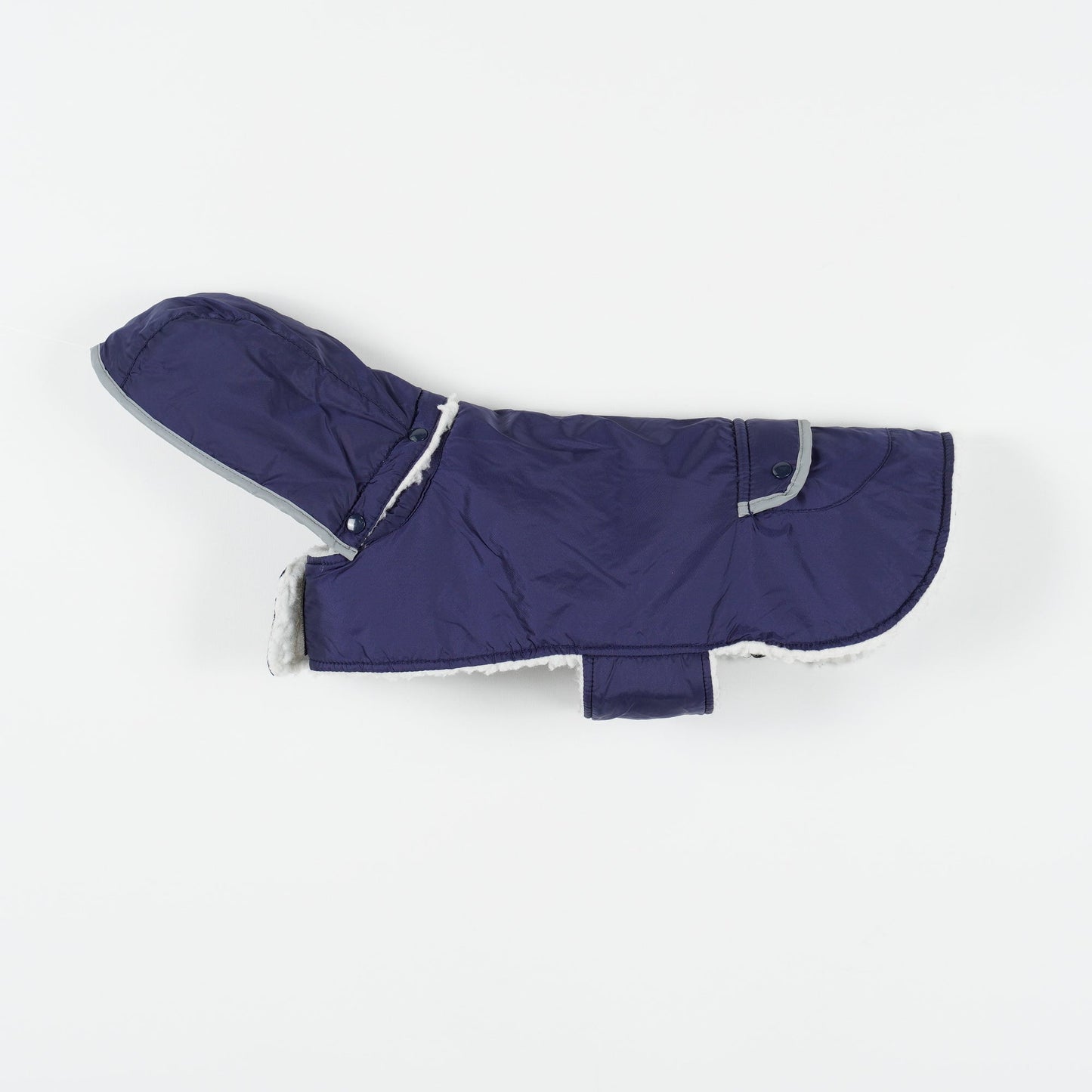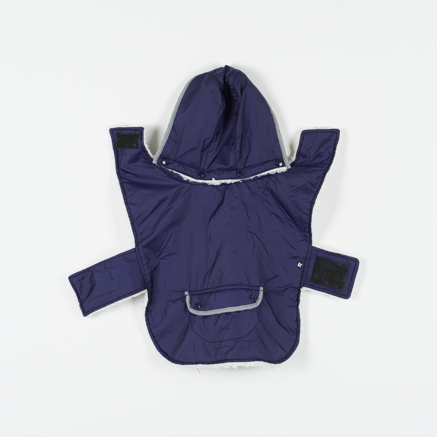 Ett täcke till en söt liten vovve, med avtagbar luva, teddyfoder och reflexdetaljer. Täcket har ingen storleksmärkning men mäter 35 cm över ryggen. I ett använt men bra skick.
