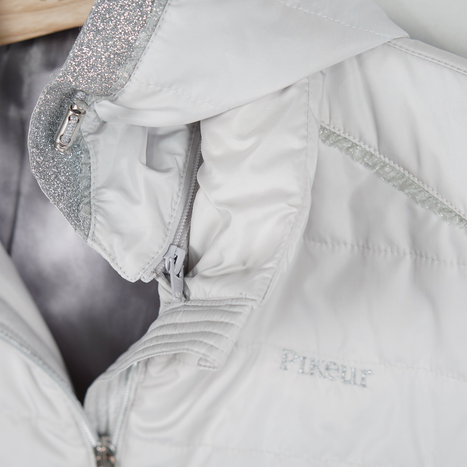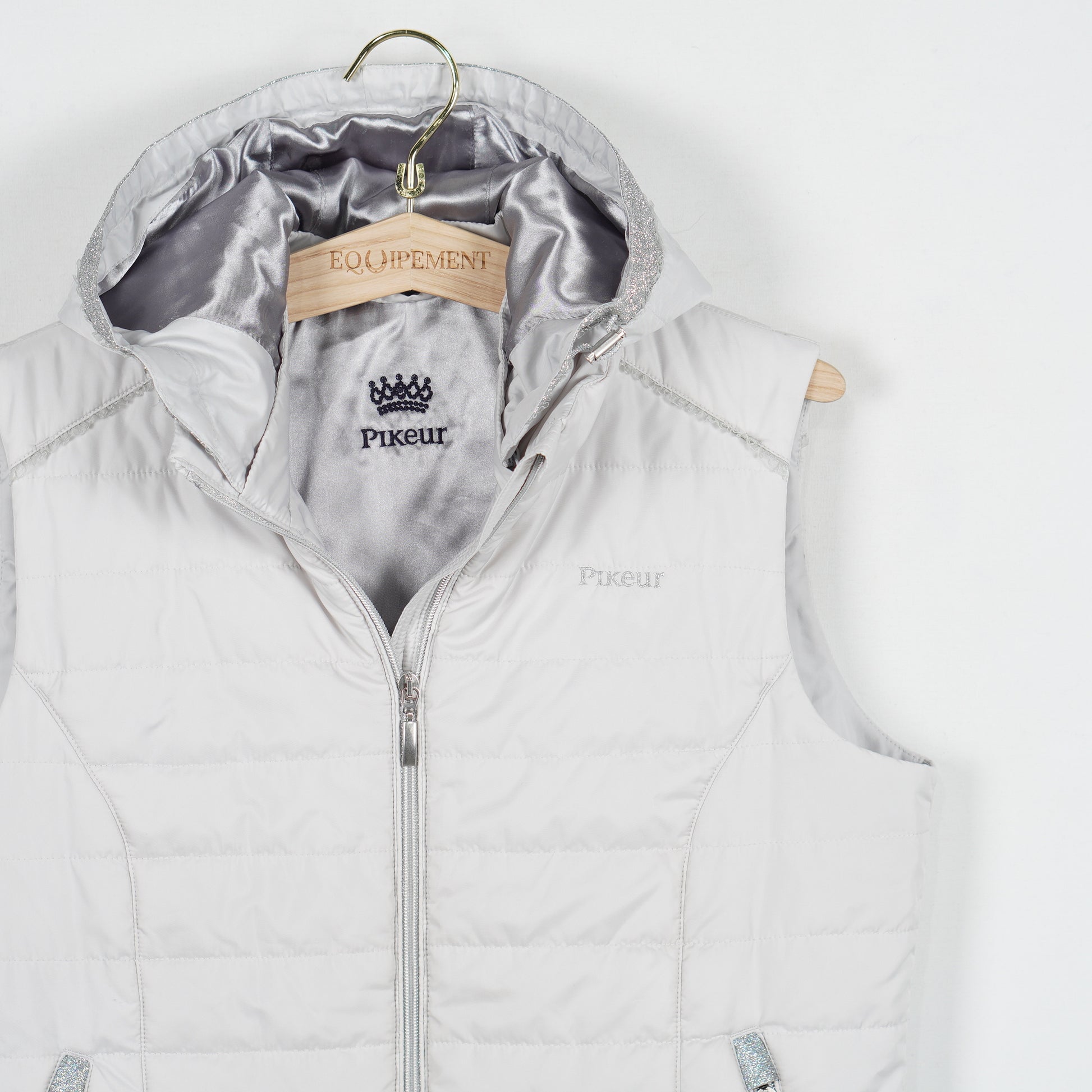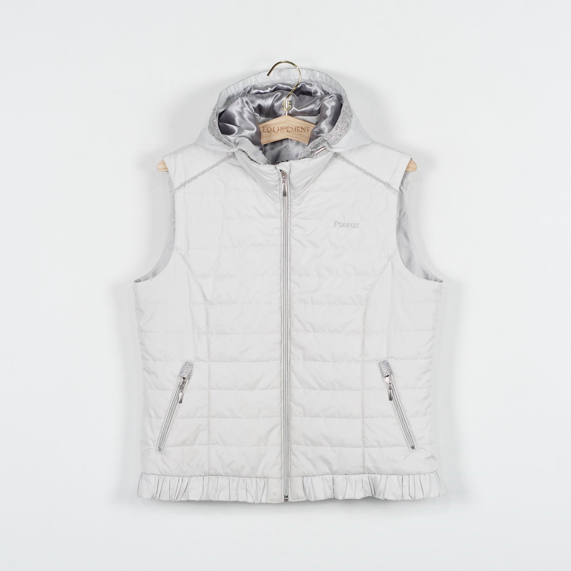 Ljusgrå fodrad väst "Uma" med glittriga detaljer och avtagbar luva från Pikeur.