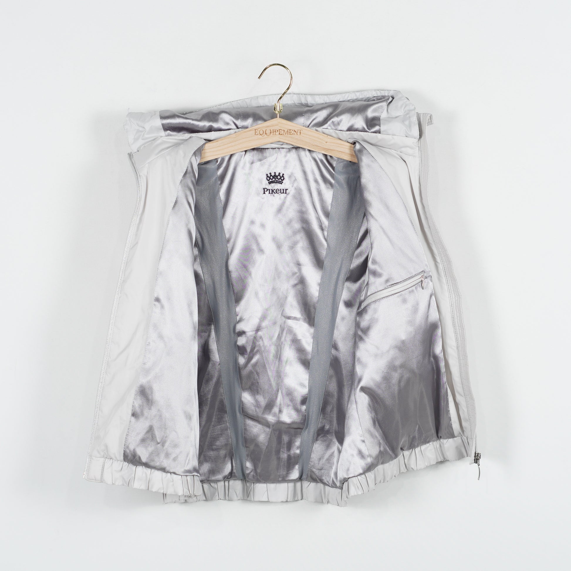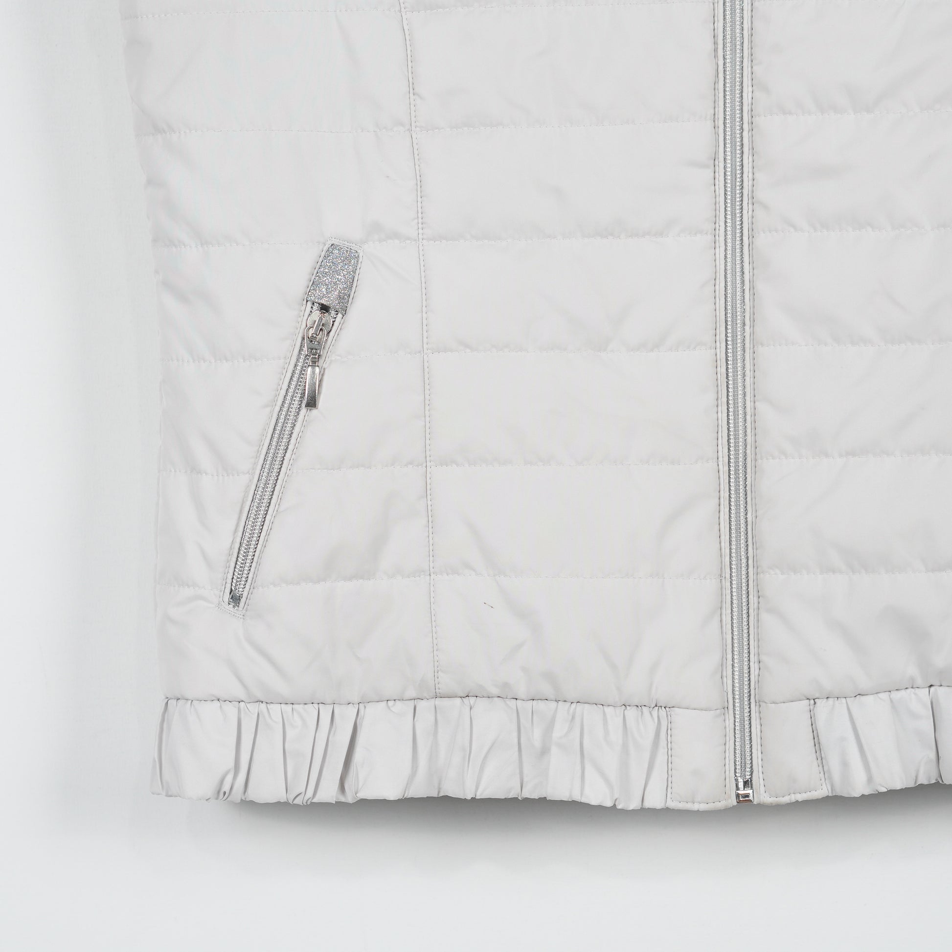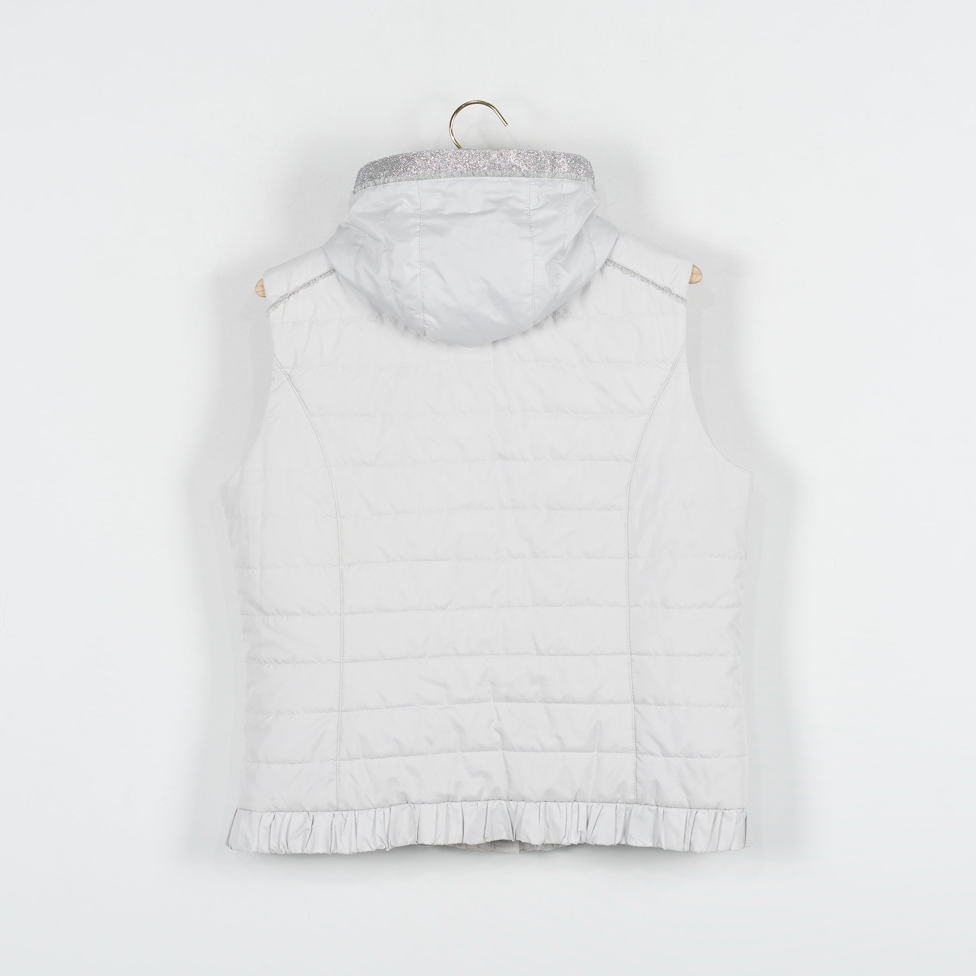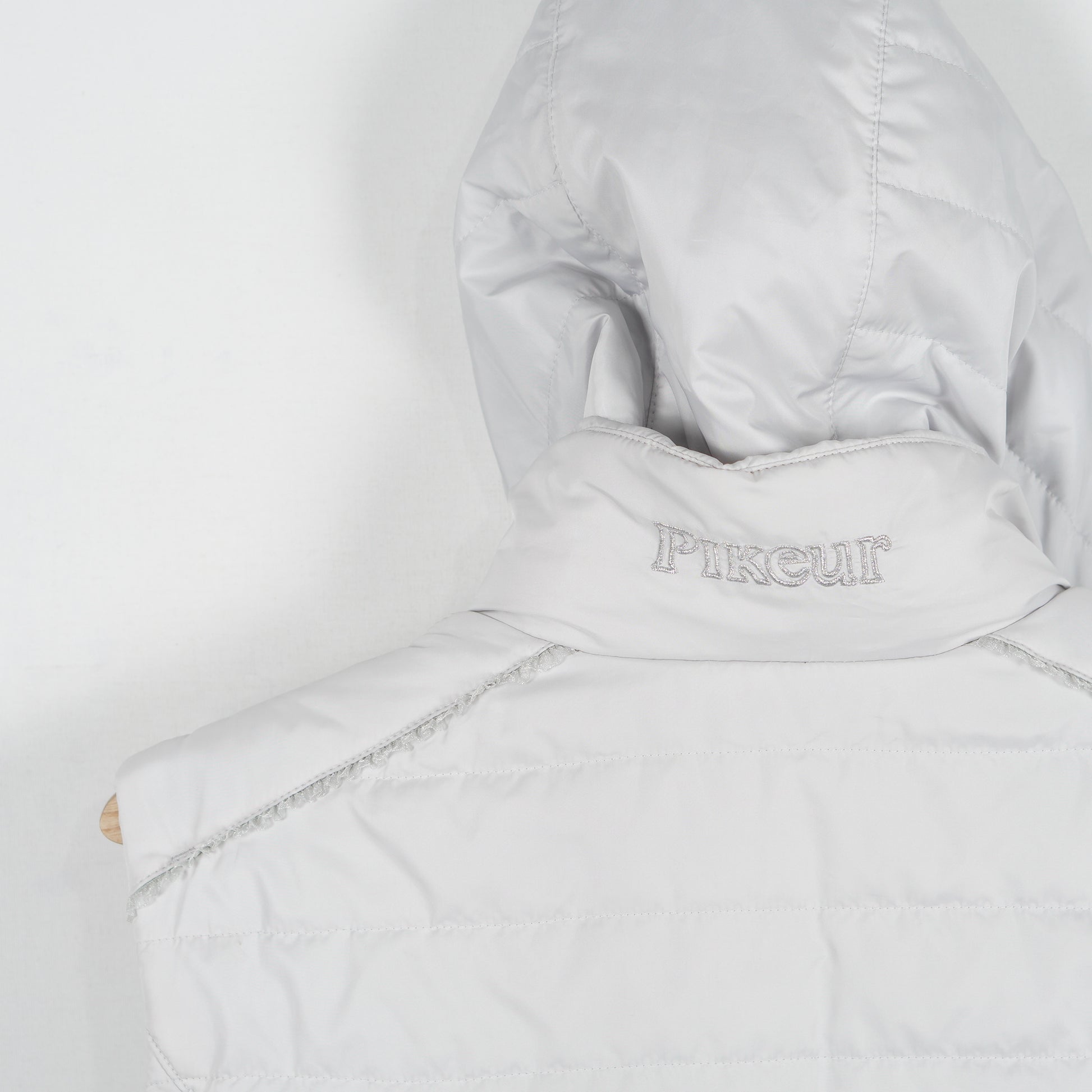 Ljusgrå fodrad väst "Uma" med glittriga detaljer och avtagbar luva från Pikeur.