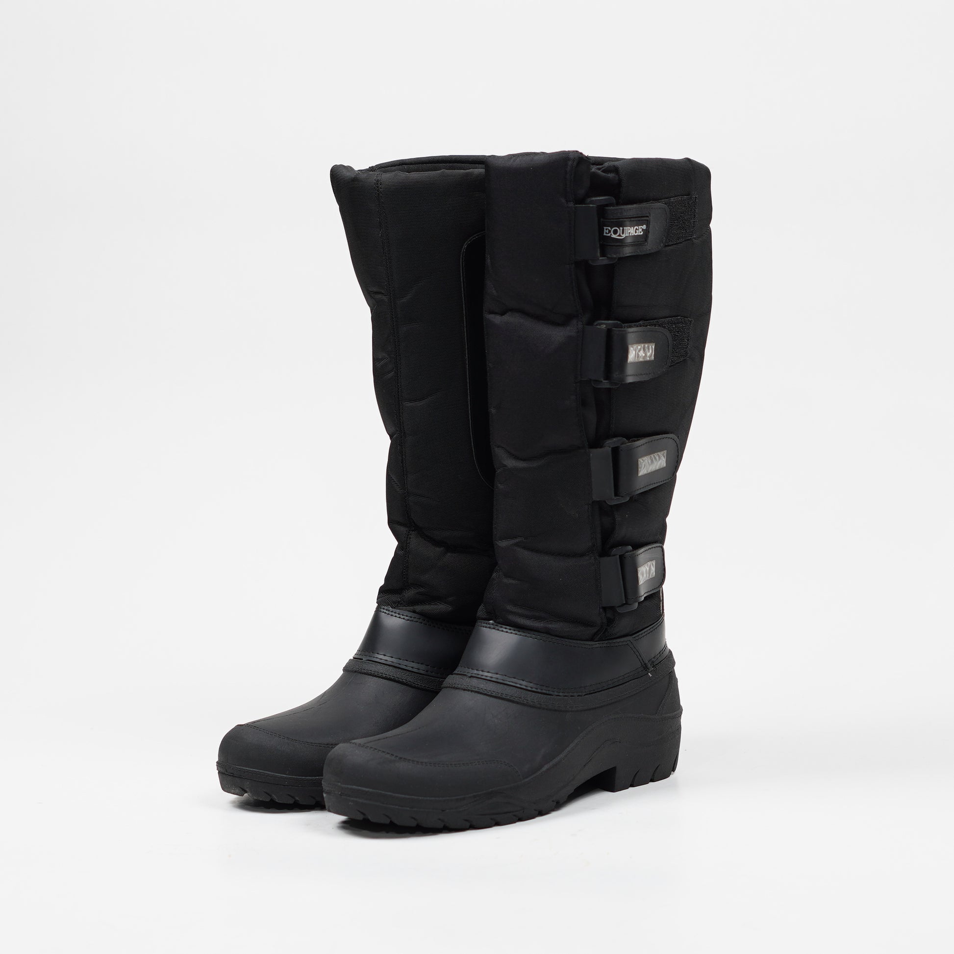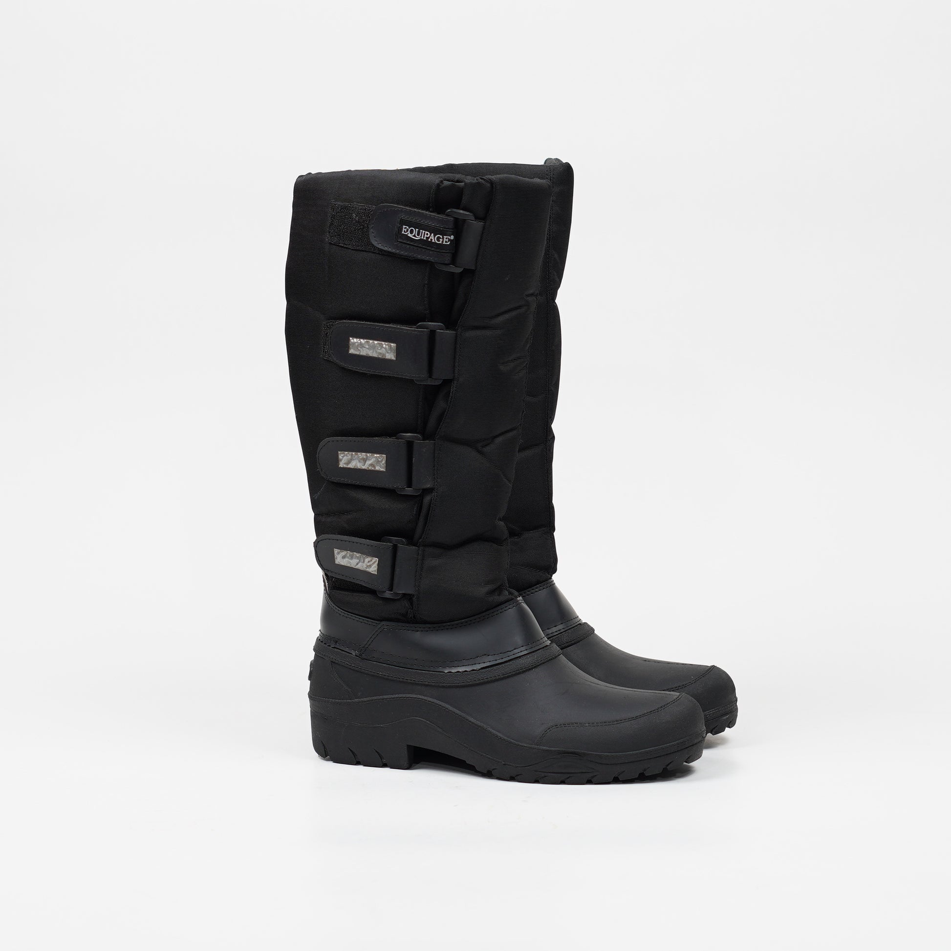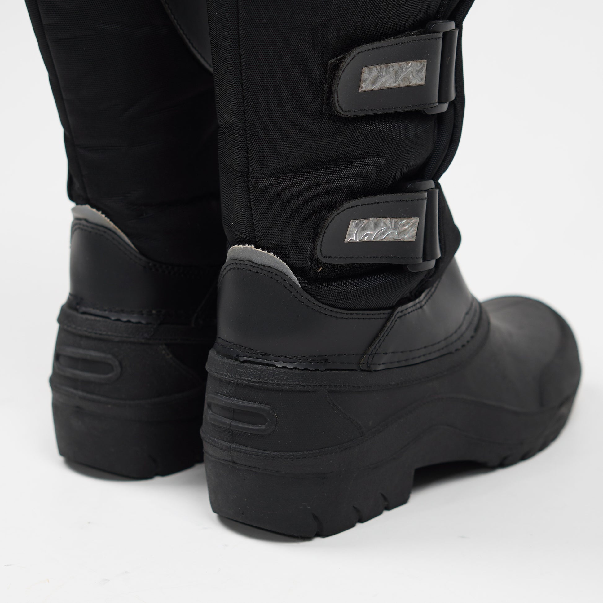 Svarta fodrade ridstövlar med kardborrespännen runt vaden och en fotdel i helgjuten gummi från Equipage.