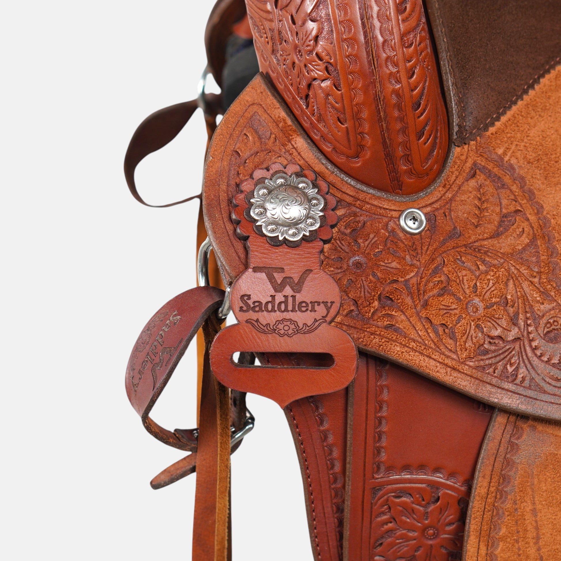 Fin westernsadel från TW Saddlery i ljust läder med fina dekorationer och mocka på sitsen. Sadeln har utbytbara paneler på båda sidor för att få bästa möjliga passform och komfort för hästen.